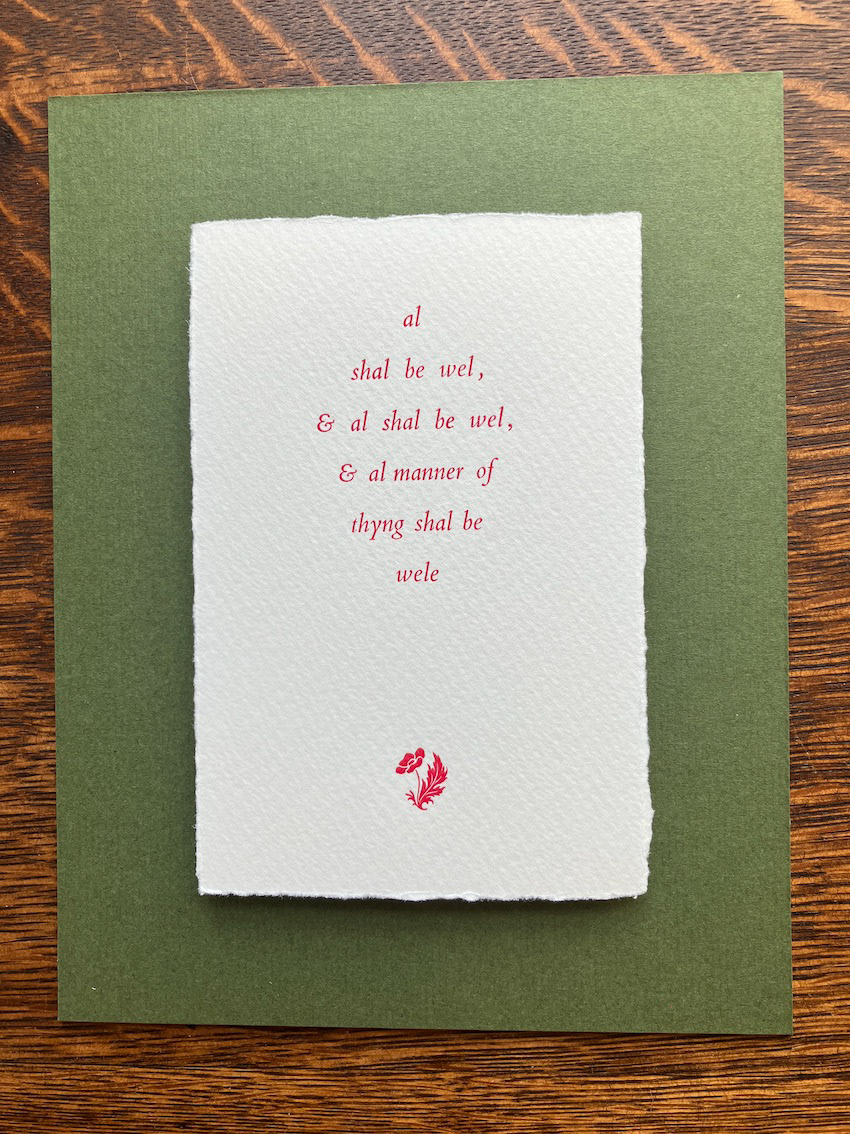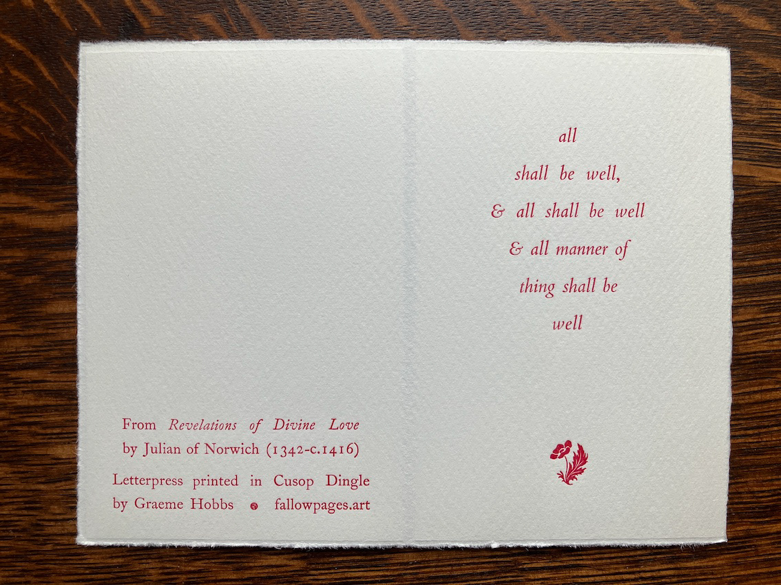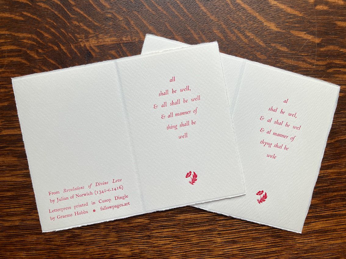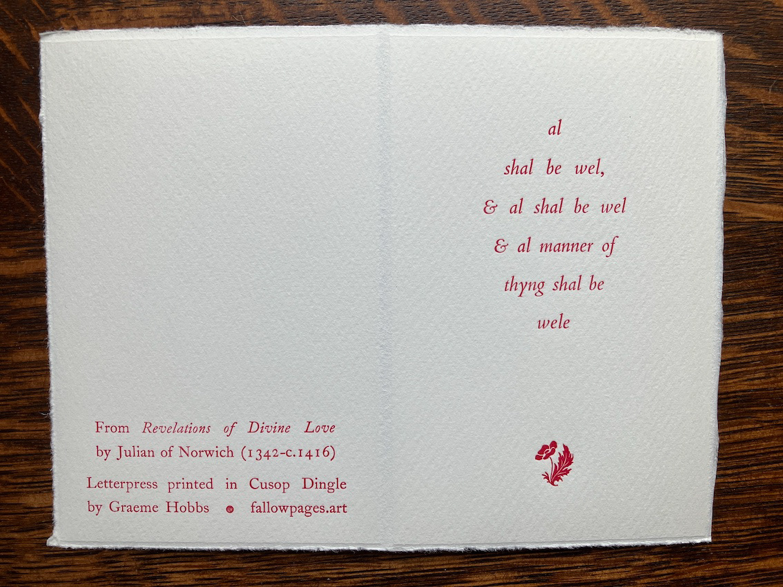From Revelations of Divine Love, by Julian, Anchoress at Norwich. Printed in both the original and also modernised spelling. The words need no ornament so I have tried to print them as if they are their own jewel.