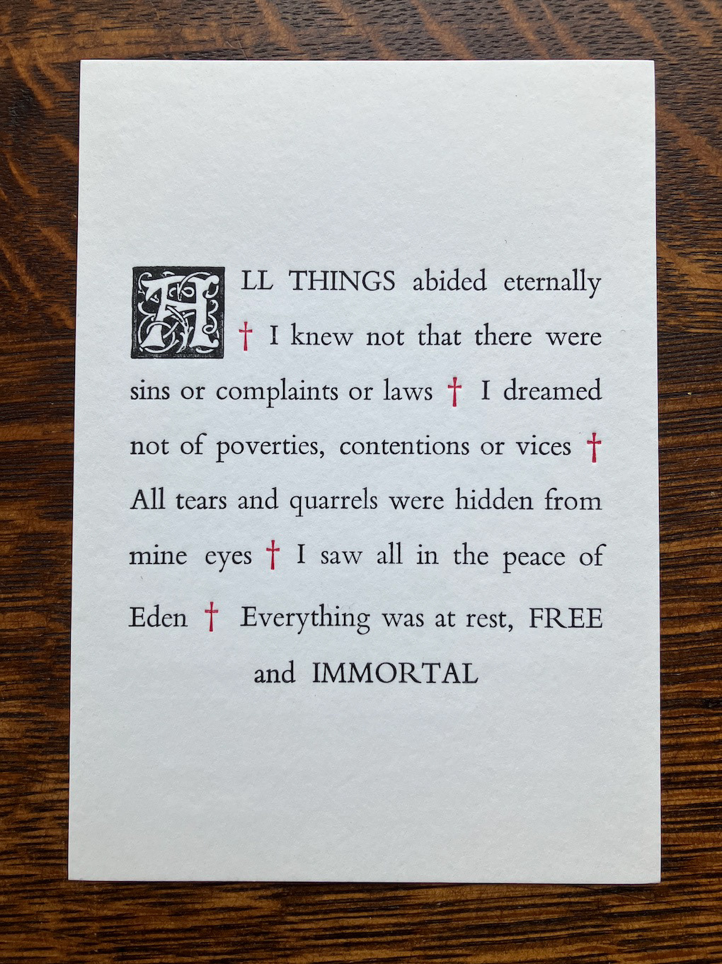 The words are from Thomas Traherne, by way of Gerald Finzi’s ‘Dies Natalis’ (1938-39). I printed them first and mainly because they are calm and beautiful. They are also a world away from the affronts to sense and human dignity with which we are daily assailed.