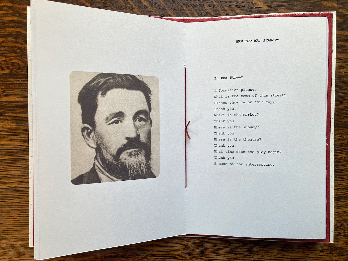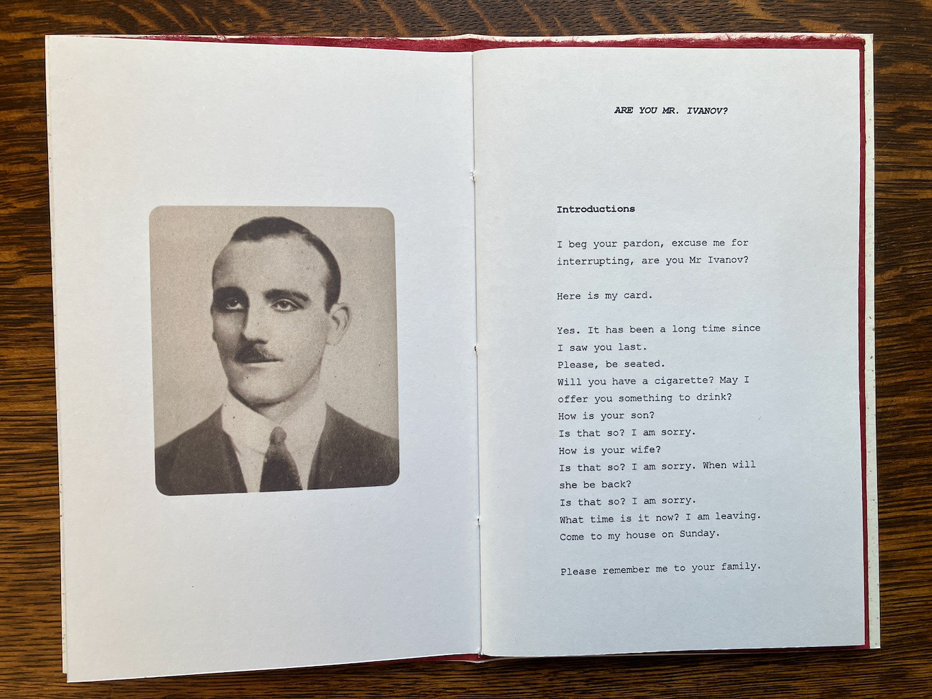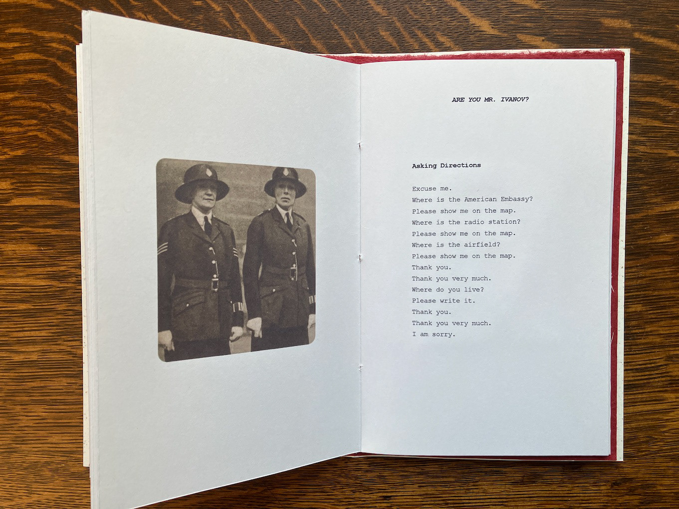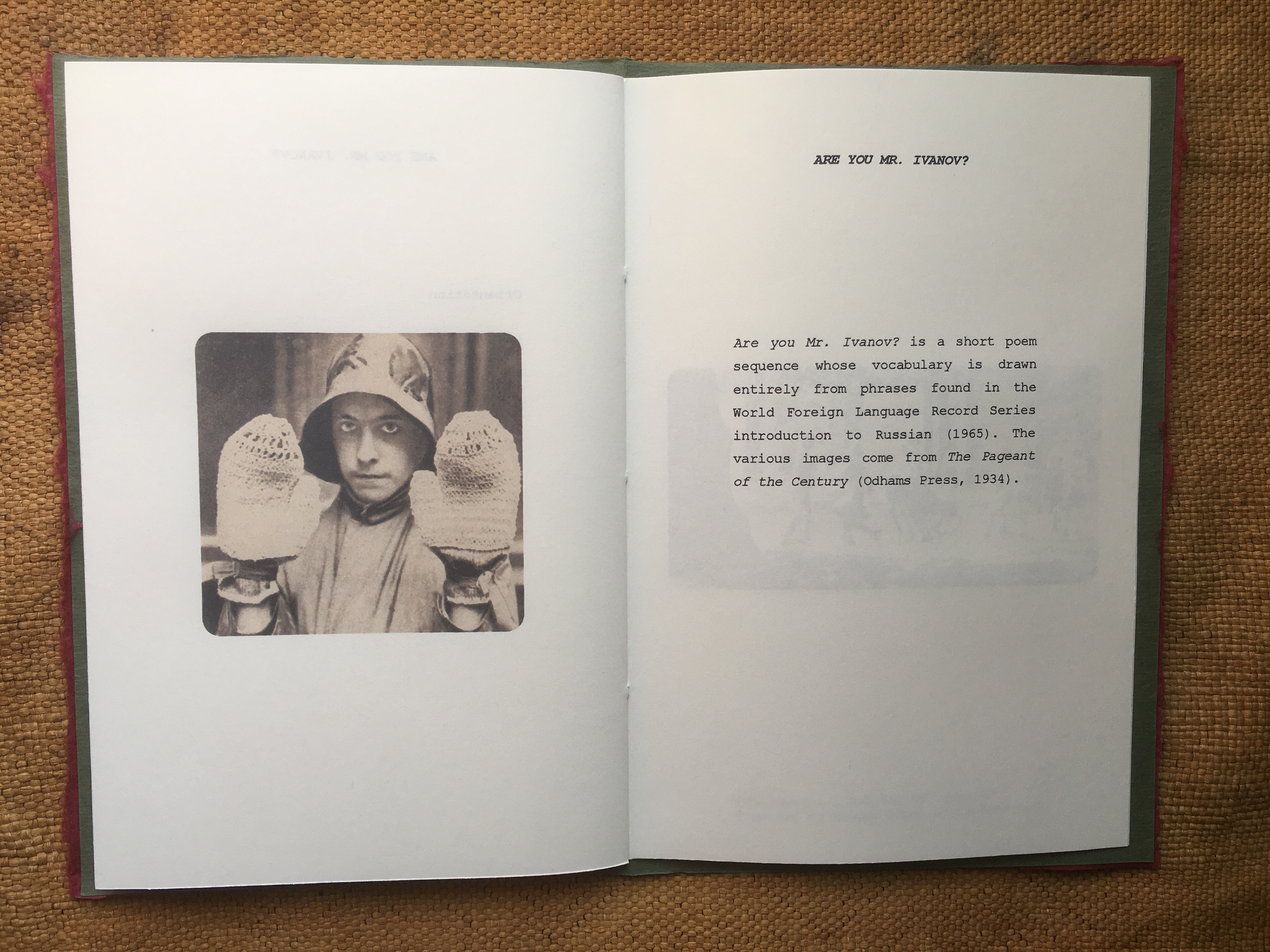 A short sequence whose vocabulary is entirely drawn from phrases found in the World Foreign Language Record Series’ Introduction to Russia (1965). Notable about this one is how the most anodyne phrases, when reordered, can be used to construct a narrative with connotations of disruptive radical action, though the images – drawn from The Pageant of the Century (Odhams Press, 1934) – give a nod towards the anarchism of a century past rather than the outrages of our own. I printed this first in 2019 (the version with green covers fringed red), then slightly reset it and reprinted in 2023 (white covers with red endpapers).