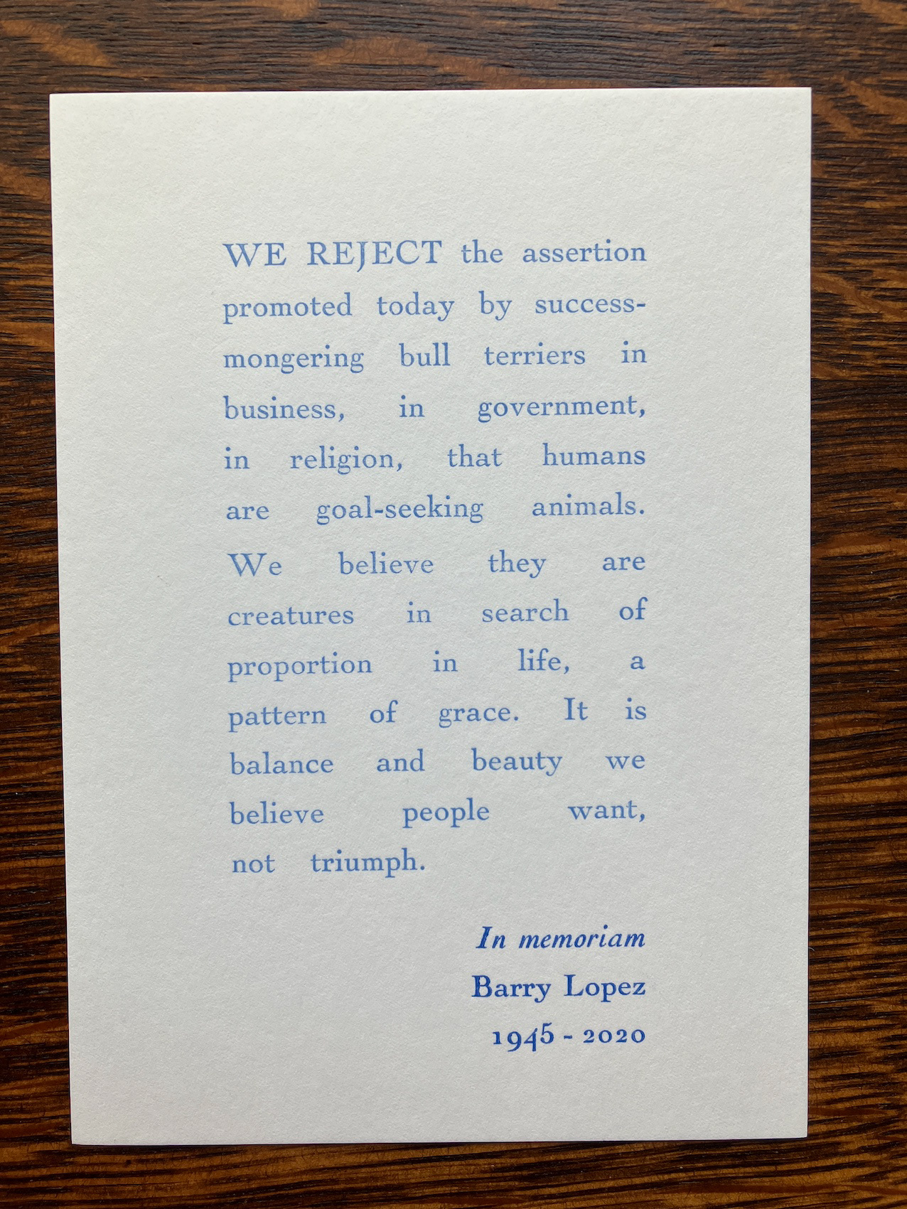 In memoriam the American writer Barry Lopez, 1945-2020. The printed quote is from his book, Resistance (2004). ‘We reject the assertion, promoted today by success-mongering bull terriers in business, in government, in religion, that humans are goal-seeking animals. We believe they are creatures in search of proportion in life, a pattern of grace. It is balance and beauty we believe people want, not triumph.’  Indeed. Rest in Peace.
