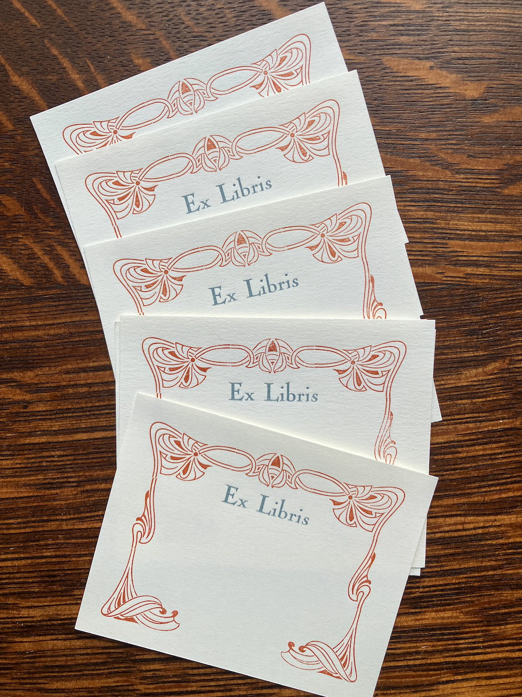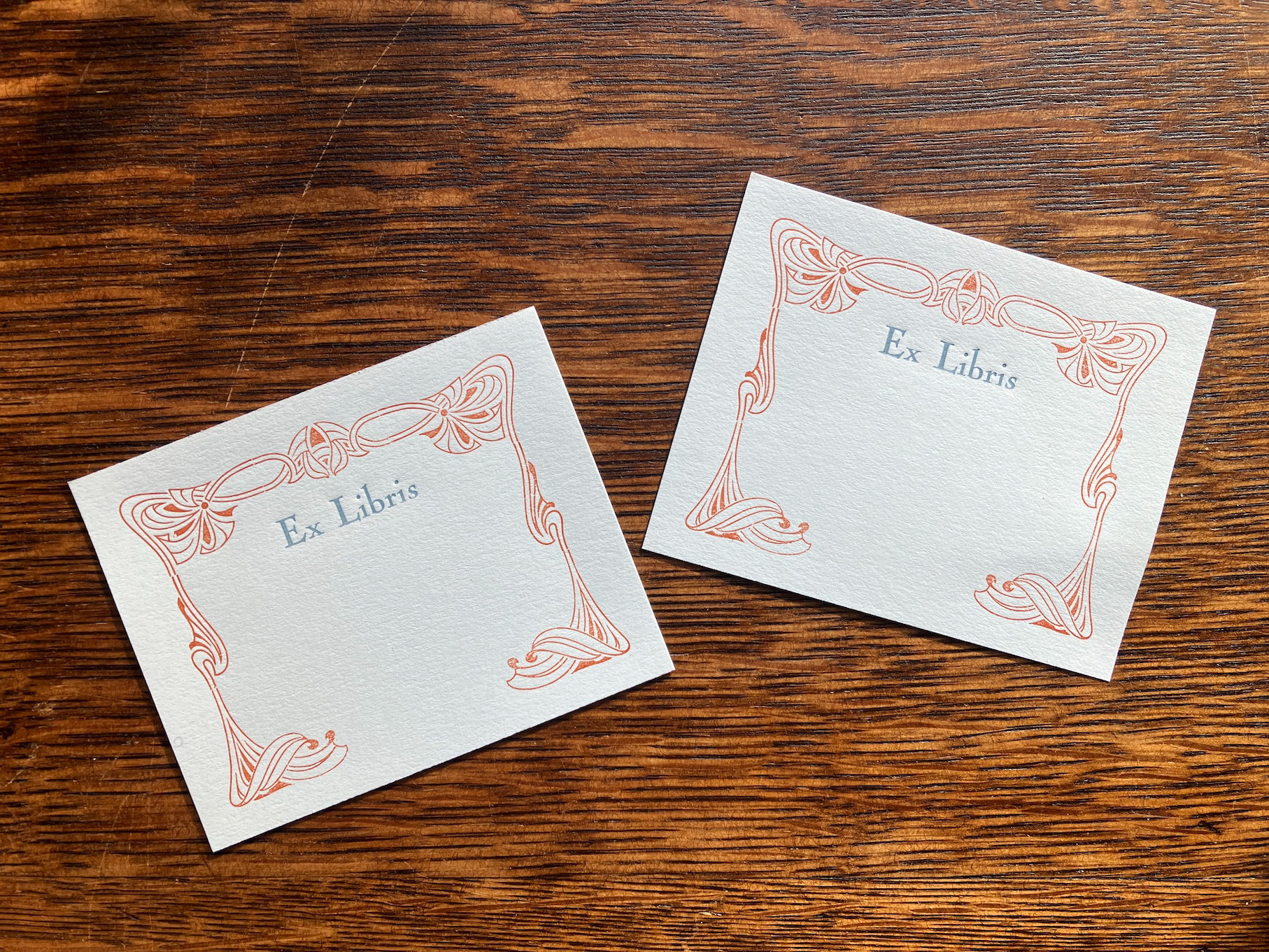 Some bookplates printed using some rather old decorative blocks I found, probably from around 1900, which was when the foundry put out a catalogue. They no longer fitted tightly together (if they ever did), so tying them up was a trial!
