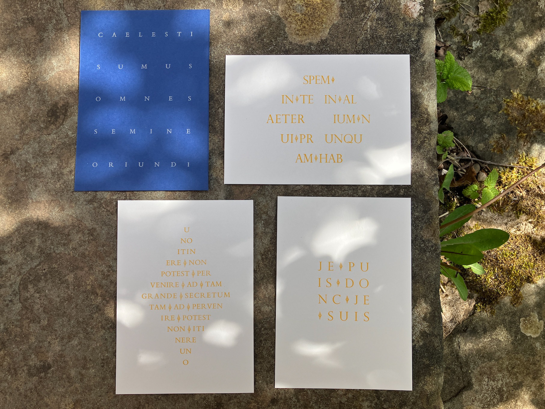 Four cards printed from inscriptions that feature in Gareth Howell-Jones' book, 'Your Lowly Hedgehog Knows' (information about which can be found in the 'Book Design and Layout' section on this site). From top left they read: 'We are all born of the same celestial seed' (Lucretius), 'I have never put my hope in any other but thee' (the 11th century Sarum Rite, used by Thomas Tallis for his motet, c.1571); 'I can, therefore I am' (Simone Weil), and 'You cannot arrive at so great a secret by one path only' (Symmachus).