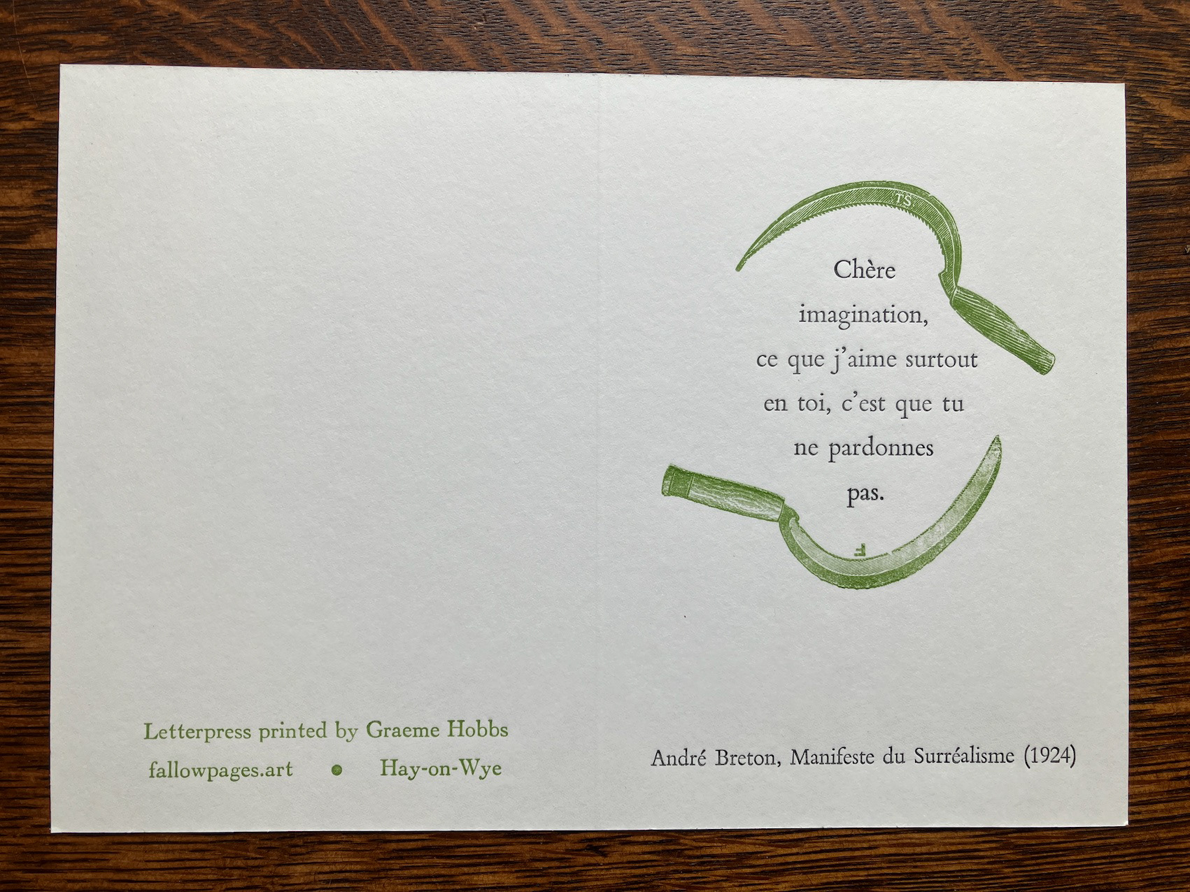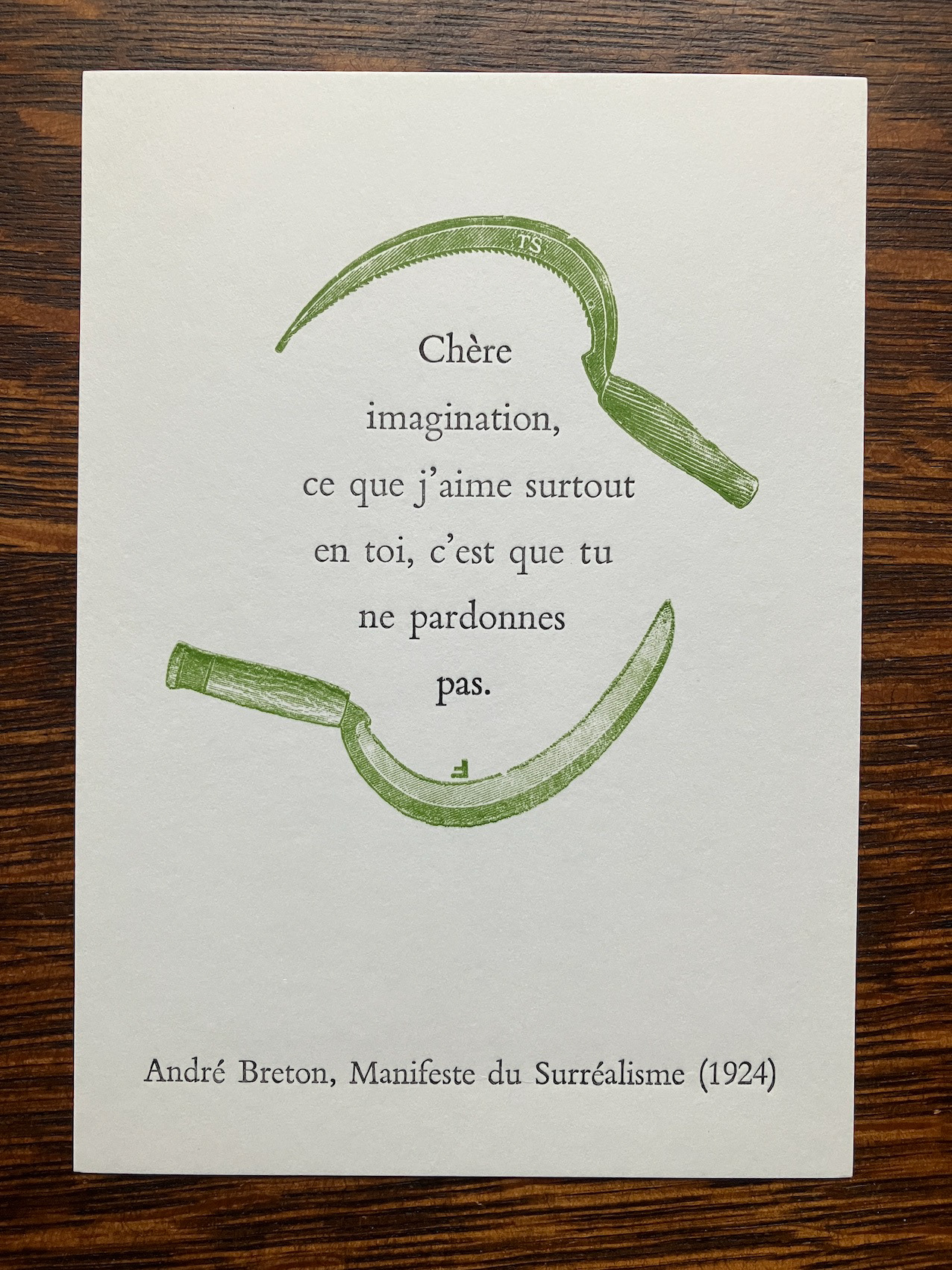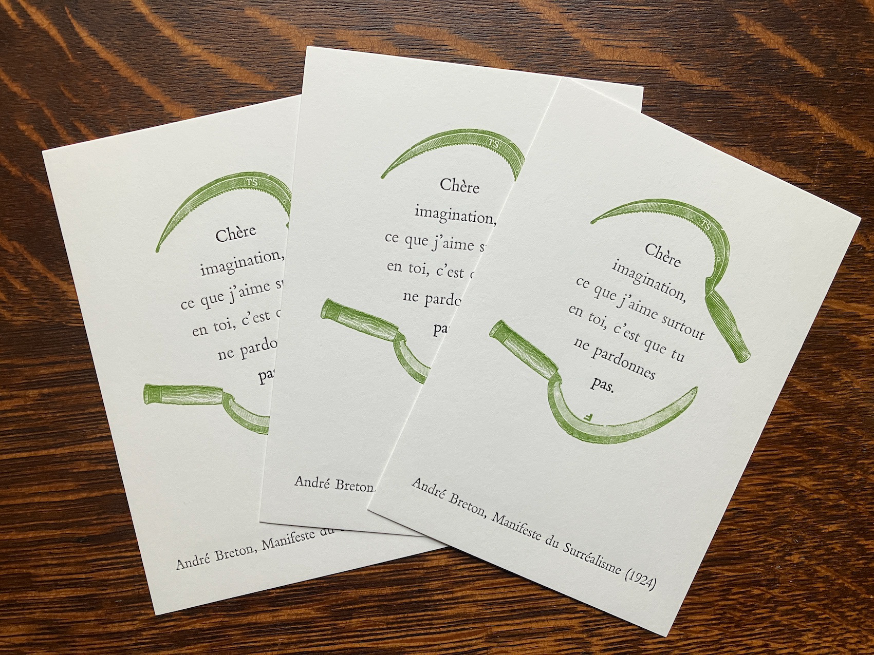A card and postcard printed to mark the 100th anniversary of Andre Breton's Surrealist Manifesto. The placing of the sickles, which were printed afer the words, was a nice challenge.
