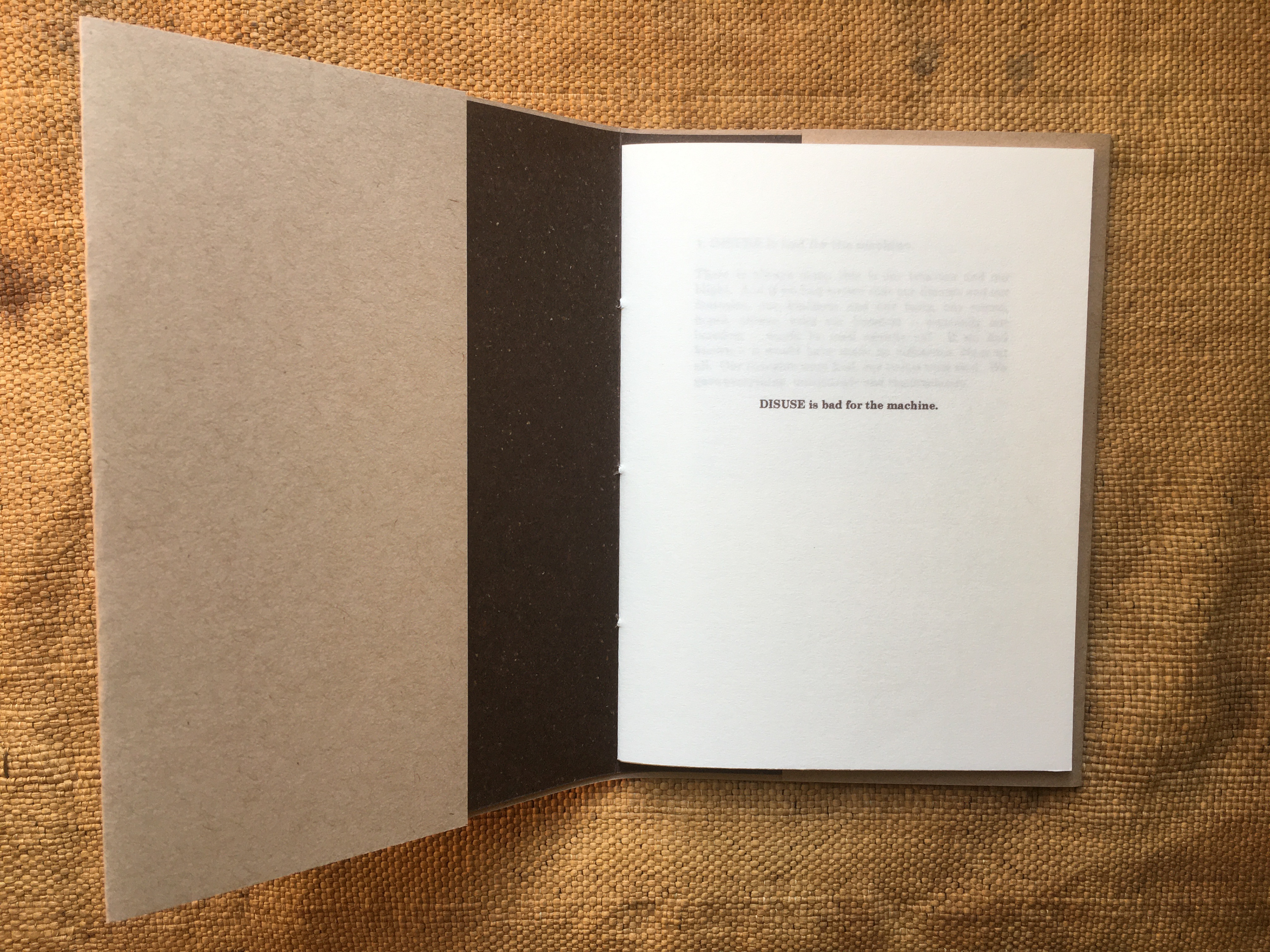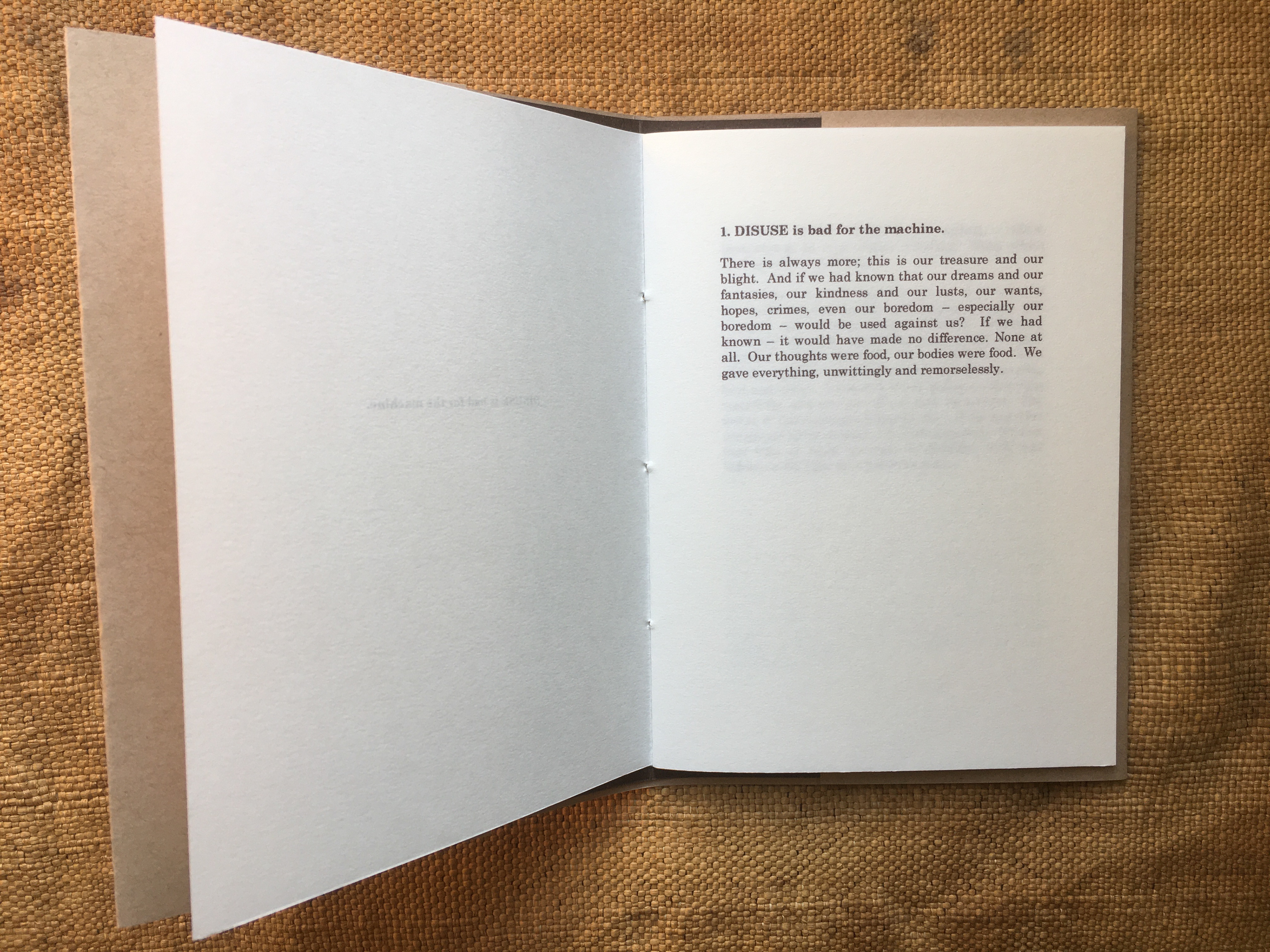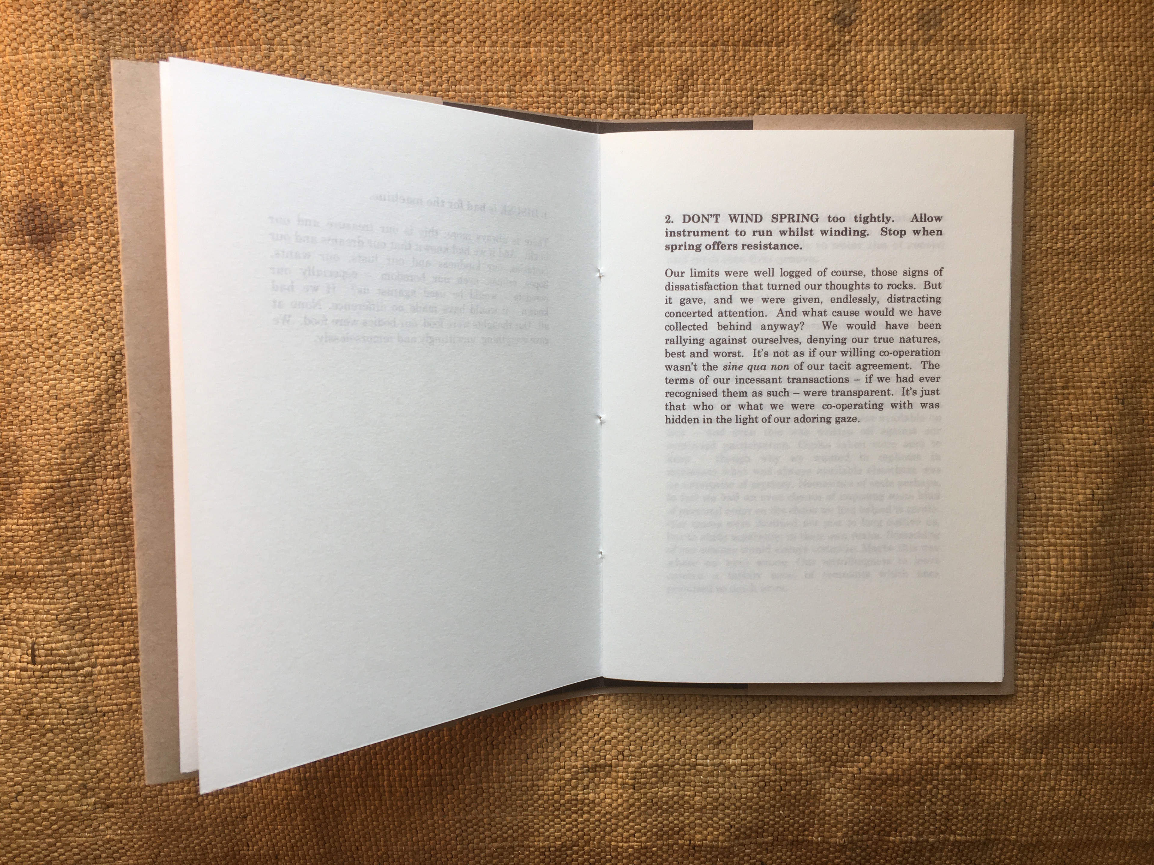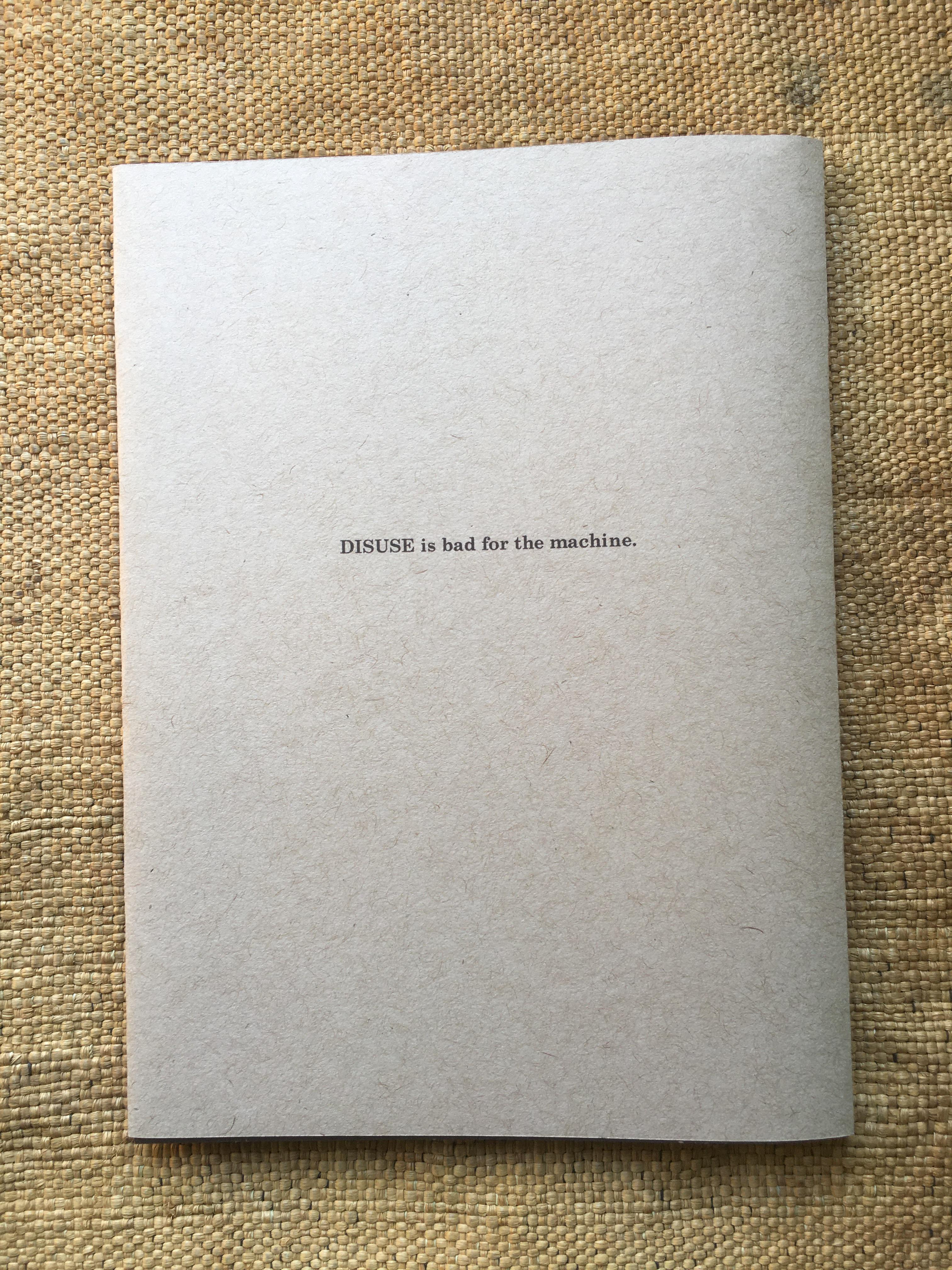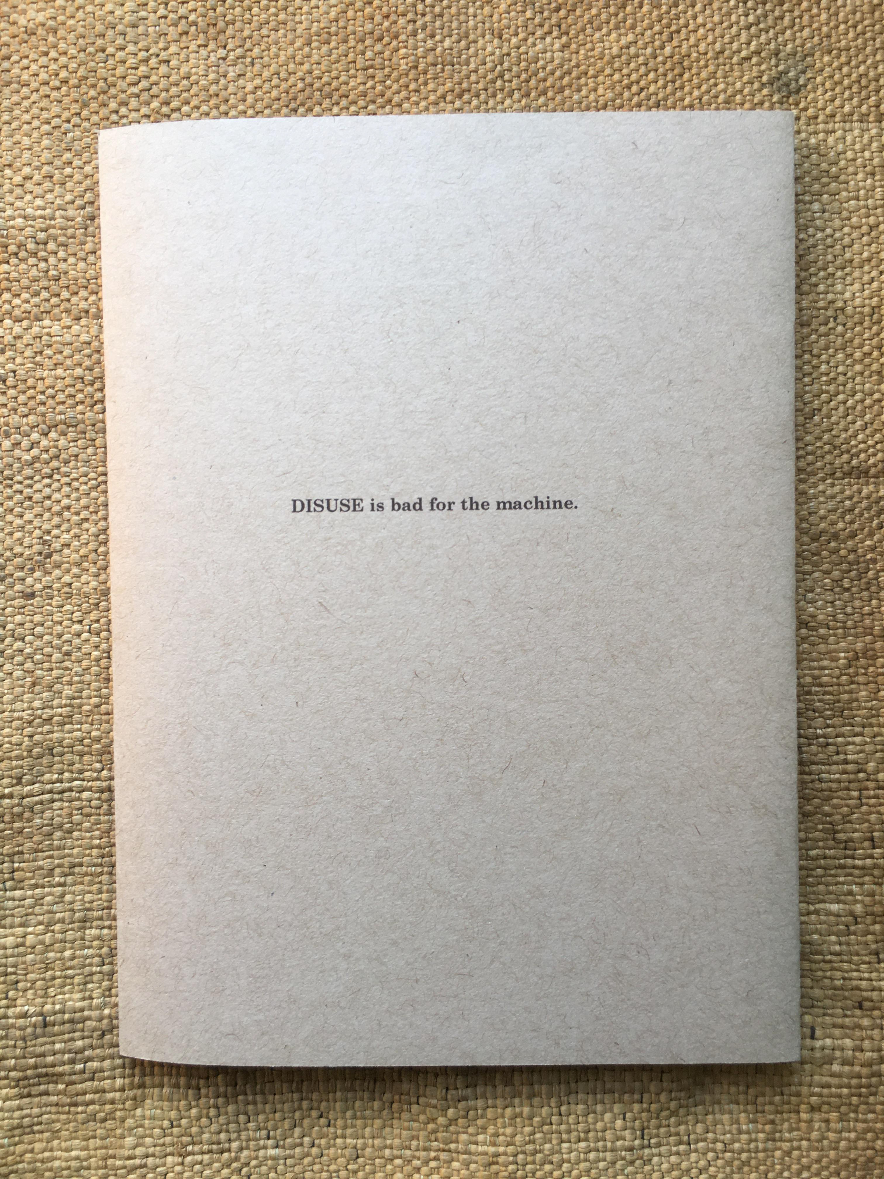 The nine commandments laid down for the correct usage of ‘His Master's Voice’ products on a 1920s 78rpm record sleeve, among them: ‘Don't wind spring too tightly’; ‘Don’t interfere with regulator unless an adjustment is necessary’; ‘Avoid the slightest injury to the Mica Diaphragm’, and – gnomically and inscrutably – ‘Keep leathers which operate on governor friction plate well oiled’, have a hectoring quality which stems from the manner of their listing, beginning with Rule Number 1: ‘Disuse is Bad for the Machine’. To me, this implied a proto-Orwellian world (though in time and vision it comes closer to the Moloch Machine and its ceaselessly gaping maw in Fritz Lang’s Metropolis, or – a literary analogue – the remorseless mechanism of E.M Forster’s The Machine Stops), with the suggestion of people as slaves to the requirements of technology finding ready parallels in our own time. The short texts within, taking their cue from the ‘His Master's Voice’ commandments, are leashed neither to time nor place, making the writing hard to pin down, though its tone is characterised by a mournful, impotent regret at possibilities lost. The booklet is thin and deliberately cheap-looking, implying scarcity of resources in tawdry, mass-produced times. January, 2012.