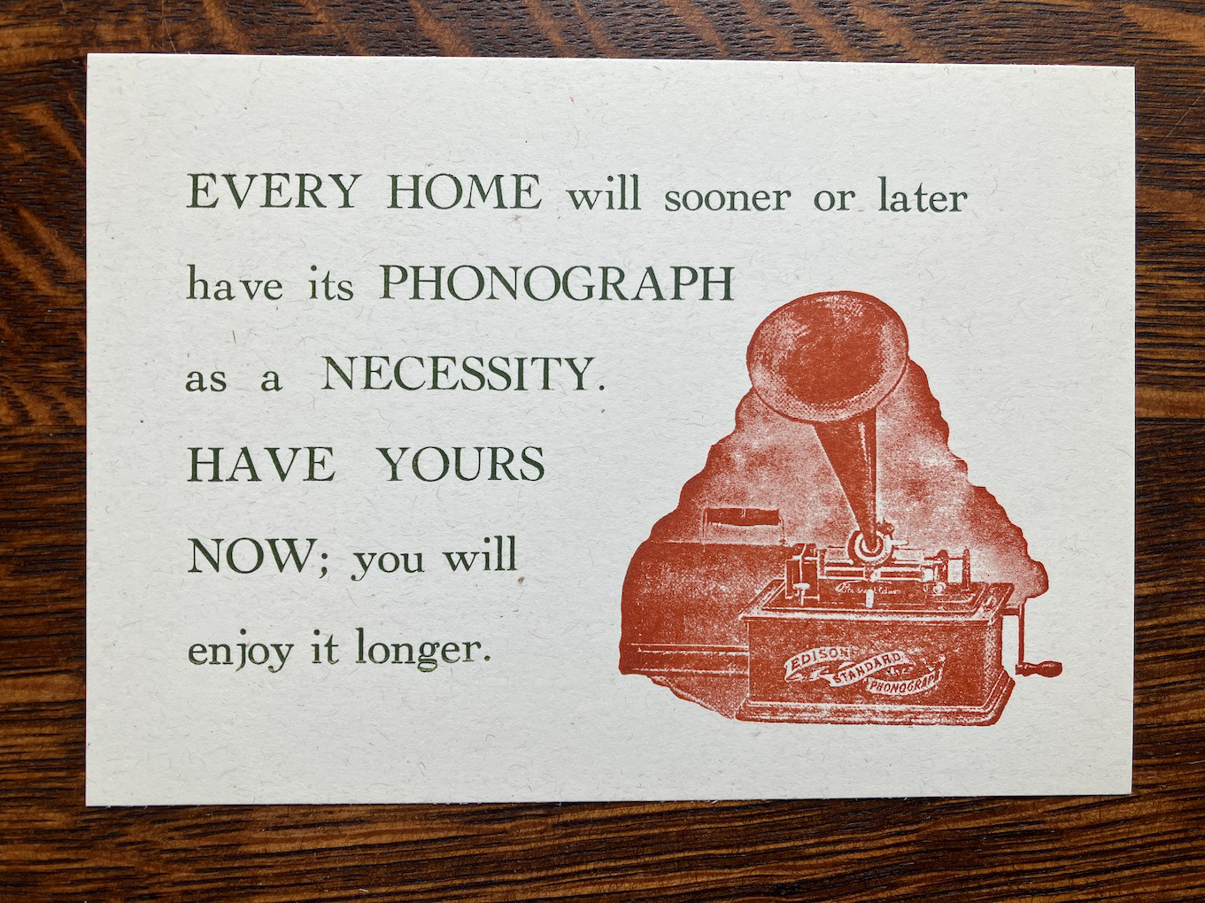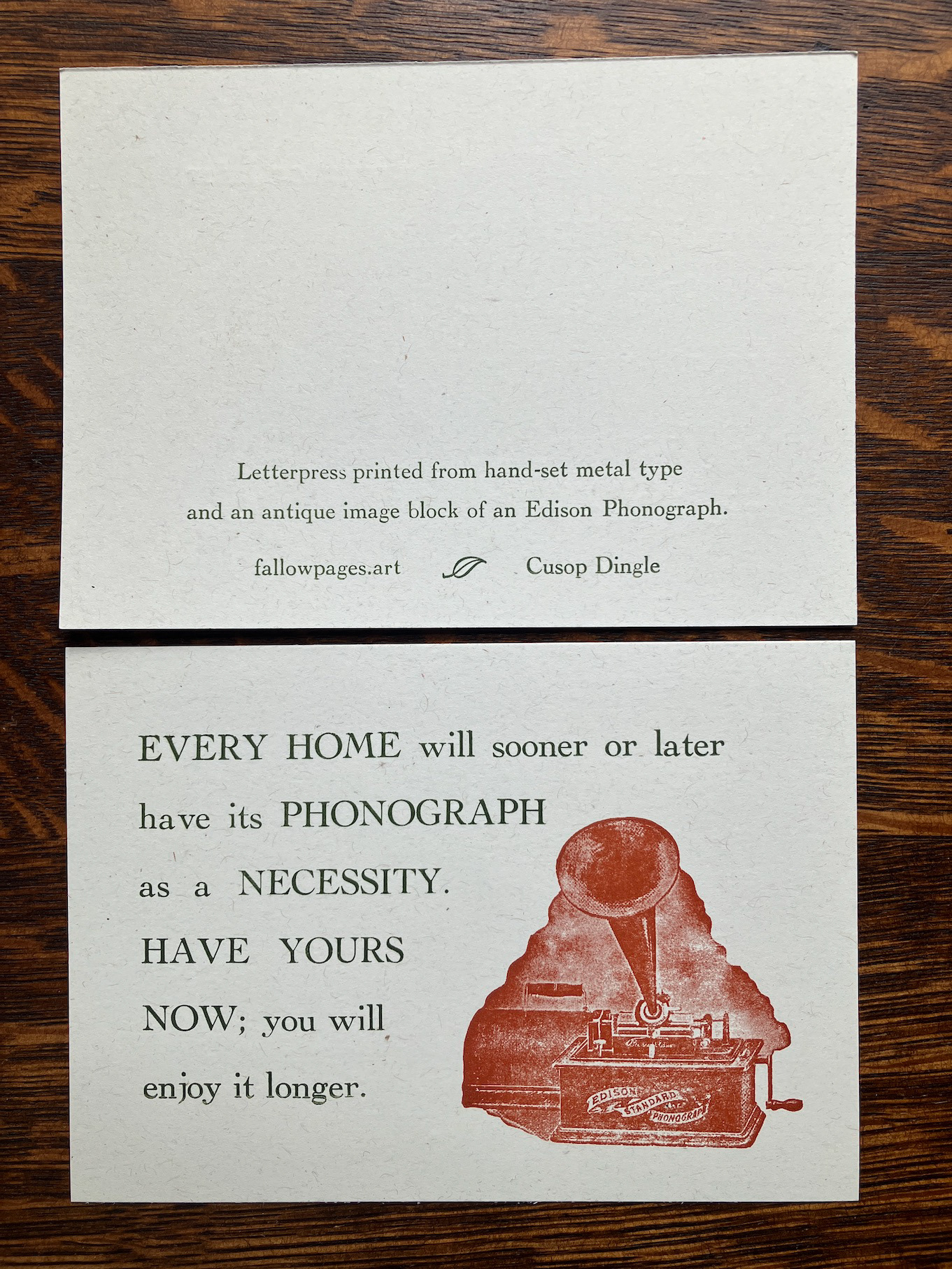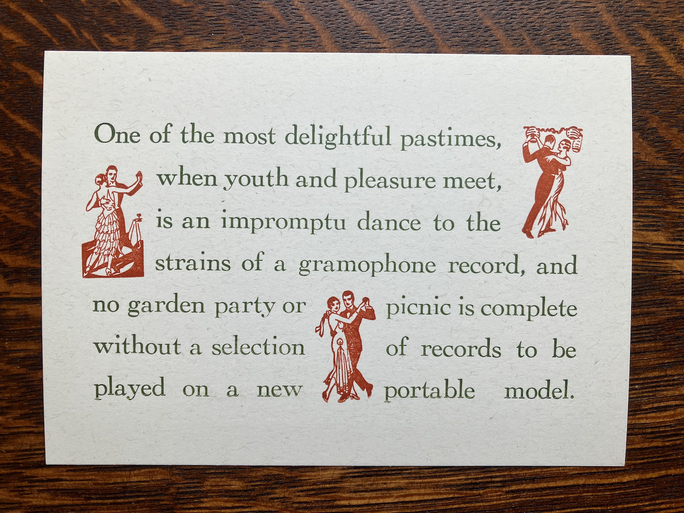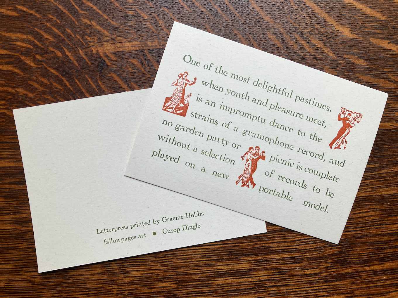 Printed from an antique image block of an Edison Phonograph, with the words taken from an original advertisement for the same. The words for 'Impromptu dance' come from one of my 78 record sleeves. It was a nice way of using the various blocks of dancers I have accumulated.