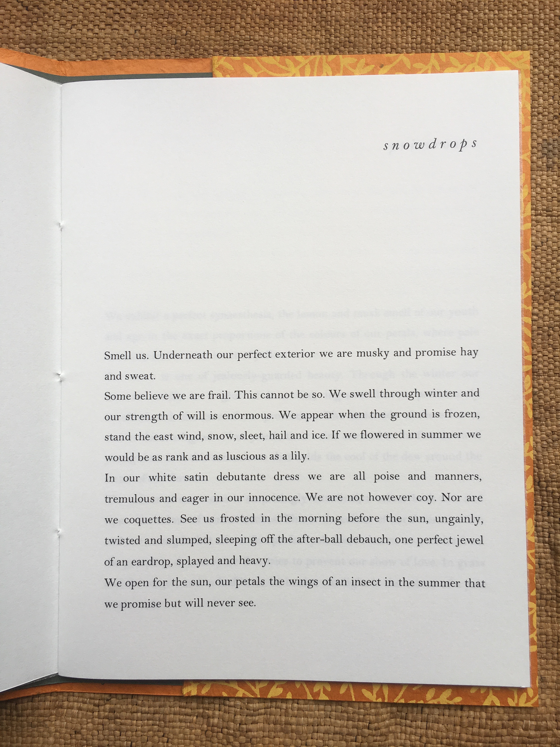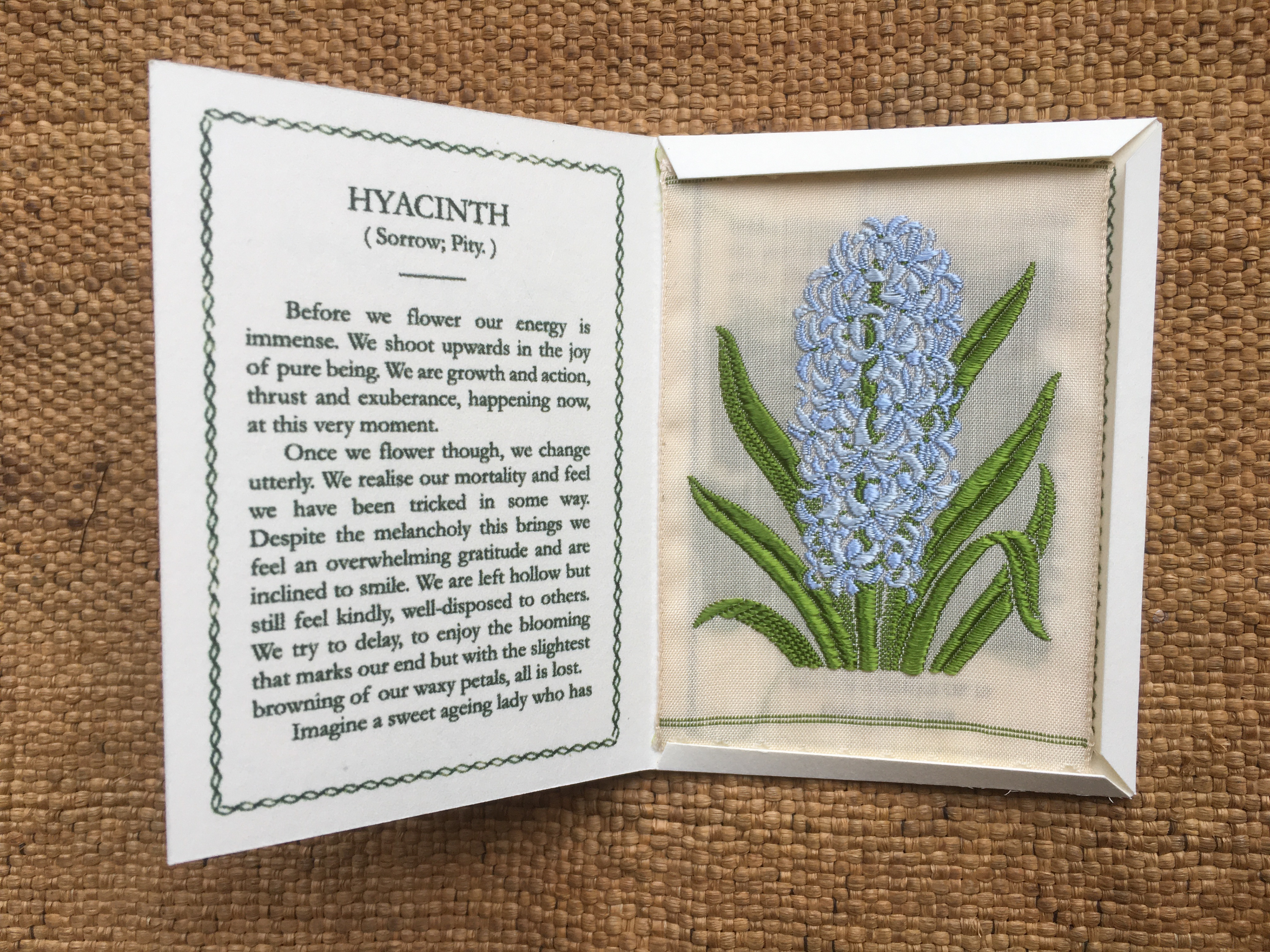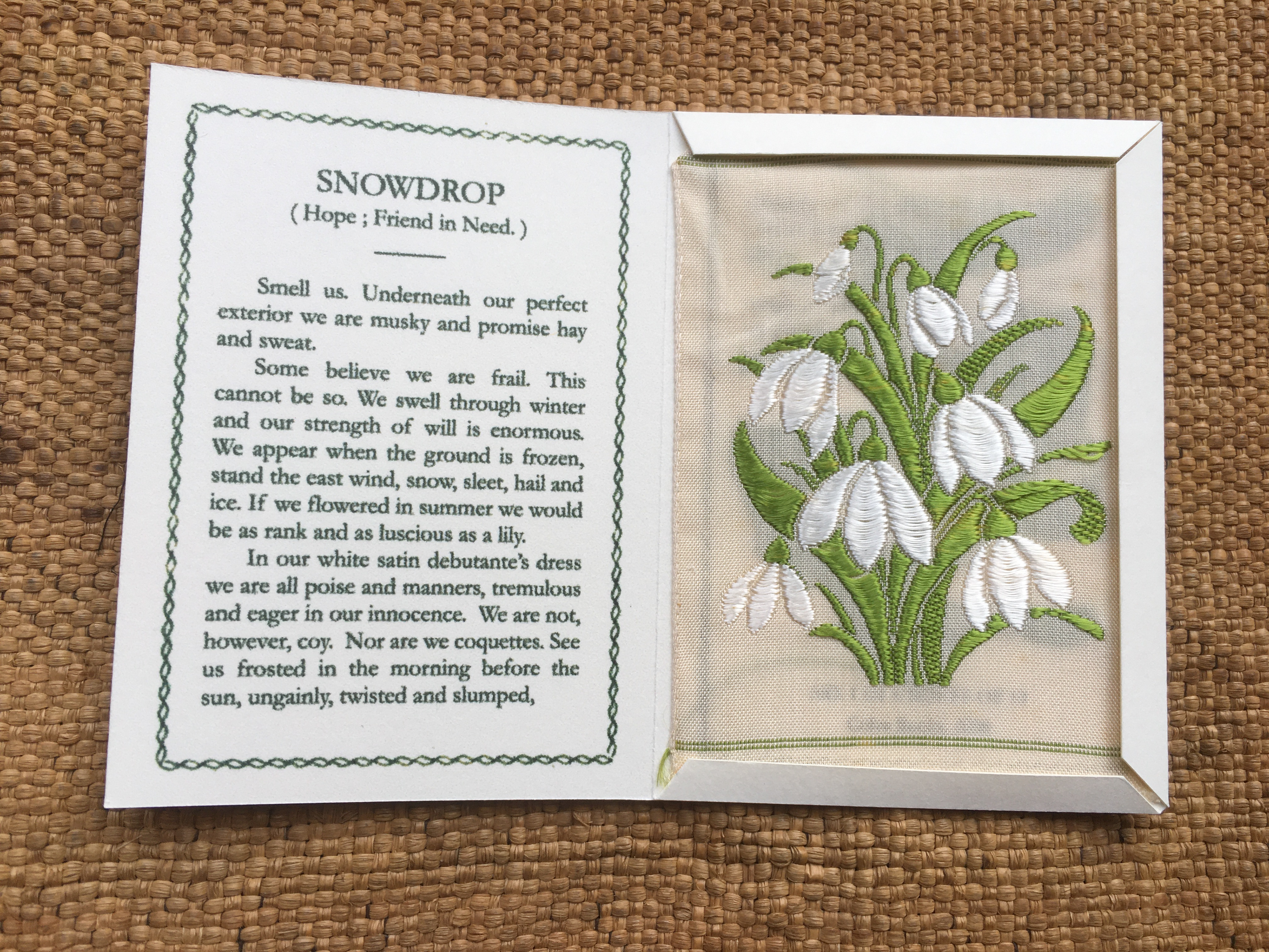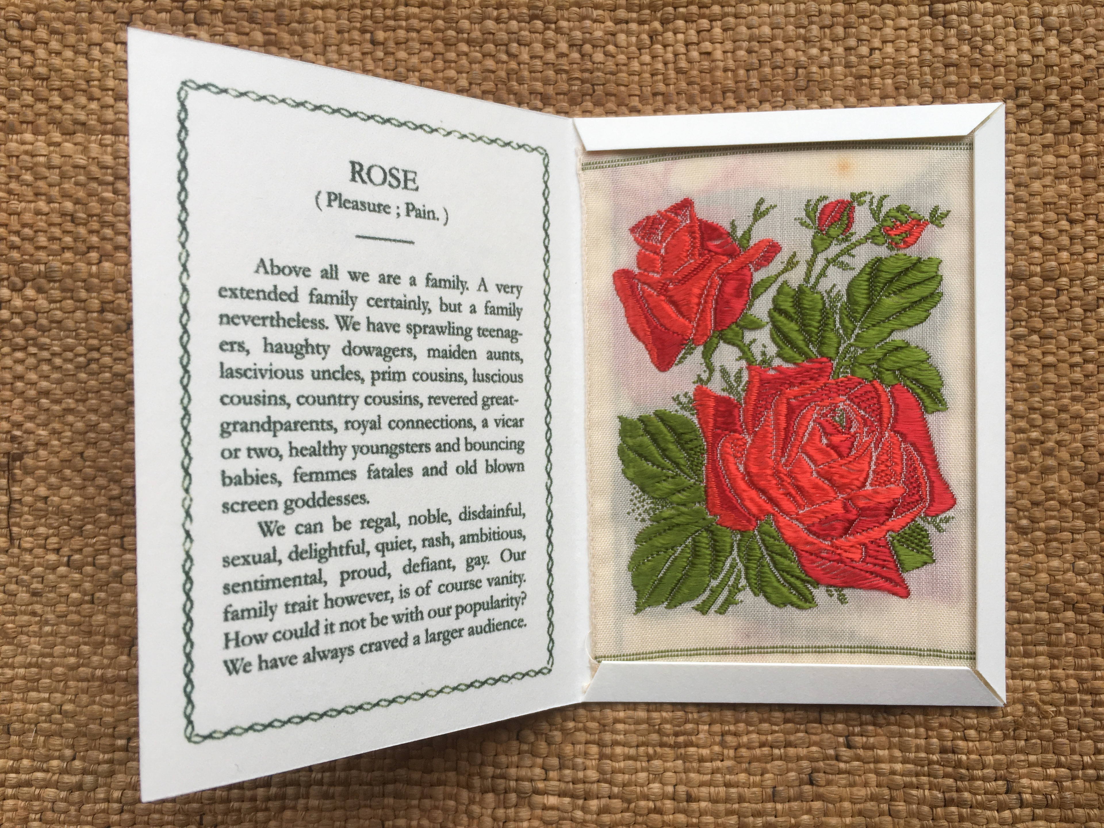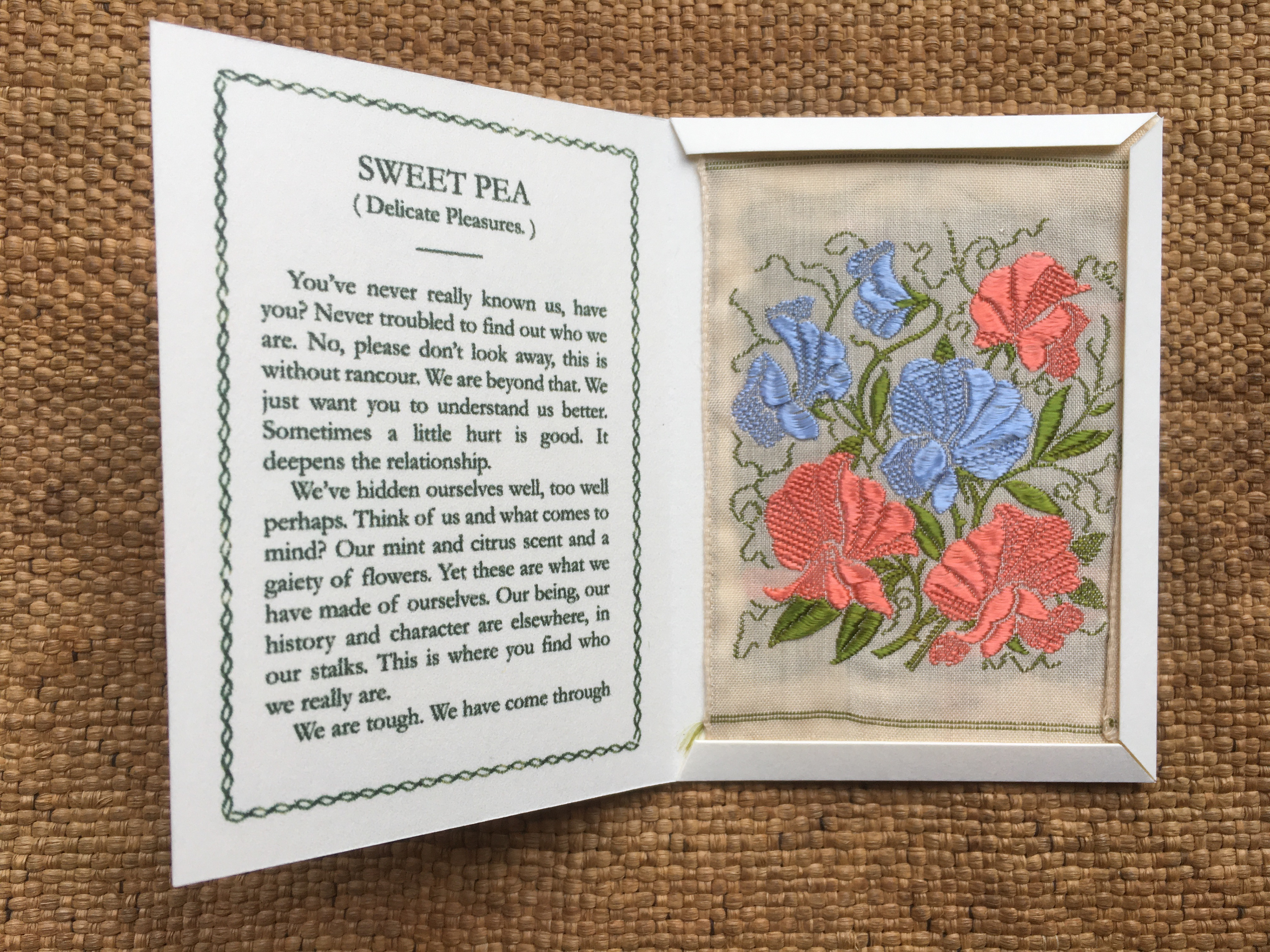 Twelve intimate portraits in words, of different flowers. The portraits follow the seasons, from snowdrops and primroses through to teasels and jasmine, and were written gradually over a couple of years, beginning with thoughts about nasturtiums that came one day unbidden in the garden. Ten of the flowers that I wrote about appeared as embroidered silk flowers that were given away with Wix’s Kensitas cigarettes in 1934-35. As these silks are still readily available I printed up a few folders with my own text replacing the botanical history and cultural notes that appeared in the originals and slipped the silks inside. December, 2004.