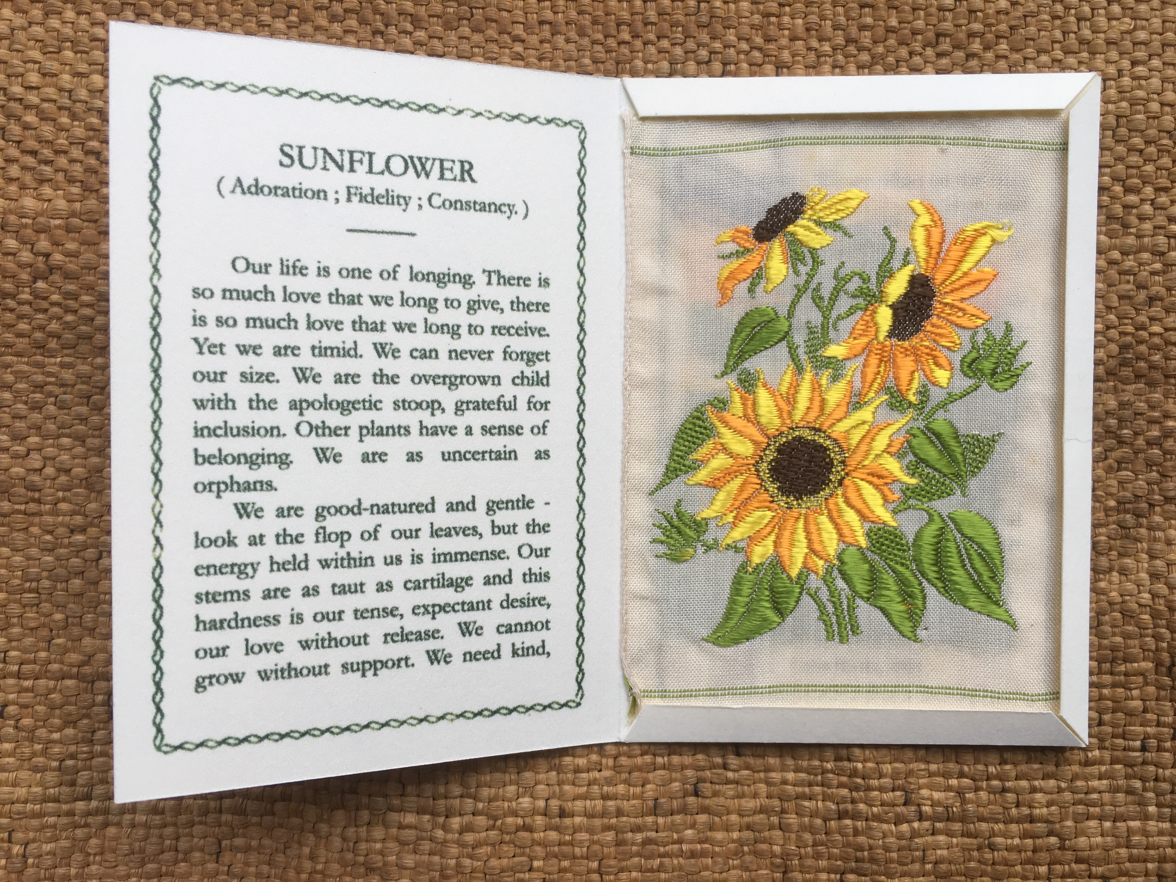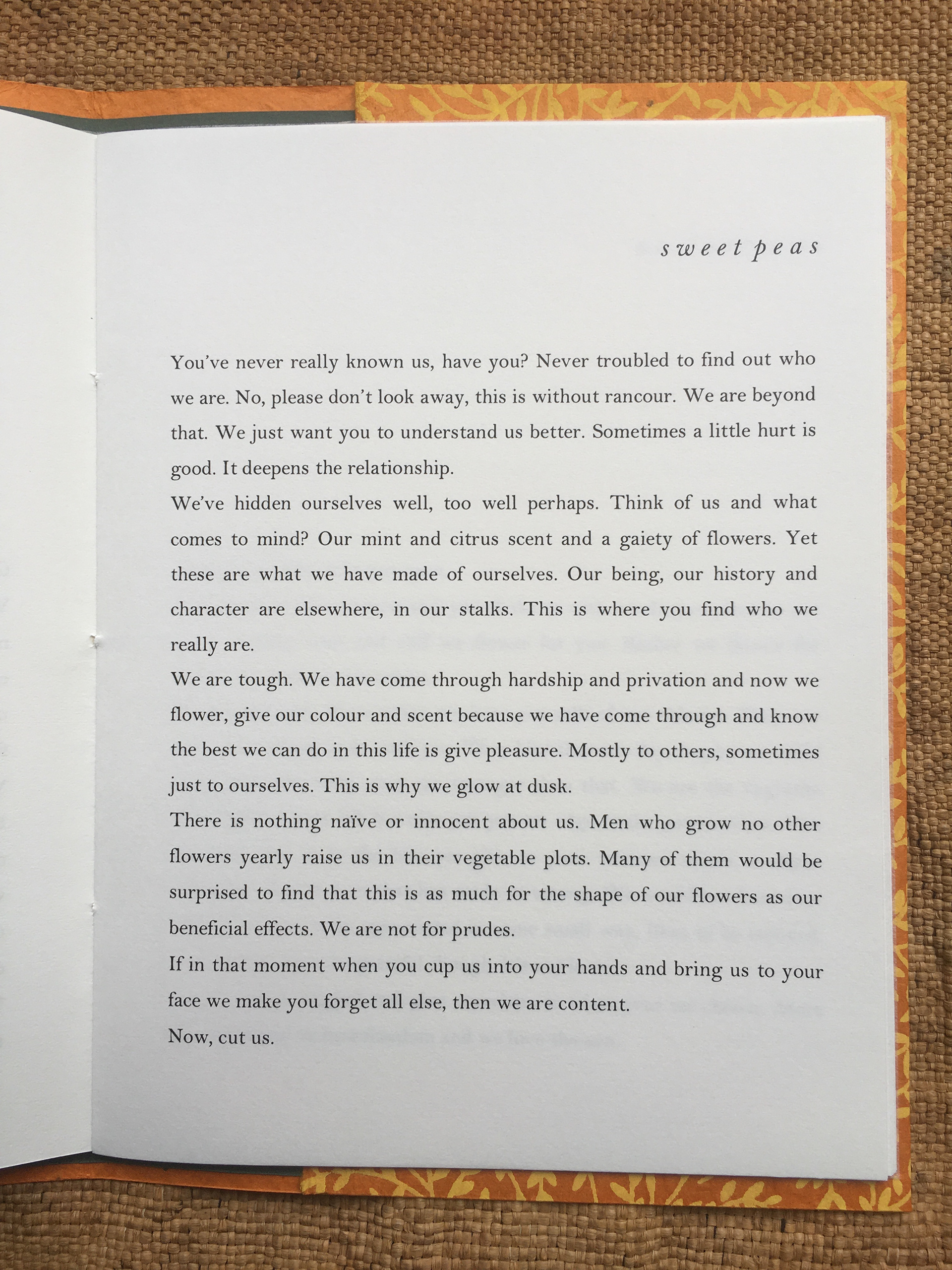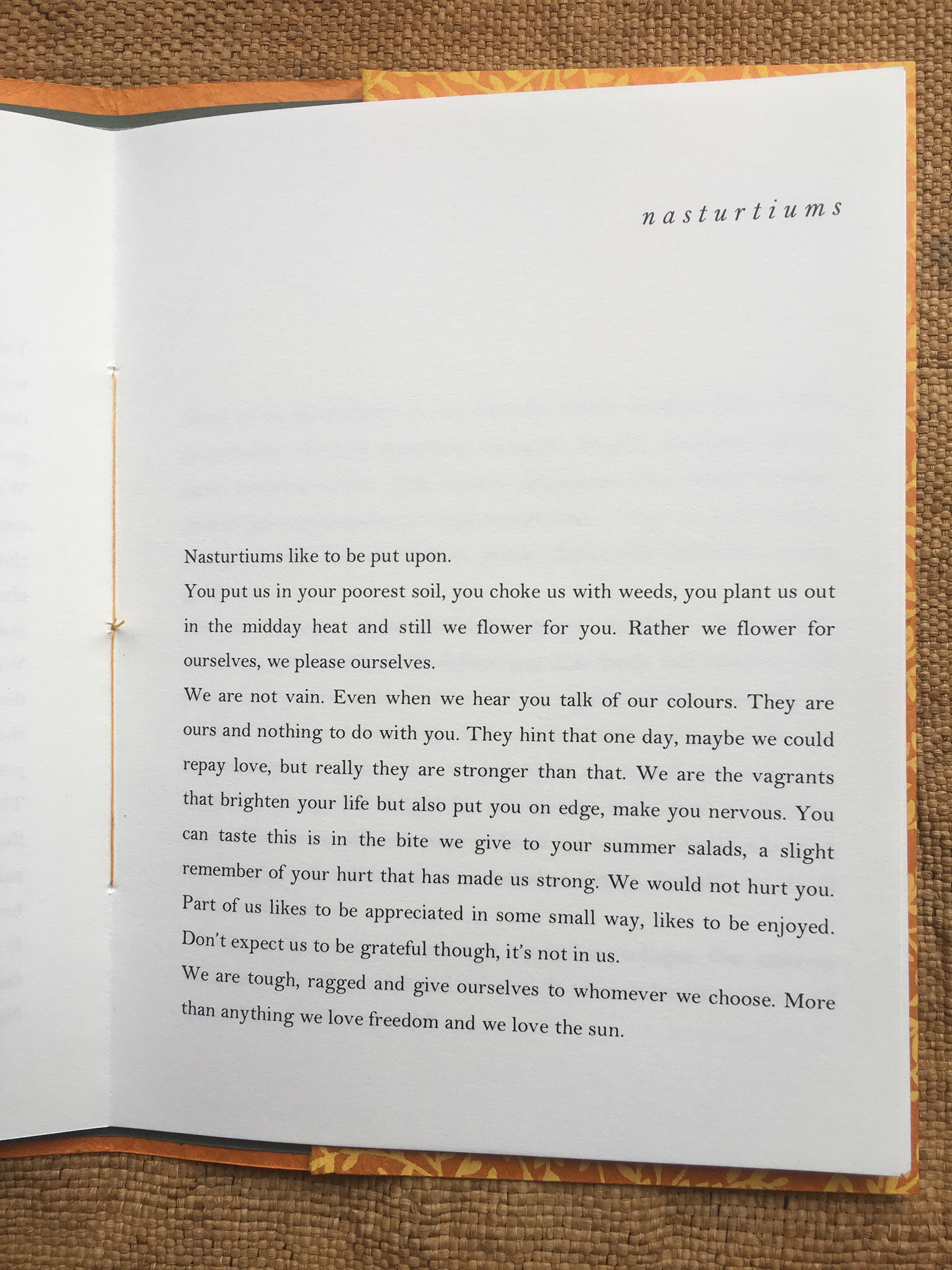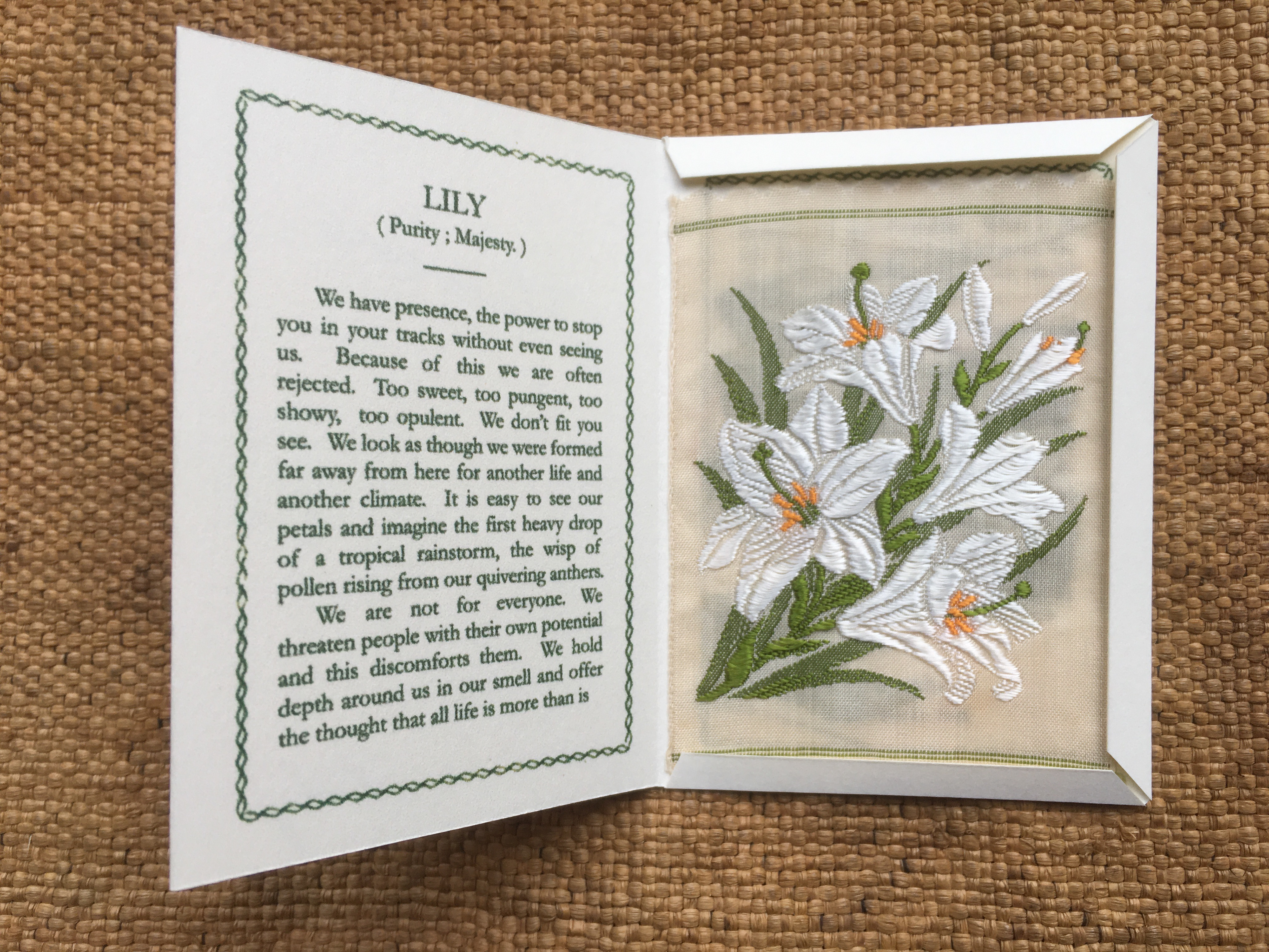 Twelve intimate portraits in words, of different flowers. The portraits follow the seasons, from snowdrops and primroses through to teasels and jasmine, and were written gradually over a couple of years, beginning with thoughts about nasturtiums that came one day unbidden in the garden. Ten of the flowers that I wrote about appeared as embroidered silk flowers that were given away with Wix’s Kensitas cigarettes in 1934-35. As these silks are still readily available I printed up a few folders with my own text replacing the botanical history and cultural notes that appeared in the originals and slipped the silks inside. December, 2004.