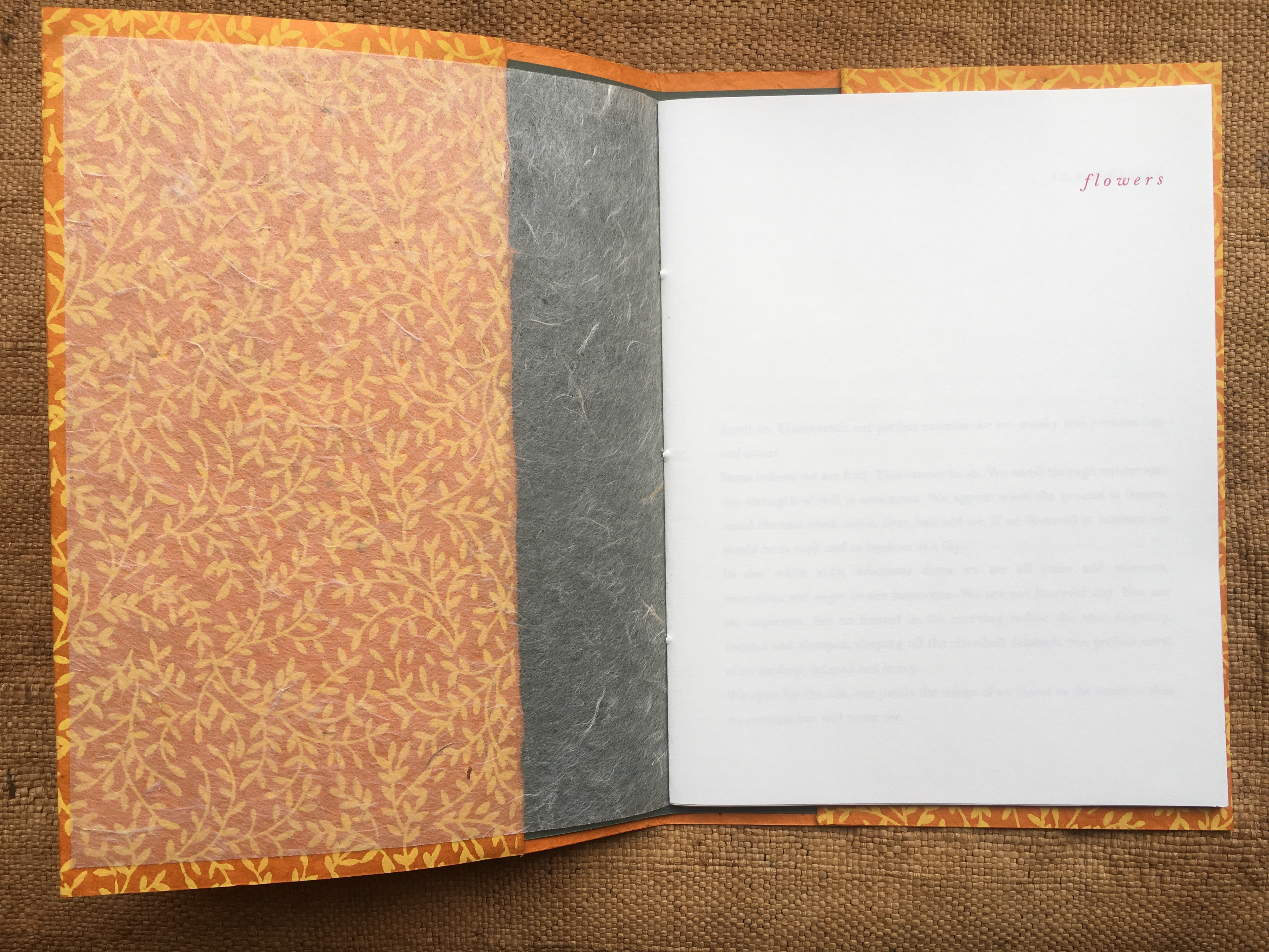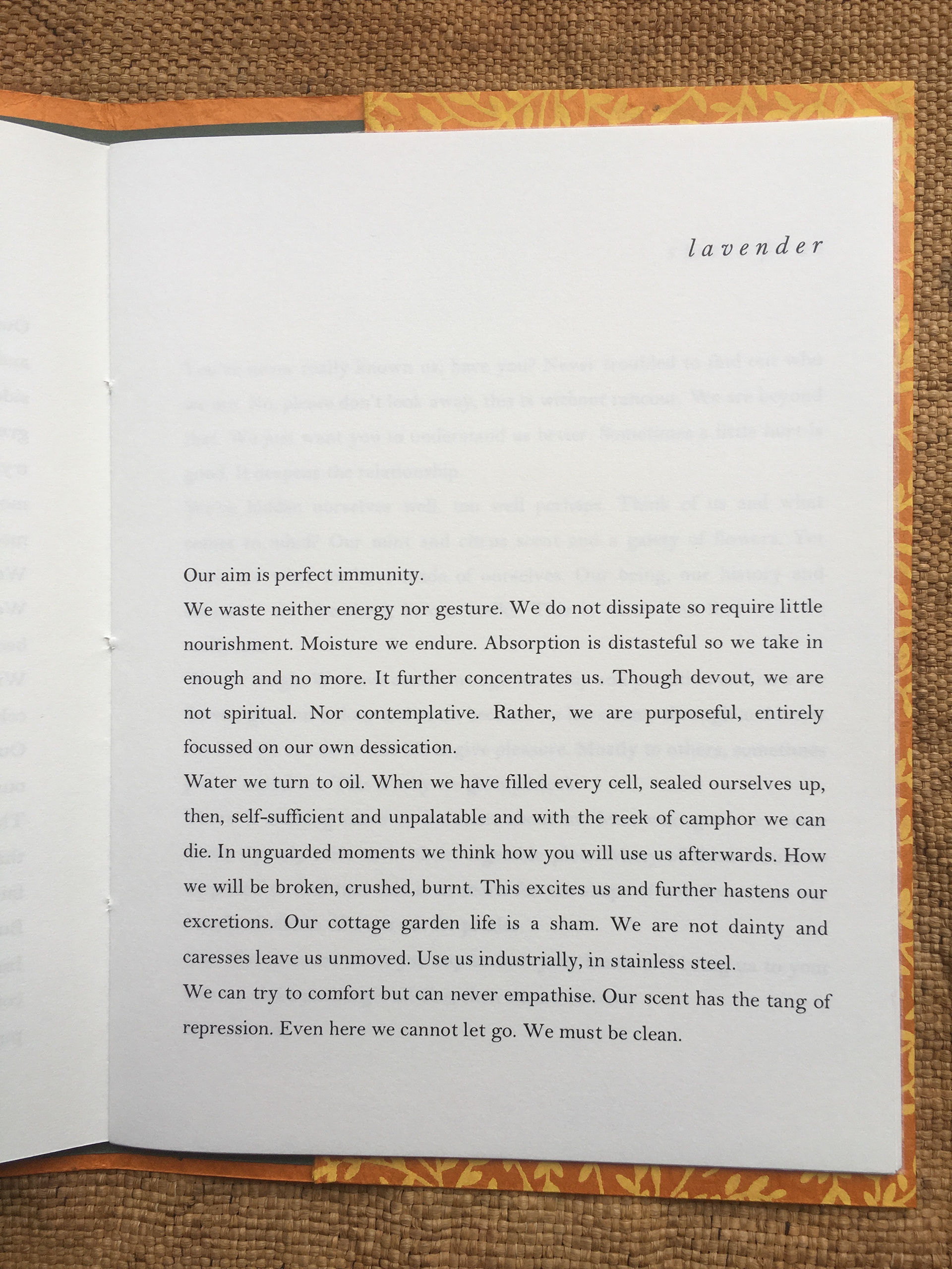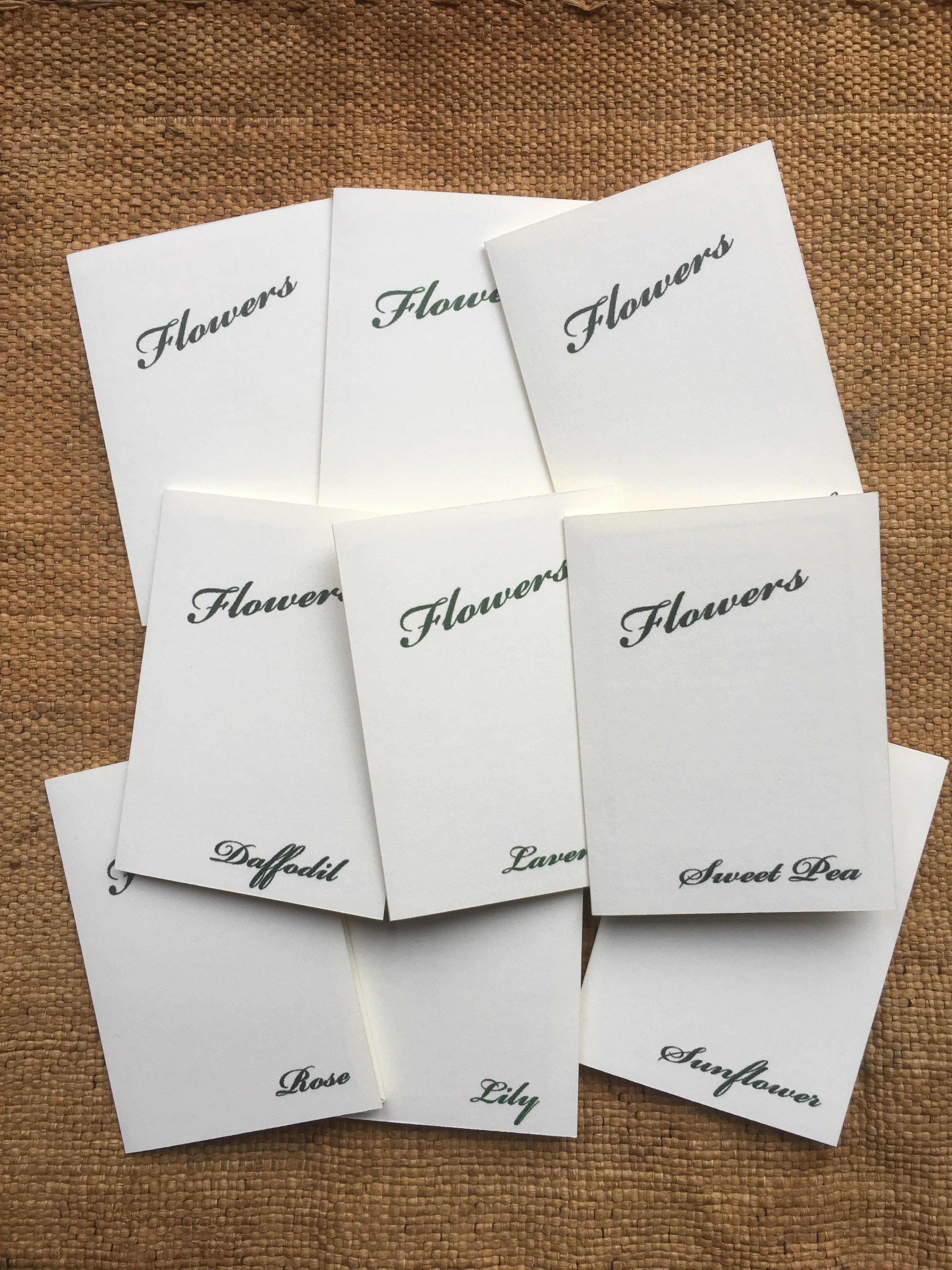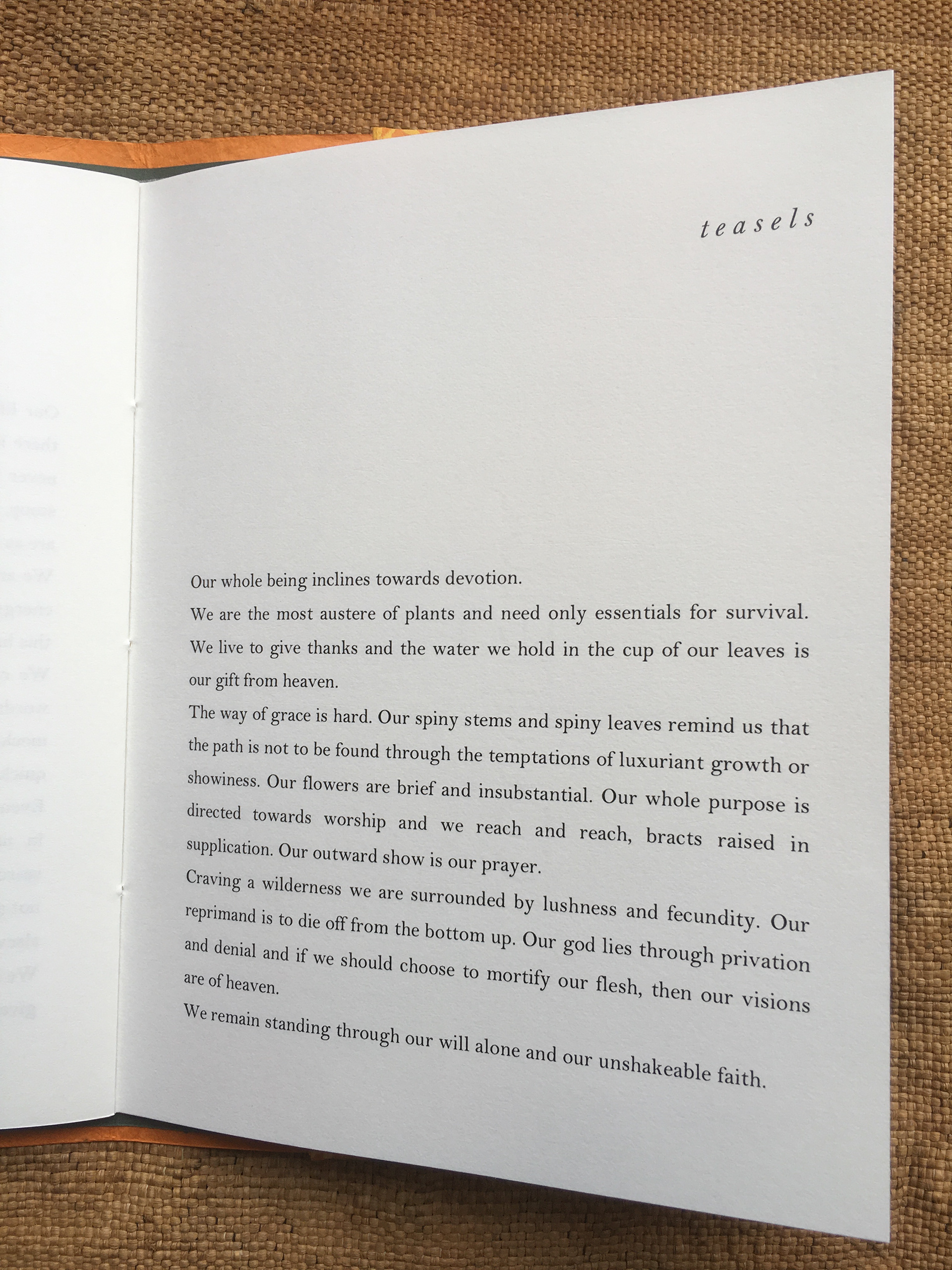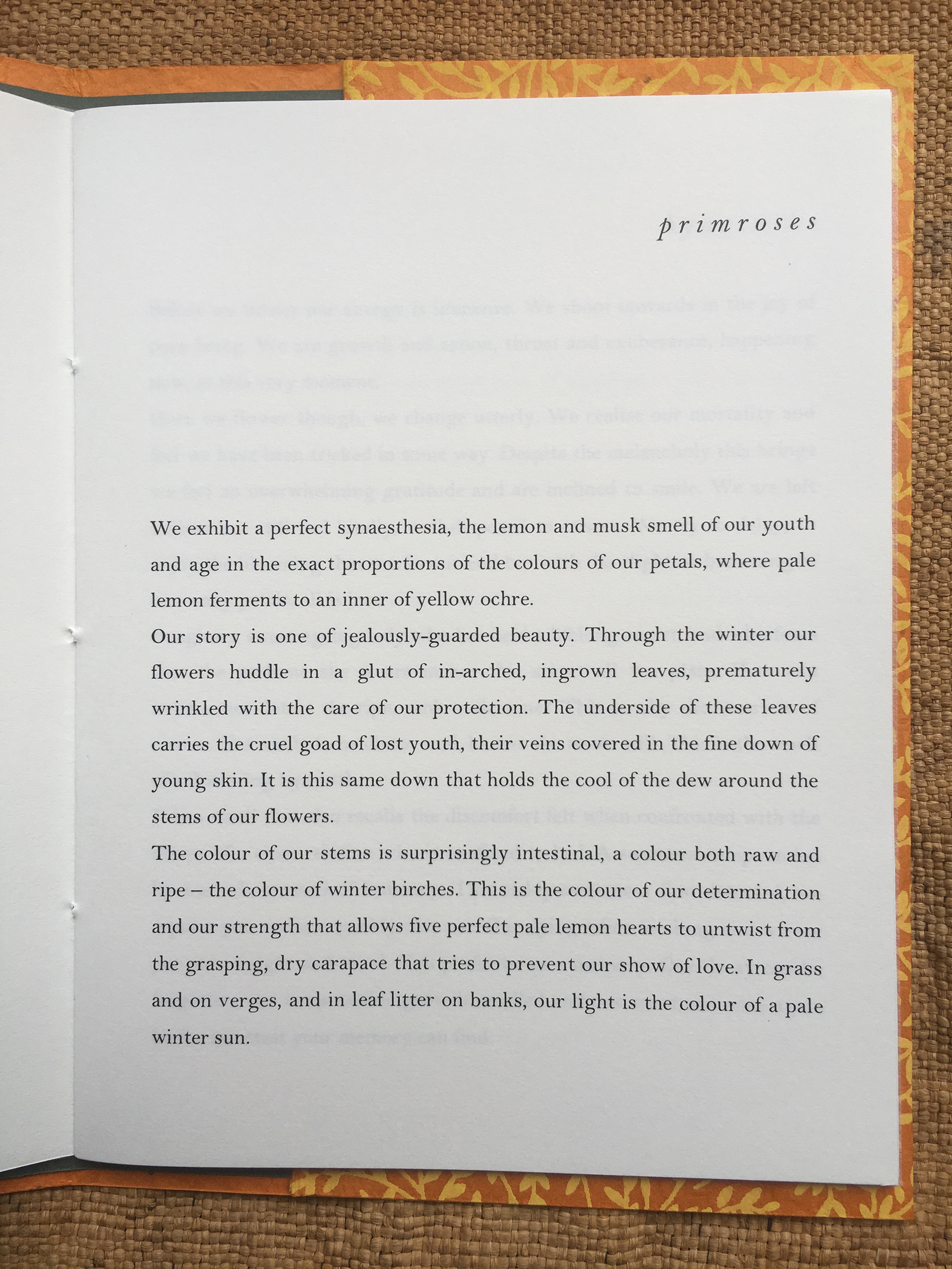Twelve intimate portraits in words, of different flowers. The portraits follow the seasons, from snowdrops and primroses through to teasels and jasmine, and were written gradually over a couple of years, beginning with thoughts about nasturtiums that came one day unbidden in the garden. Ten of the flowers that I wrote about appeared as embroidered silk flowers that were given away with Wix’s Kensitas cigarettes in 1934-35. As these silks are still readily available I printed up a few folders with my own text replacing the botanical history and cultural notes that appeared in the originals and slipped the silks inside. December, 2004.