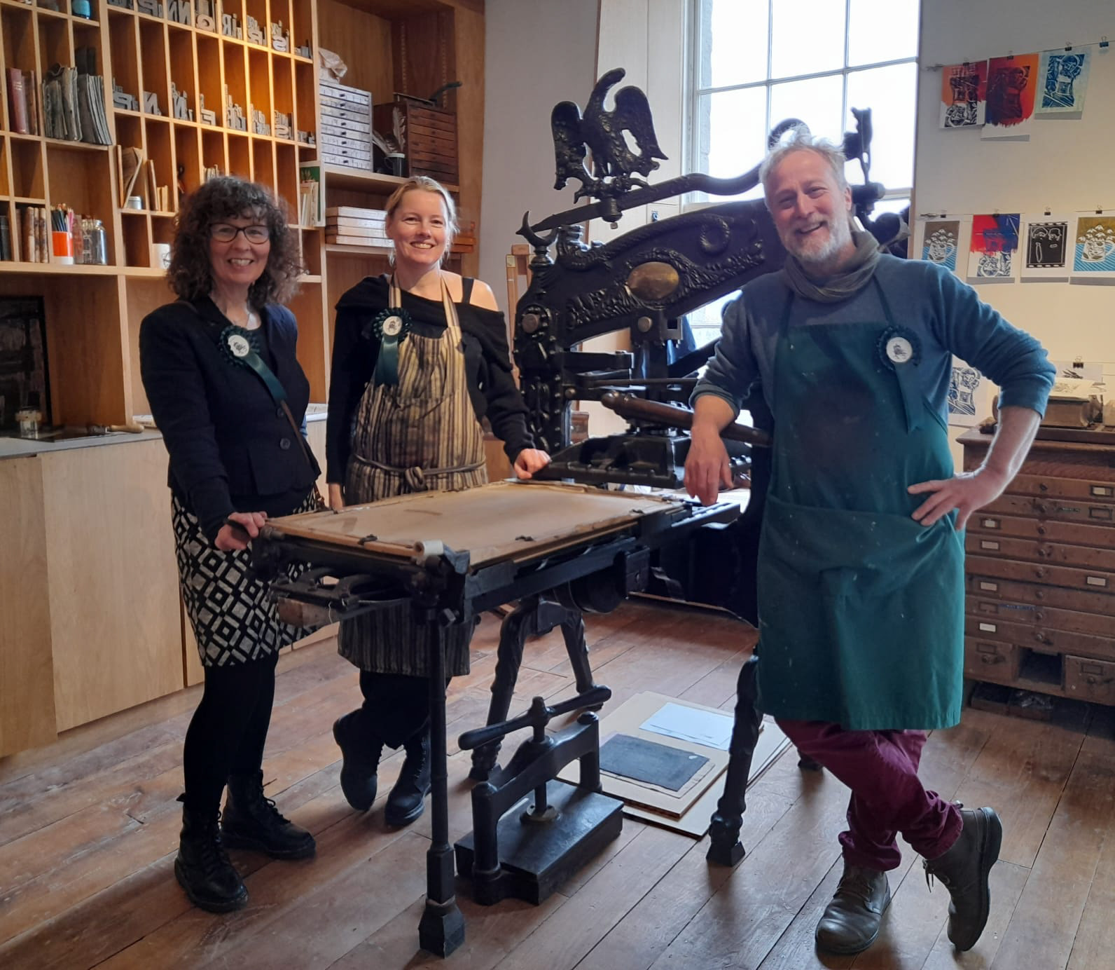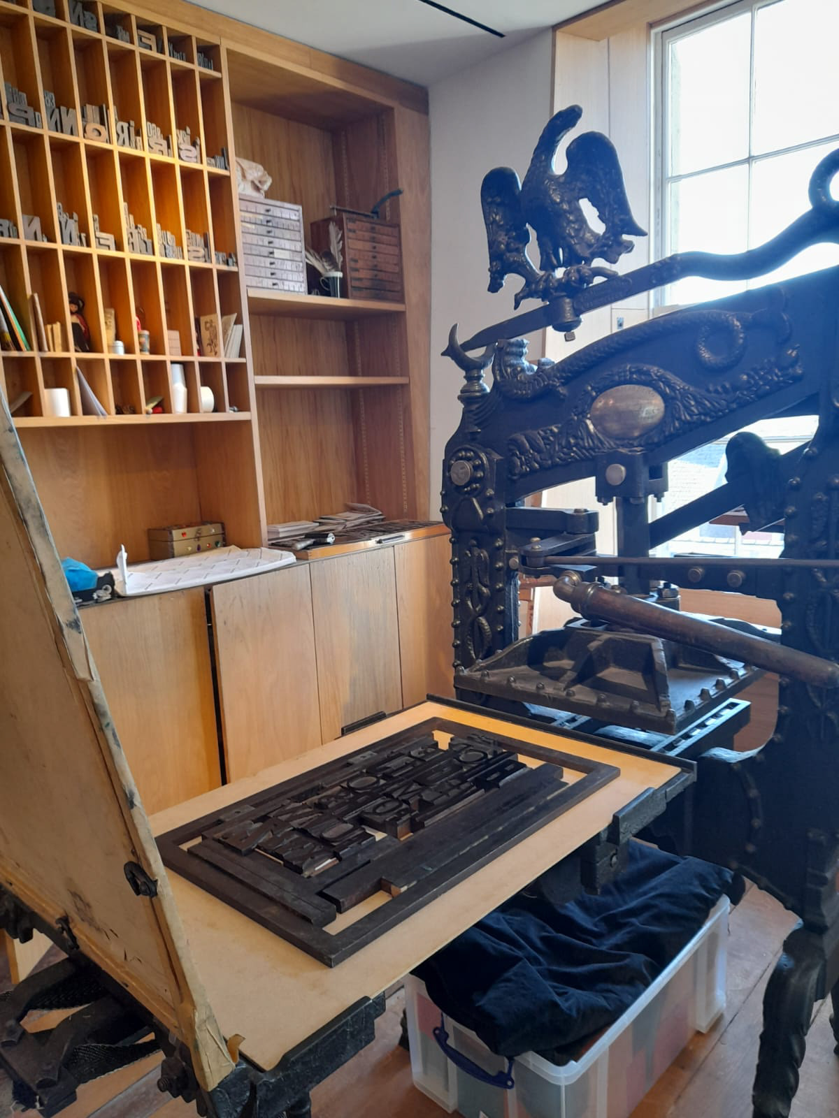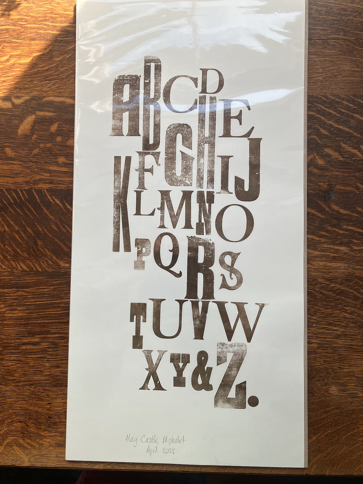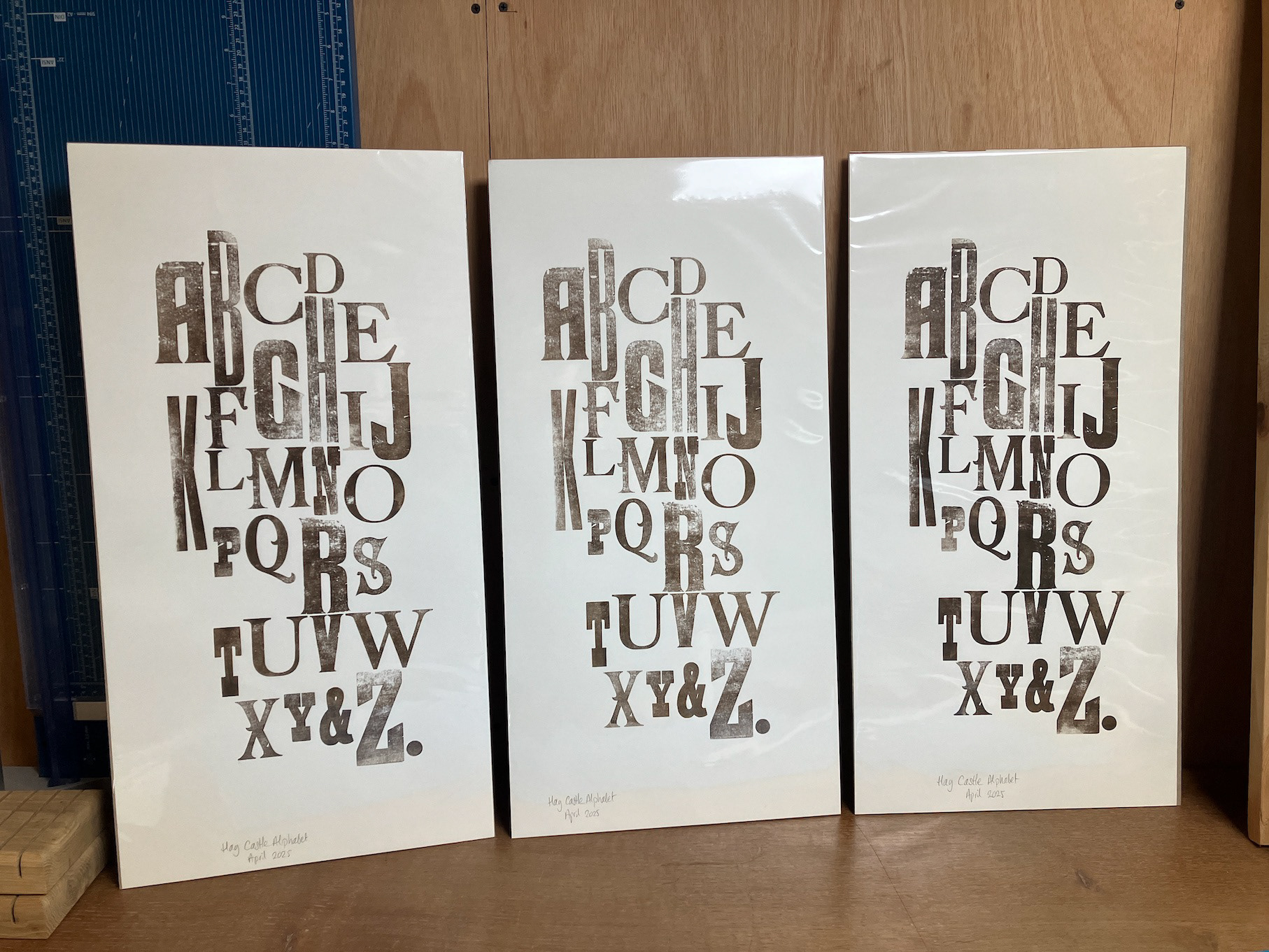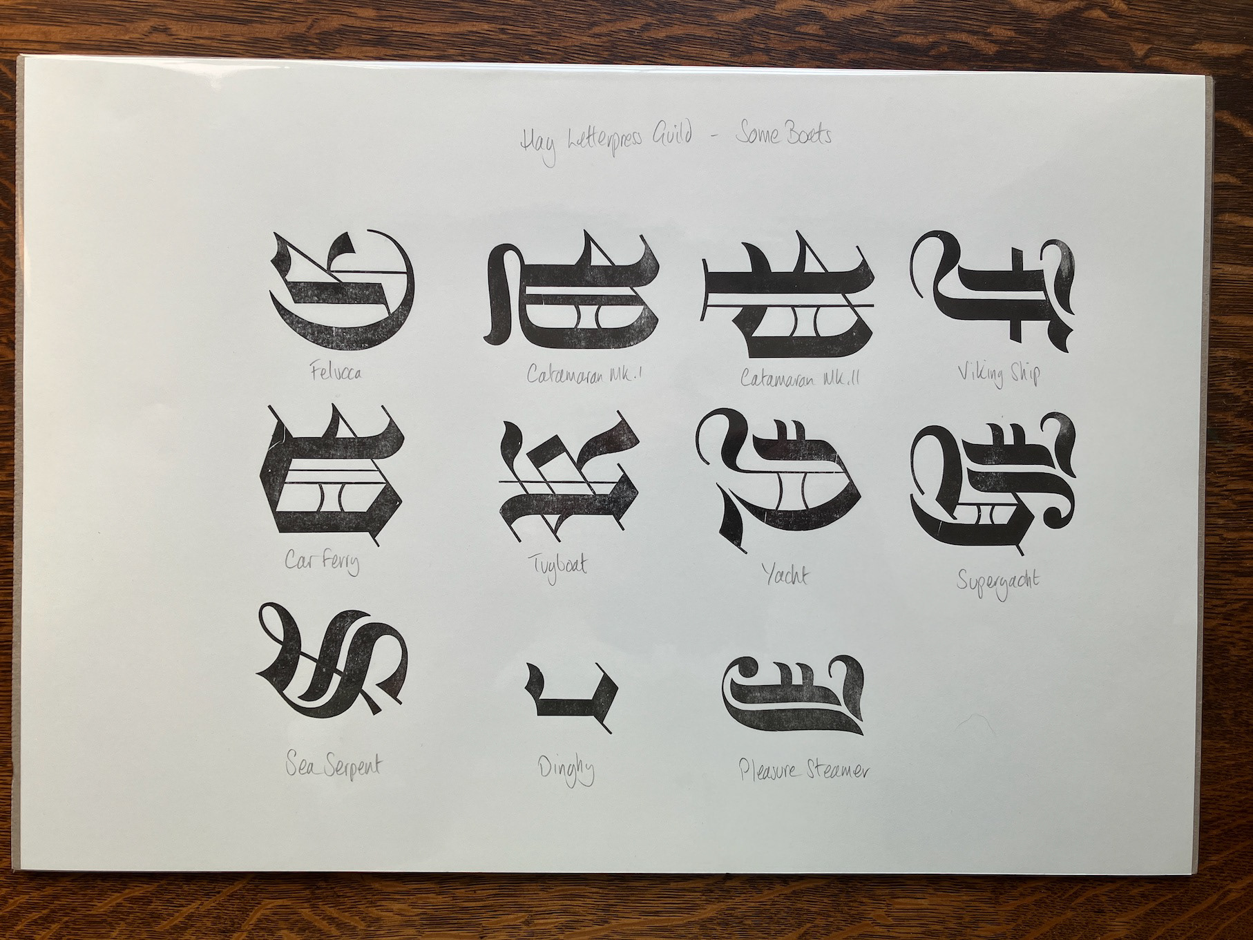 Pictured, the Hay on Wye Guild of Letterpress Printers, whose home is Hay Castle where we occasionally print on the 1853 Columbia press on the first floor. The first photo shows me with fellow conspirators, Francesca Kay and Sarah Lane, whose joint idea the Guild was in the first place, while the others were taken at our first event, at Easter 2025, when we printed a Hay Alphabet, also shown. A few weeks later, Francesca and I got together and, from her Old English wood type, we printed 'Some Boats', which the type was rather surprised about.