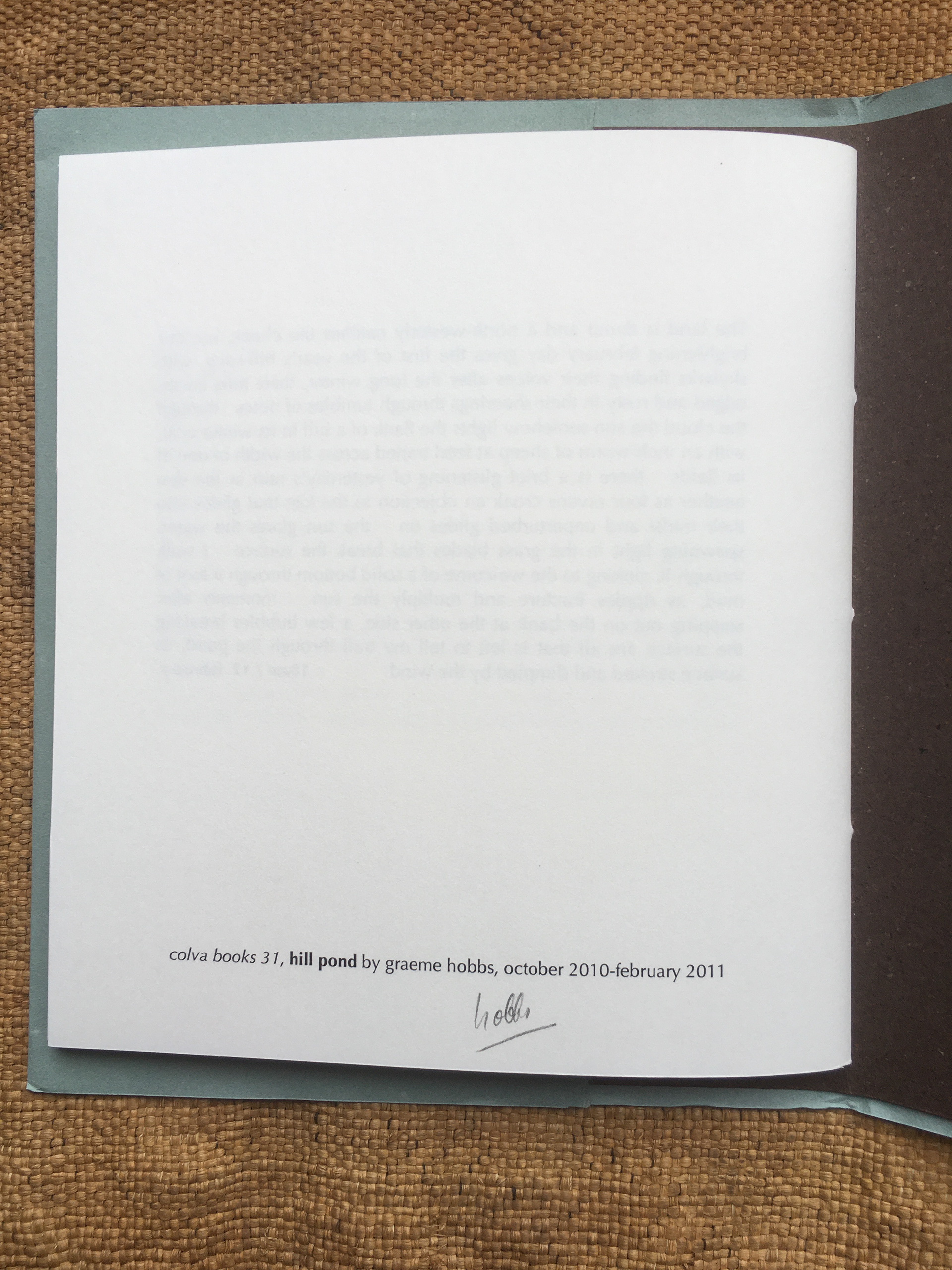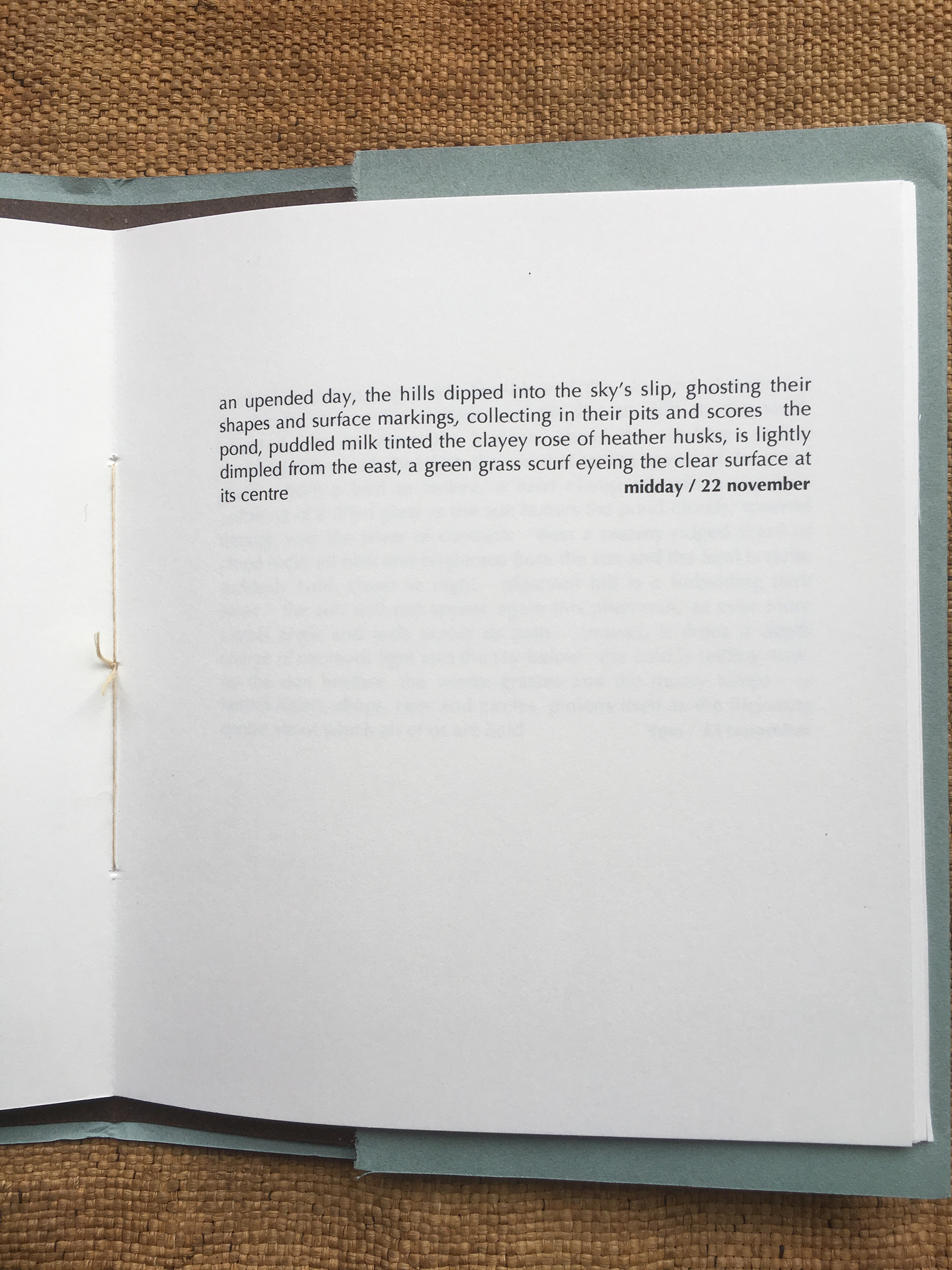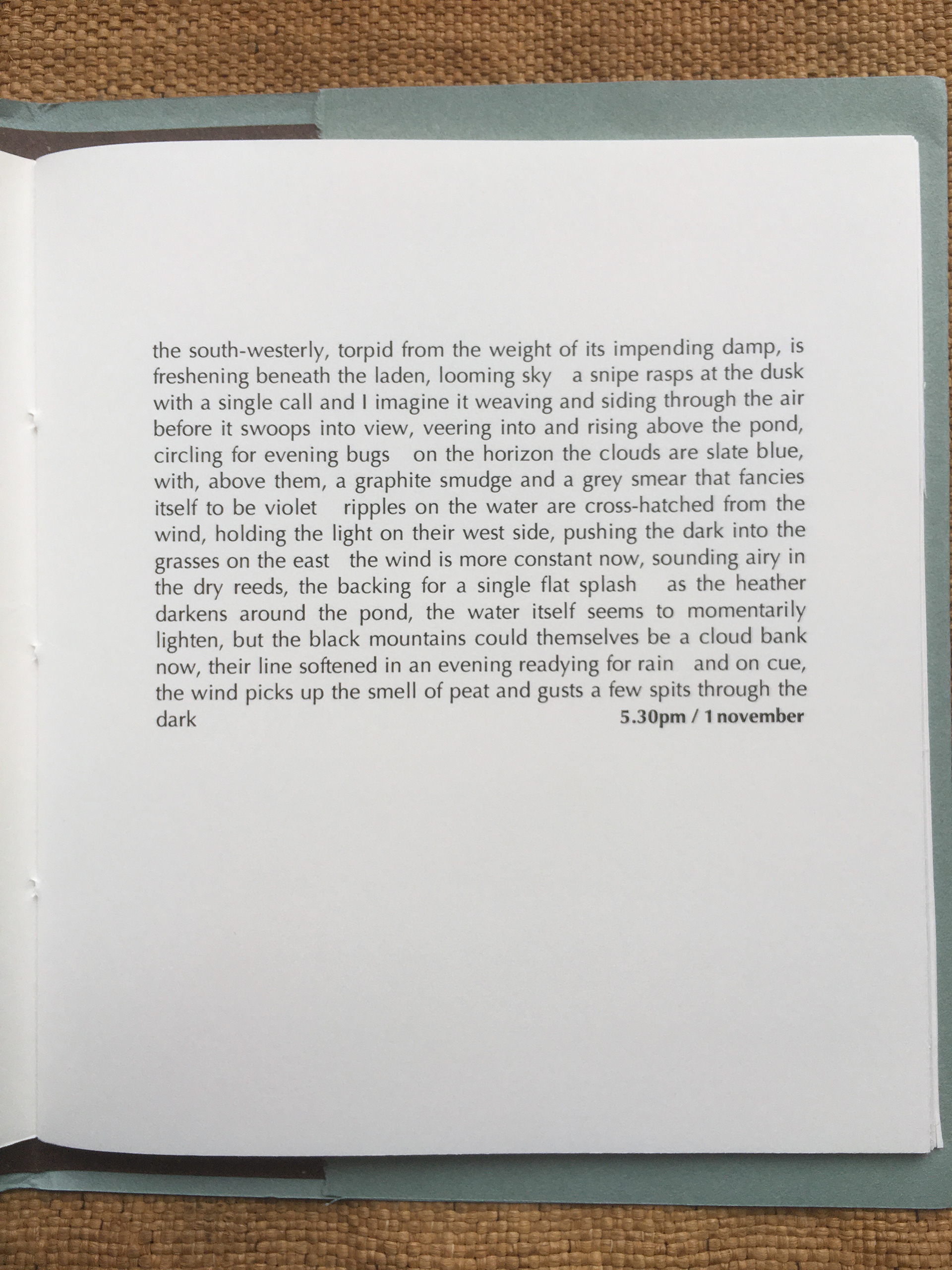 The booklet itself underwent a process of ever greater simplification as I put it together, its concessions to decoration now limited to its pale blue-green wrapper that references the colour of a lichen that I regularly found on my walks, and the colour of the title itself, that of dark winter heather. Full stops in the seventeen pieces of writing somehow went missing along the way too, replaced instead by gaps in the text, which hopefully have the function of regulating the pace at which they can be read. Unsurprisingly, these descriptions are as much about the sky and the wind as they are about the pond. Reading them again I am transported entirely to the moments of their birth, to certain patterns of cloud or conditions of light, as well as the curious newt that settled itself in a couple of inches away and watched me as I crouched by the pond to write the very first piece and a chill settled in from that morning’s rain. 18 page sewn booklet. March, 2011.