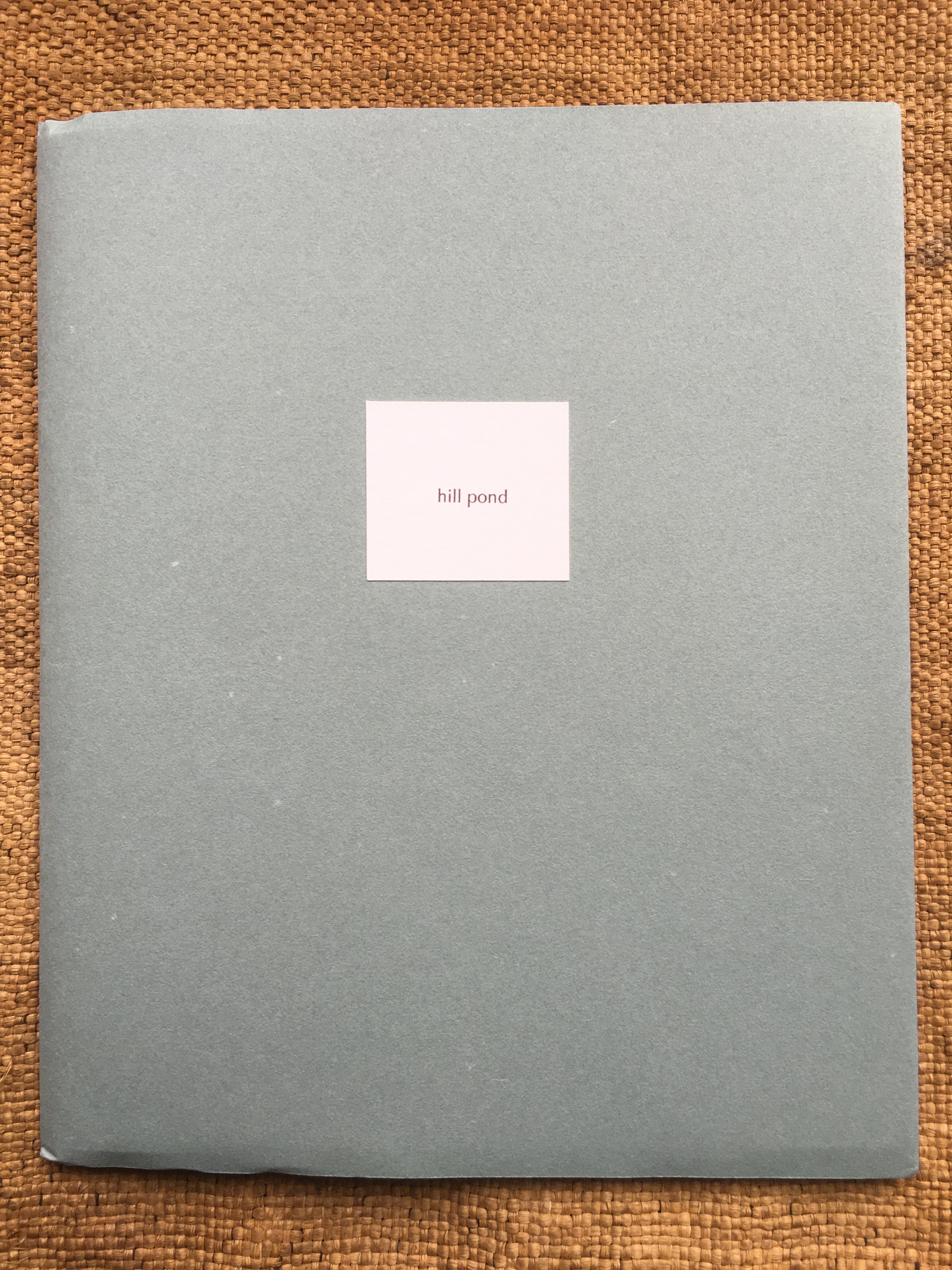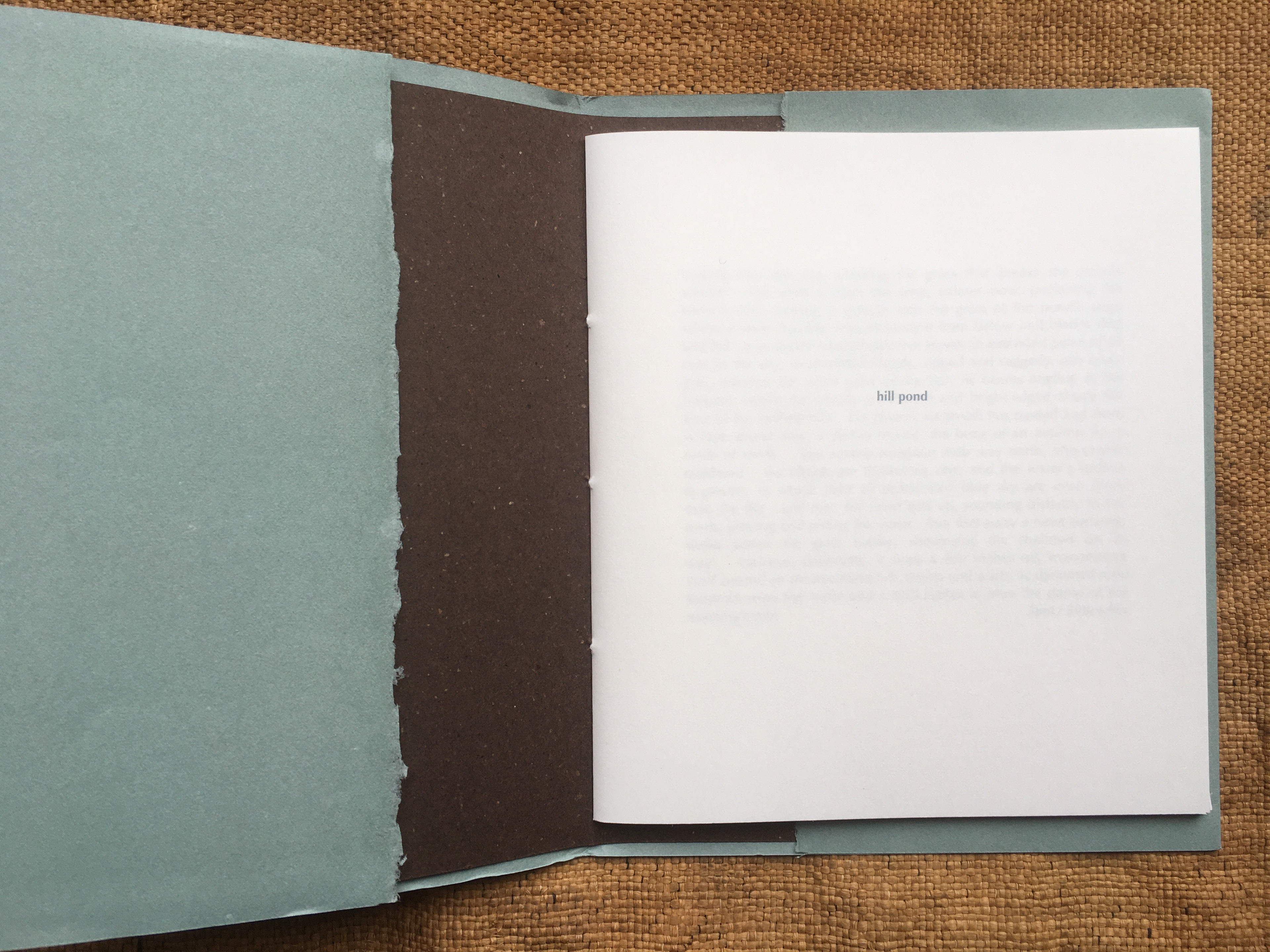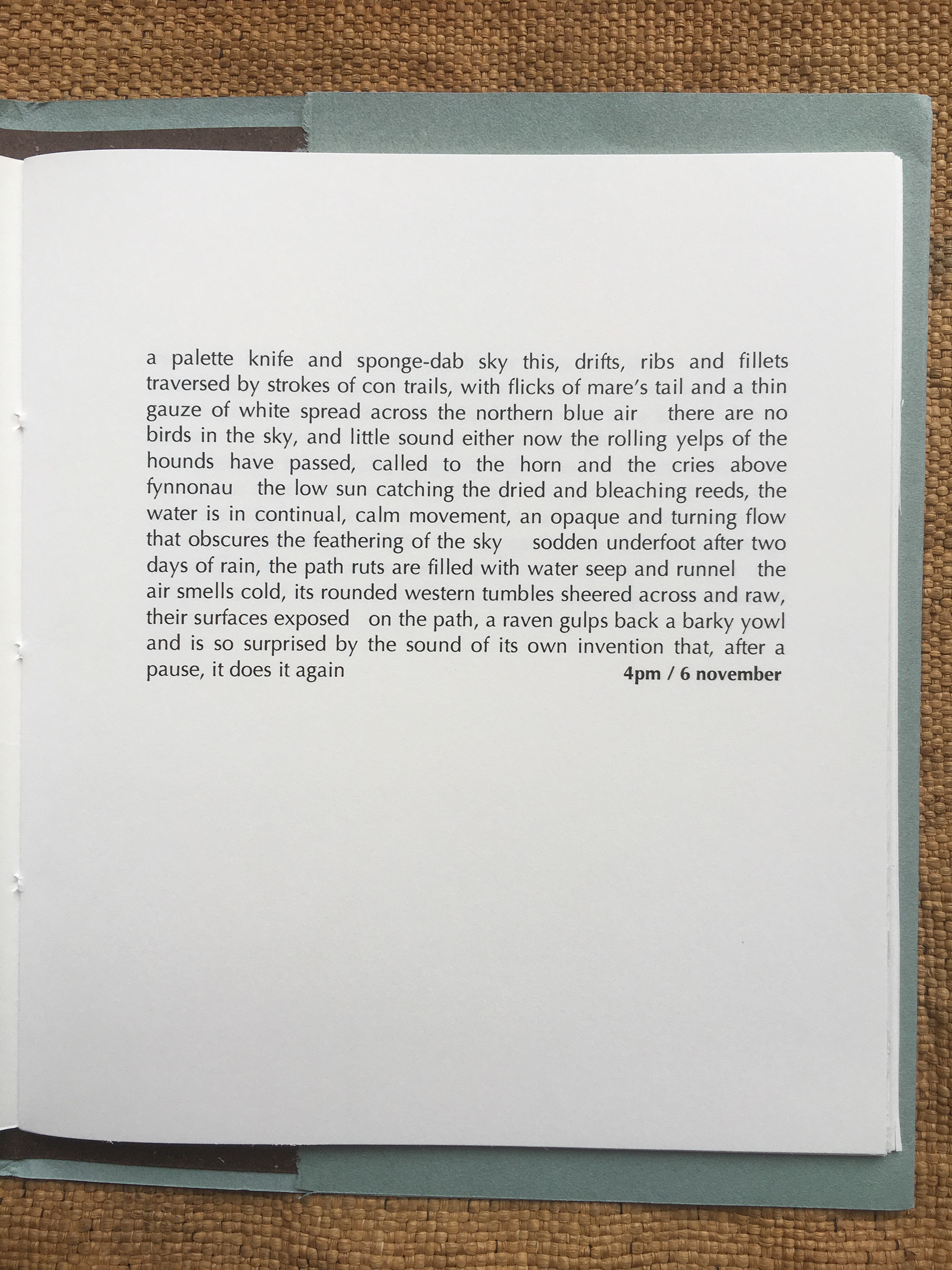 The booklet itself underwent a process of ever greater simplification as I put it together, its concessions to decoration now limited to its pale blue-green wrapper that references the colour of a lichen that I regularly found on my walks, and the colour of the title itself, that of dark winter heather. Full stops in the seventeen pieces of writing somehow went missing along the way too, replaced instead by gaps in the text, which hopefully have the function of regulating the pace at which they can be read. Unsurprisingly, these descriptions are as much about the sky and the wind as they are about the pond. Reading them again I am transported entirely to the moments of their birth, to certain patterns of cloud or conditions of light, as well as the curious newt that settled itself in a couple of inches away and watched me as I crouched by the pond to write the very first piece and a chill settled in from that morning’s rain. 18 page sewn booklet. March, 2011.