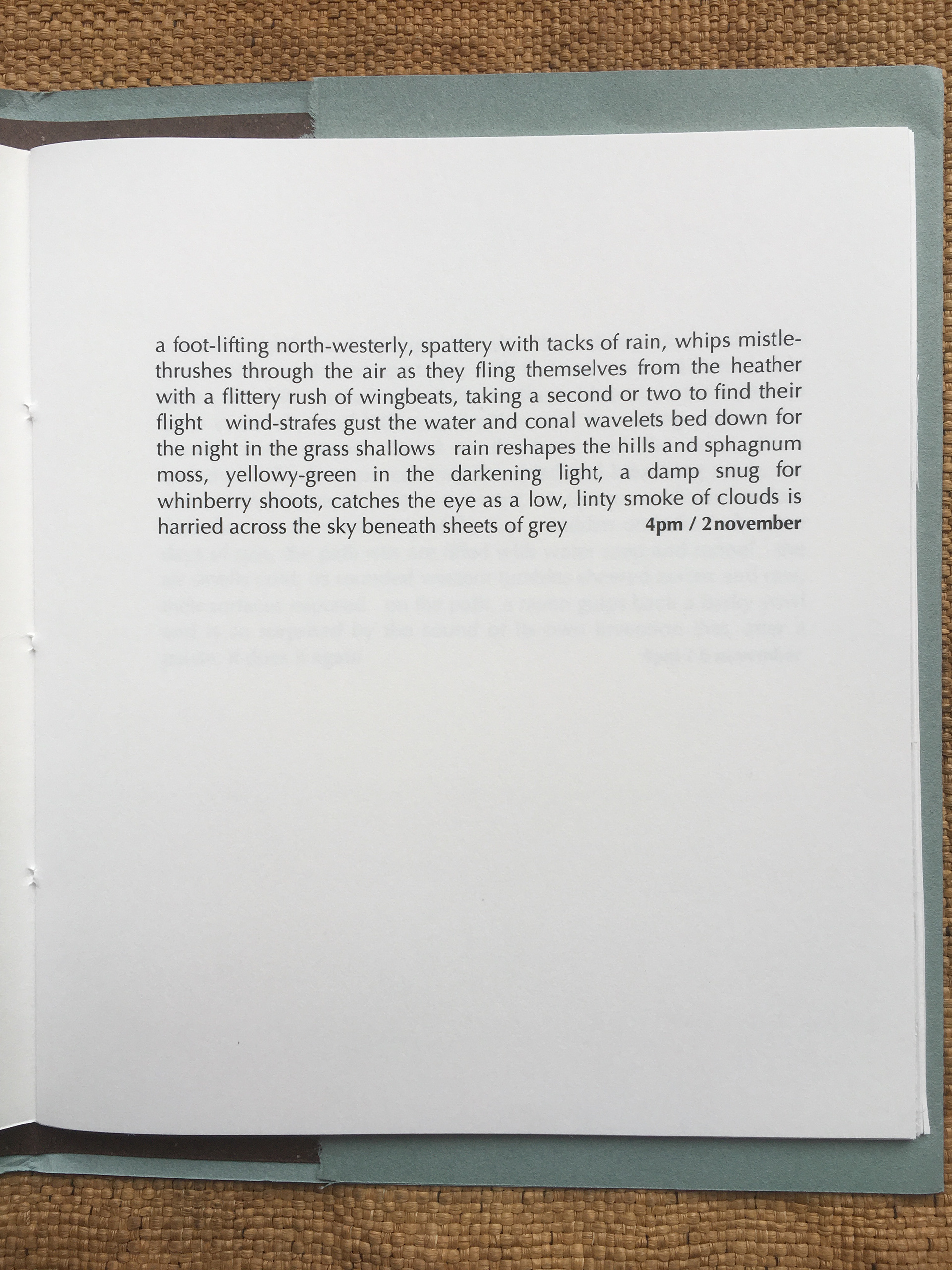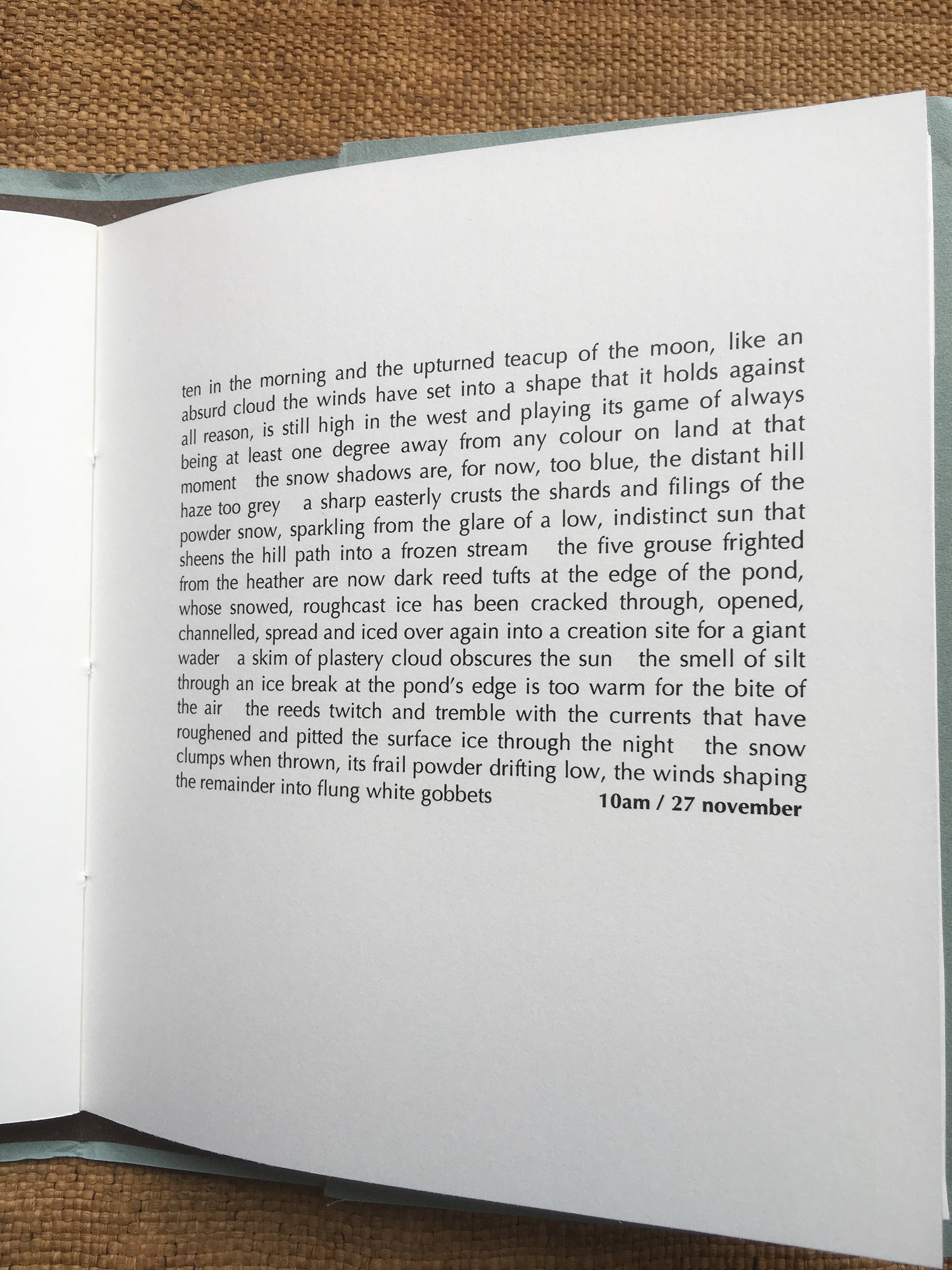 The genesis of this booklet was both a photograph I took of a small hill pond on the moor above our old house, and my disgust at such an unsatisfactory action being my initial reaction to the scene. Briefly, taking a photograph seemed to me trite and disrespectful, and involved little or no real exchange between me and the place itself. Hence I conceived a book of written descriptions in lieu of photographs, descriptions written in situ which allowed duration and peripheral vision to seep into the scenes. After a while, the exercise moved into the area of questions concerning originality and repetition in a series (a question more apparent when words rather than images are the medium), as well as serving as a meditation on what photography cannot show. I visited the same spot, about 40 minutes walk away, at different times of day and night and in different weathers, from October 30th, 2010 to the first day of skylark song on the hill, on February 12th, 2011.