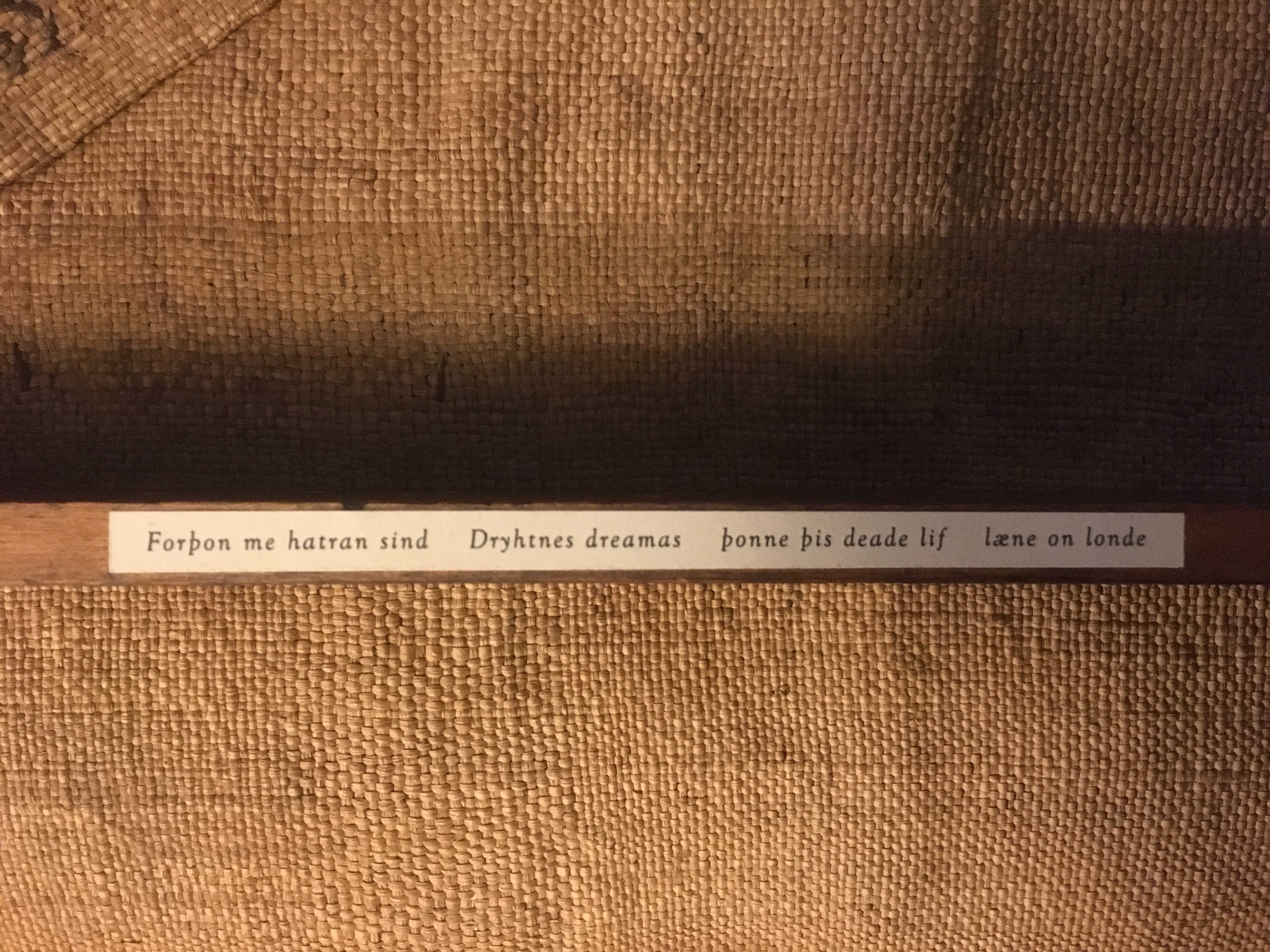 I wanted to do something with the dried seedheads of the Welsh poppy, which I have allowed to proliferate in our garden walls and paving. Sometimes they weather to look like tiny wizened hands, but here I have utilised their resemblance to the hulls of boats, or dugouts perhaps. The backing, from which they set out on their journey, is a section of an old wooden measuring rule. The work is, of course, extremely fragile, as strong only as the dried stalks, the symbolism apt for the horribly recurrent news which inspired it, of desperate people setting out to sea. The words on the top of the piece (Forþon me hatran sind / Dryhtnes dreamas / þonne þis deade lif / læne on londe) are taken from the Anglo-Saxon poem, The Seafarer, and though written in an entirely different context over a thousand years before, they are fitting. There are many translations of the words; my own version is: ‘Dearer to me my Maker’s dreams than this fleeting mortal life’.