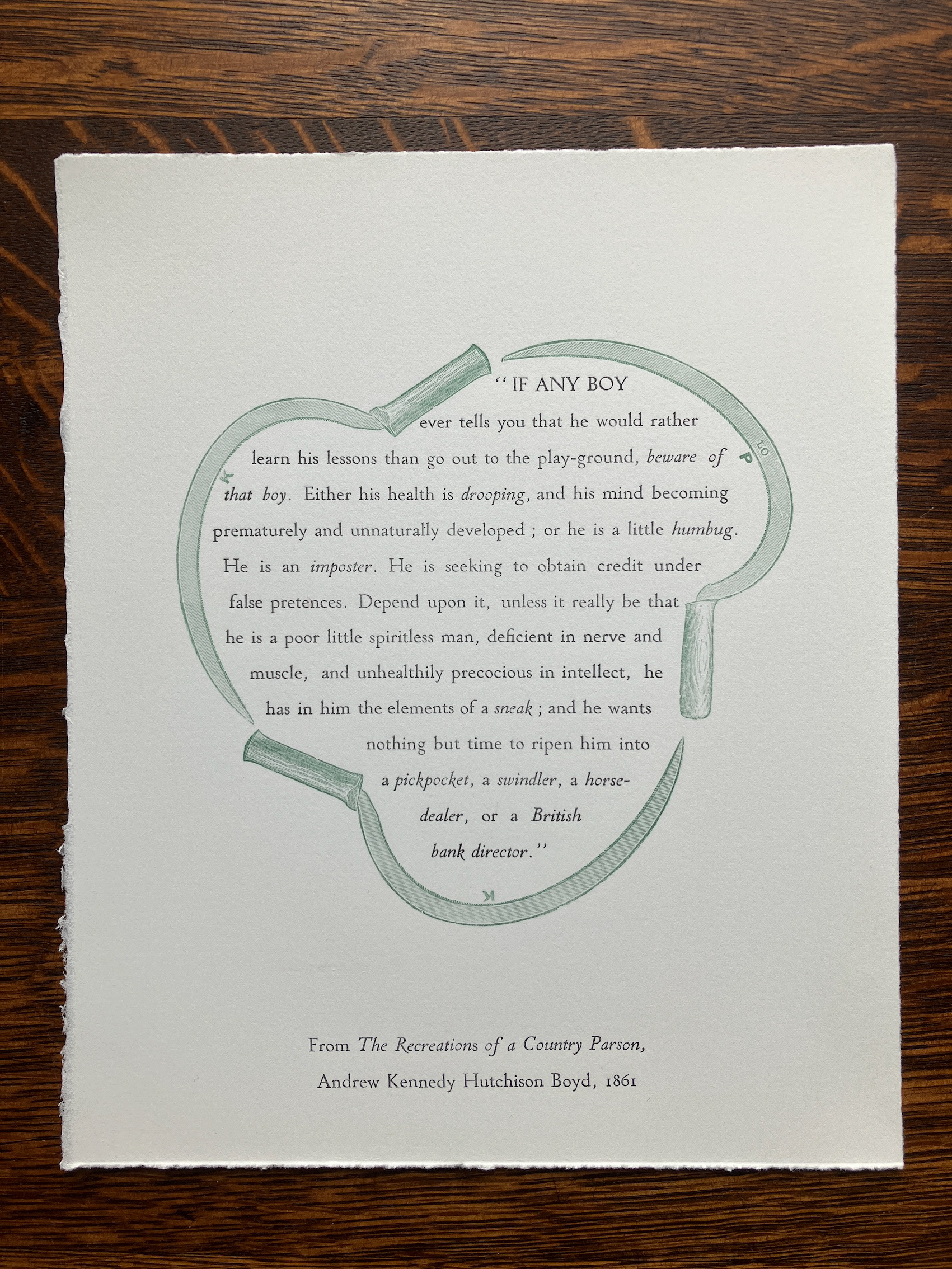 This was, it has to be said, a bit of a tester to print. Because of its size, and having to re-use one of the images of the sickles twice, it ending up going through the press five times; consequently, I ended up with fewer usable prints than I started with! All that being said, the quote – from a book I picked up in Hay market one day – was far too good to go to waste, so here is ‘If Any Boy ... ’ in an edition of just 12 hard-won prints. February 2023.