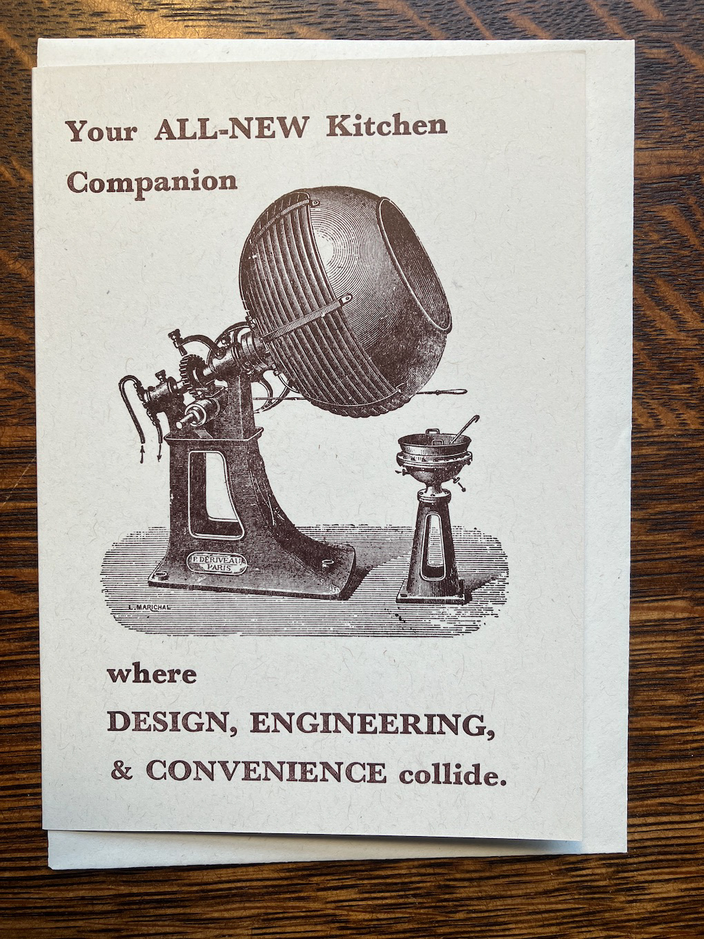 This extraordinary image - depicting the meeting between a culinary cement mixer and a soup tureen - was printed from an antique block which appears to be from the 1910s. The words are mine.