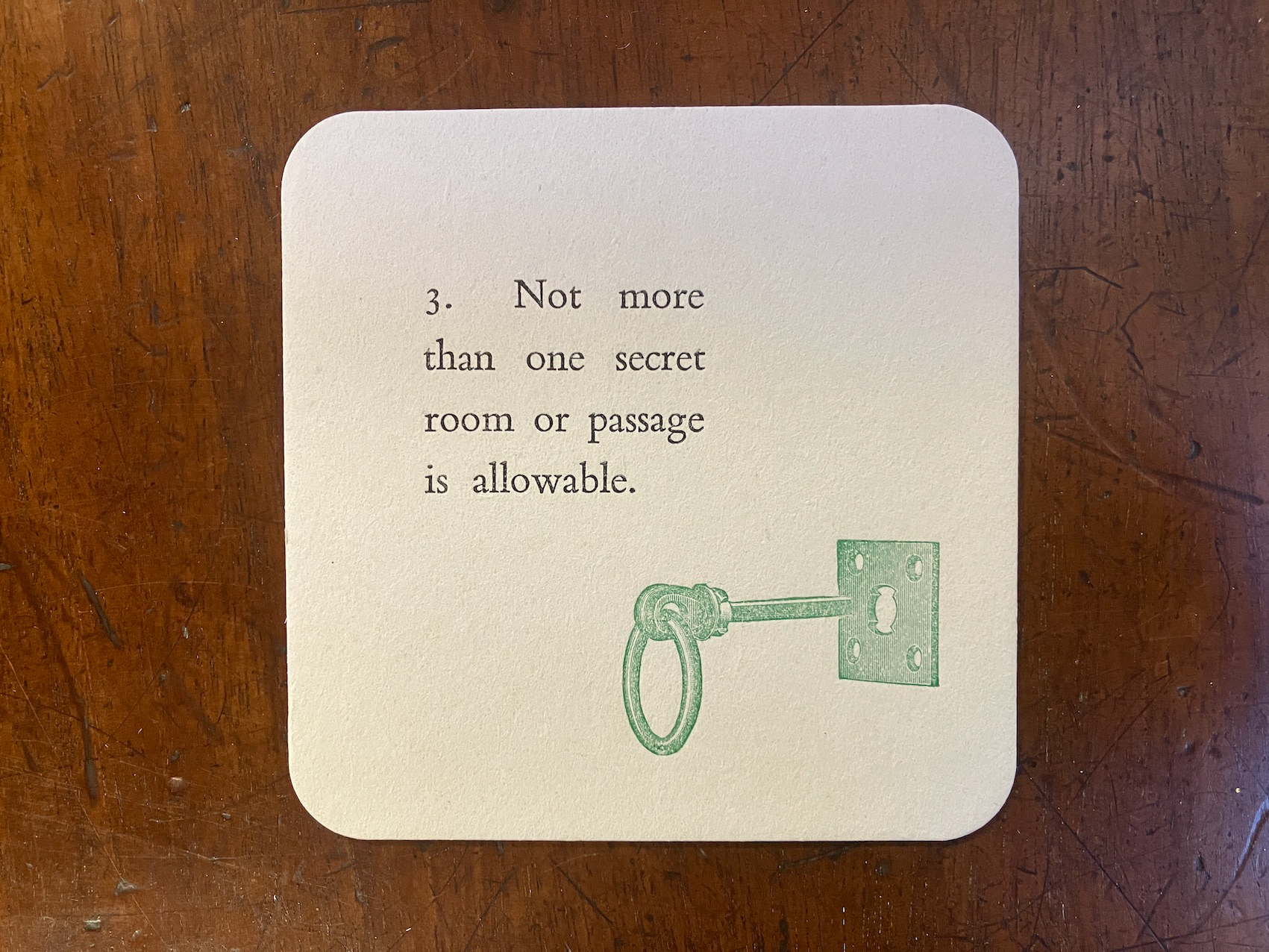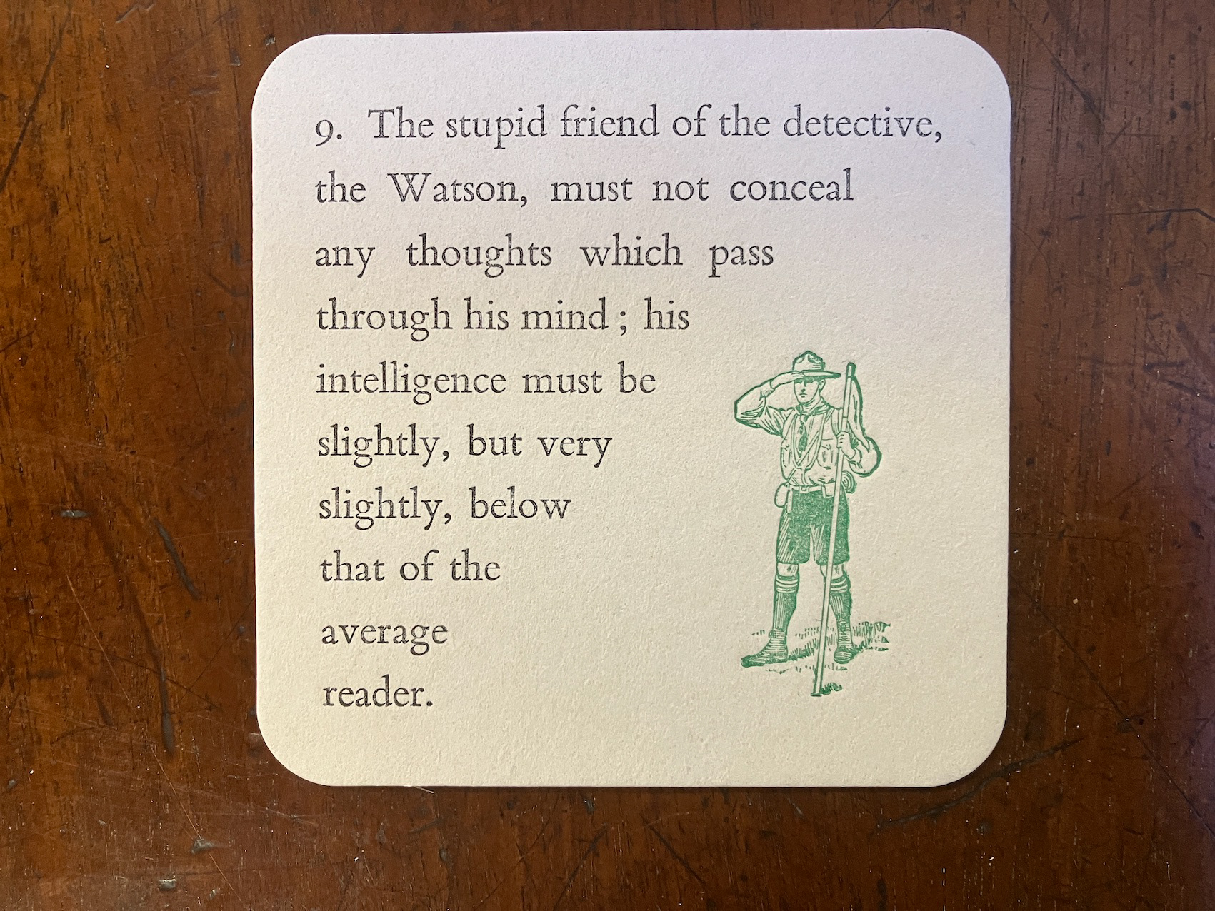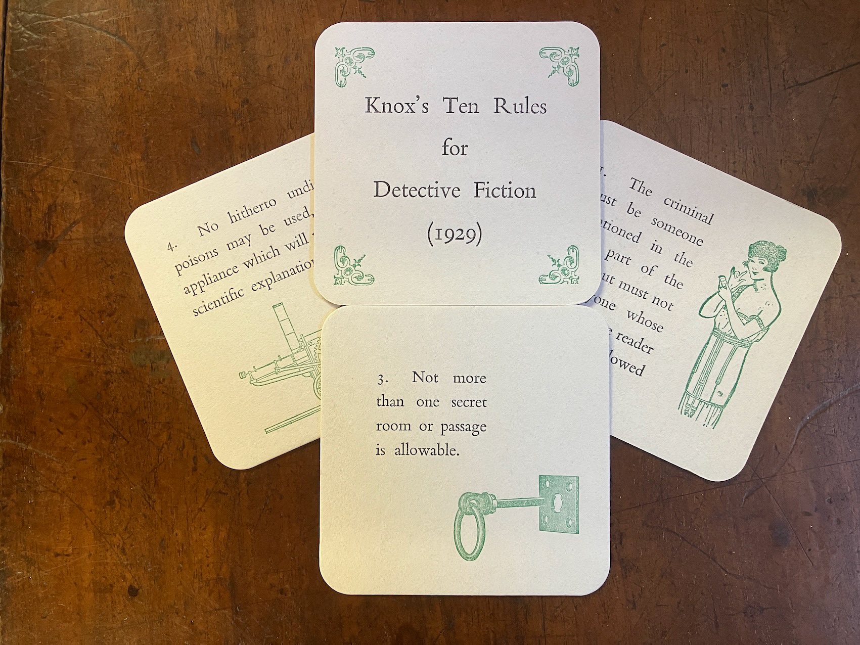 In 1929, Ronald Knox, Catholic priest and writer of detective stories, laid down 10 rules for the writing of crime fiction that would fairly allow the reader to attempt to solve the mystery before the detective in a novel. Here they are printed up in the form of beermats, with the rules paired with appropriate imagery. Set of 11 beermats.