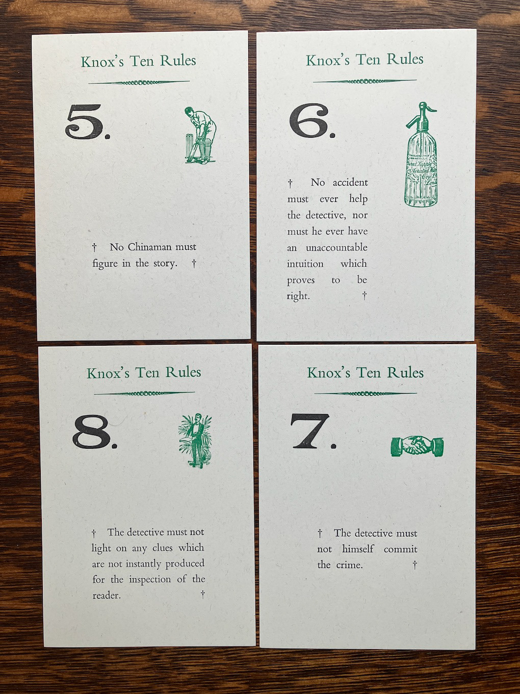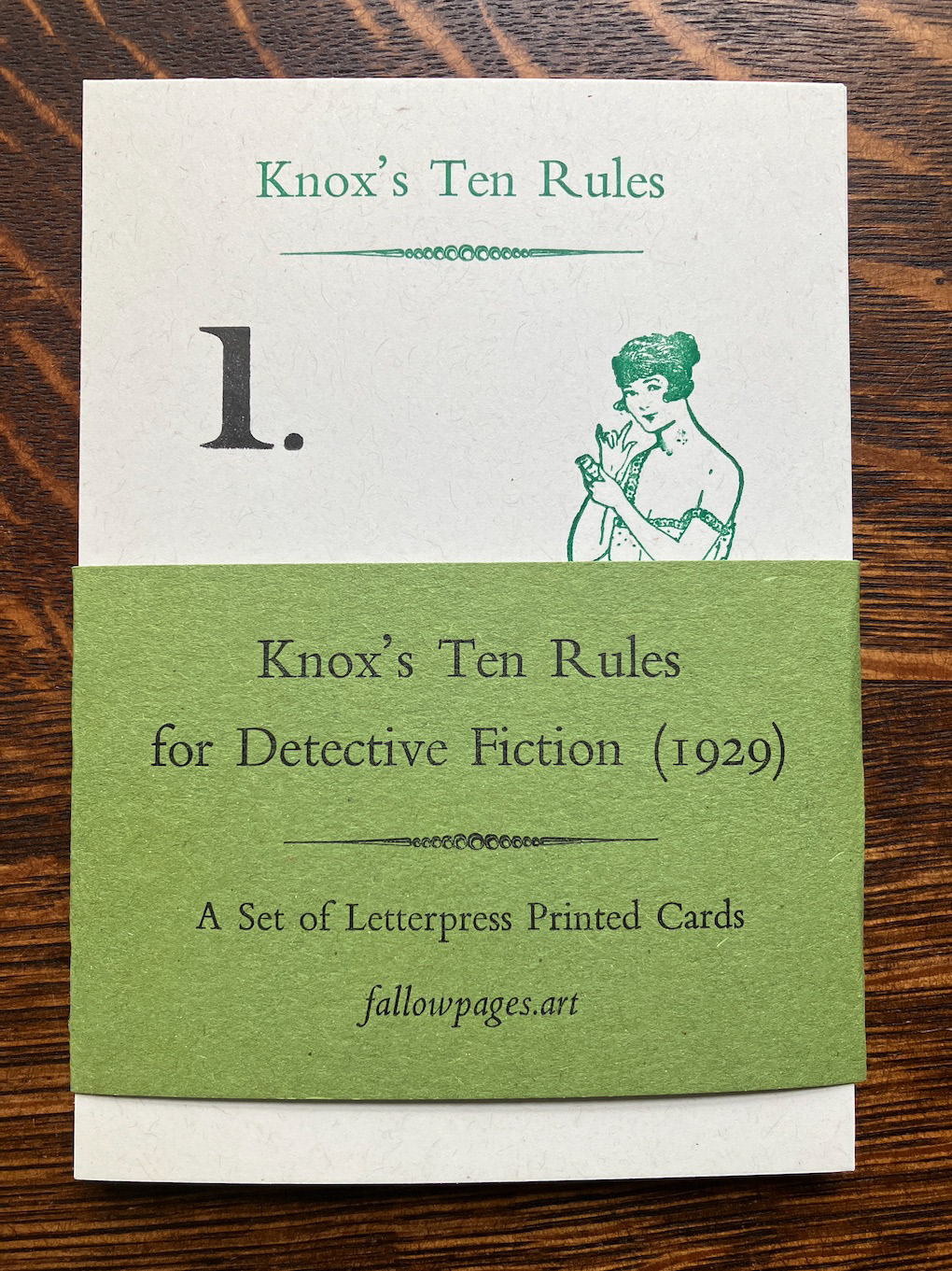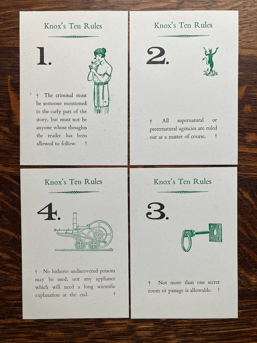 Last year I made a set of beermats featuring 'Knox's Ten Rules for Detective Fiction', which Ronald Knox – Catholic priest and writer of detective stories – laid down in 1929 as rules for the writing of crime fiction that would fairly allow the reader to attempt to solve the mystery alongside or before the detective in a given novel. These having sold, I wanted to reprint the rules in a new format, so made them up as a set of postcards.