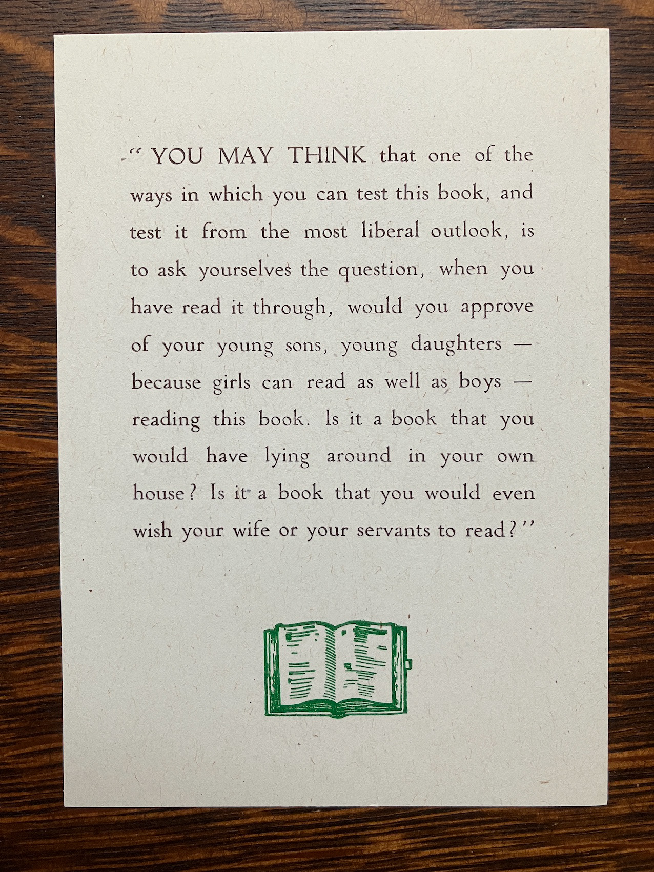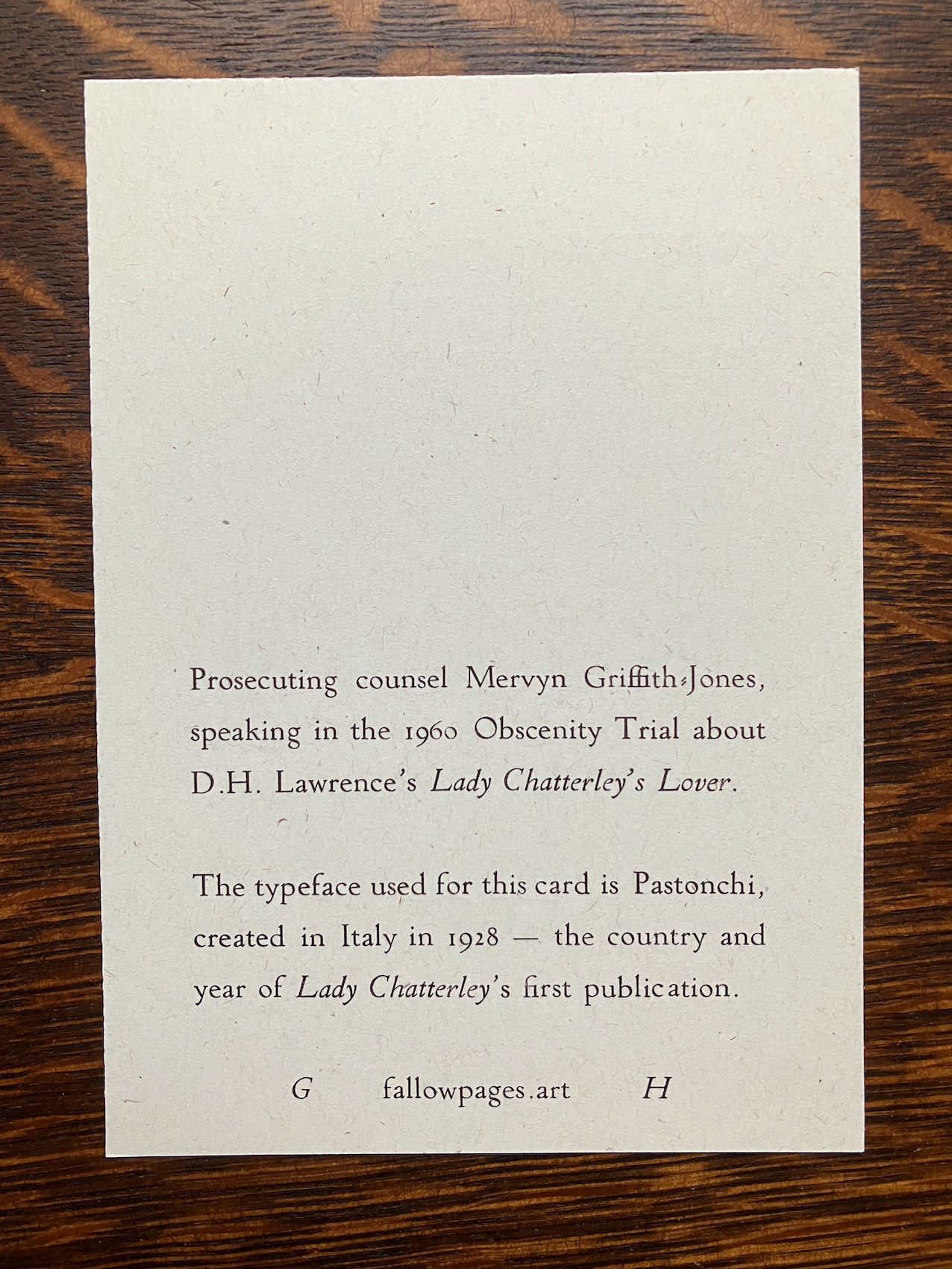 The address from the prosecuting counsel, Mervyn Griffiths-Jones, to the jury in the 1960 Obscenity Trial over D.H. Lawrence's Lady Chatterley's Lover. Appositely, the typeface used for the card is Pastonchi, which was created in Italy in 1928 – the country and year in which Lady Chatterley's Lover was first privately published.