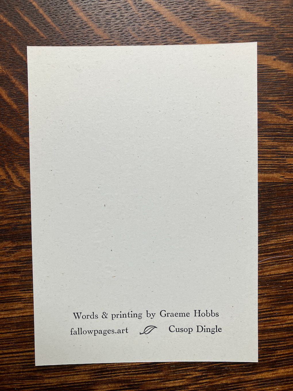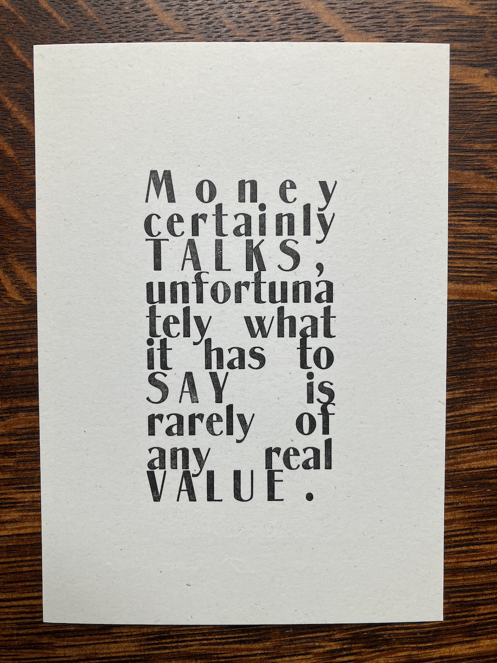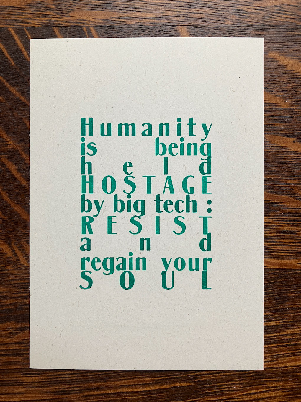 This phrase about money had been rolling around my head for a while, with me visualising it as a collapsed pile of words - I just needed to work out how to print it! It required a couple of runs through the press, printing the alternate lines separately, and when it was done I used the set-up to print the 'internet' card as well. And now, a few weeks later, to go with Money and the Internet, comes Big Tech. I don't like doing preachy cards - I generally avoid them in fact - but in this case the facts are so clearly evident and the effects so deleterious that I felt it justified.
