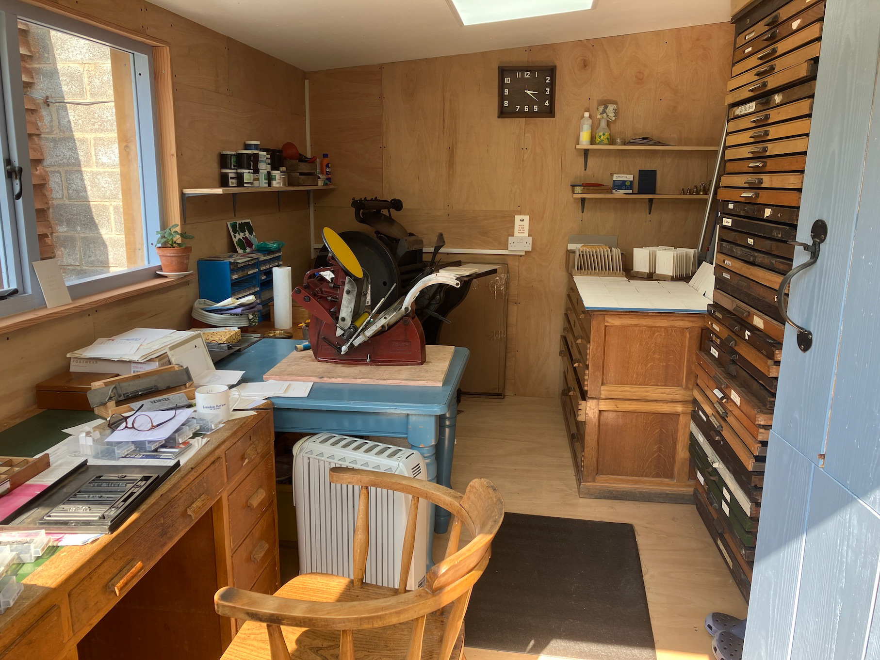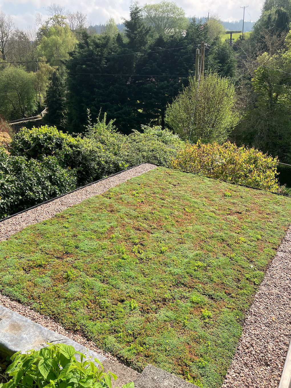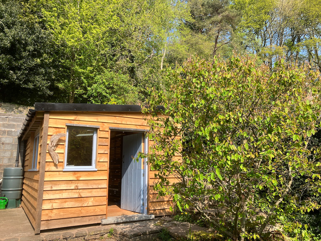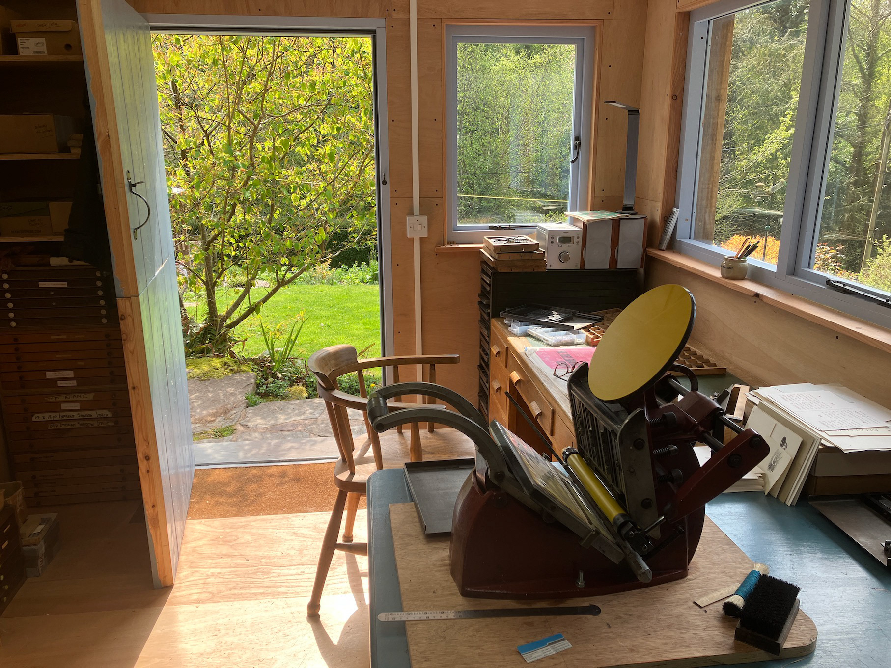Some pictures, taken in April 2025, of my new print shed, with sedum roof, in the garden. This is where things are printed to the continual accompaniment of the Dulas Brook.
