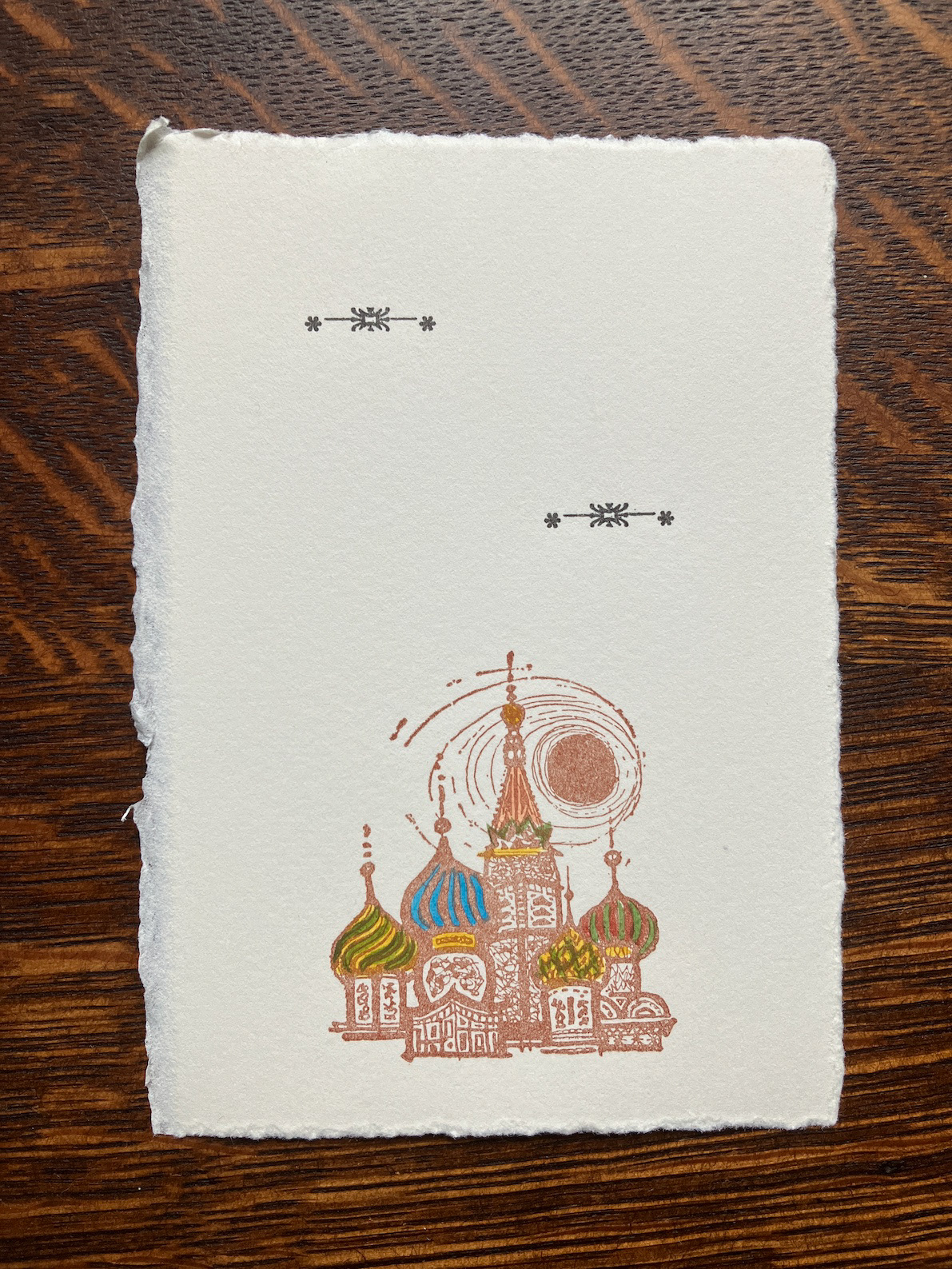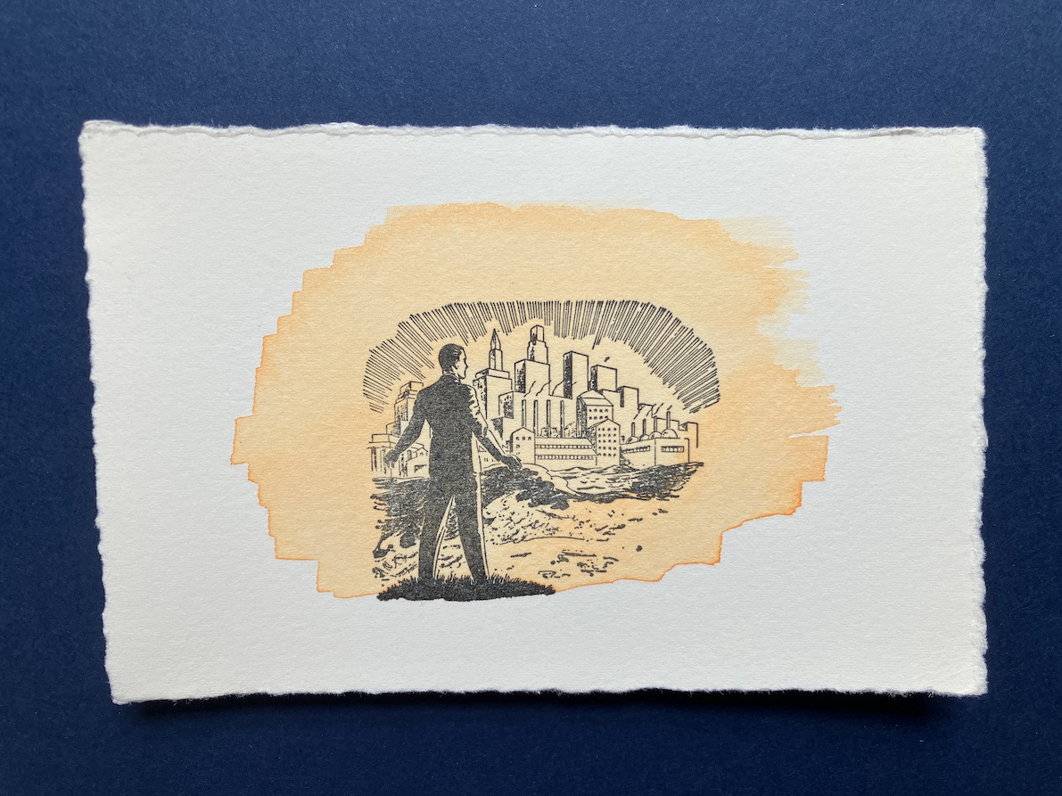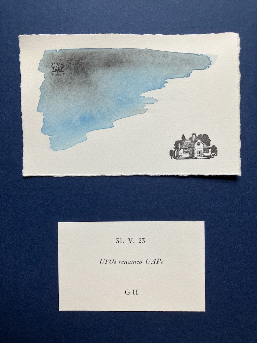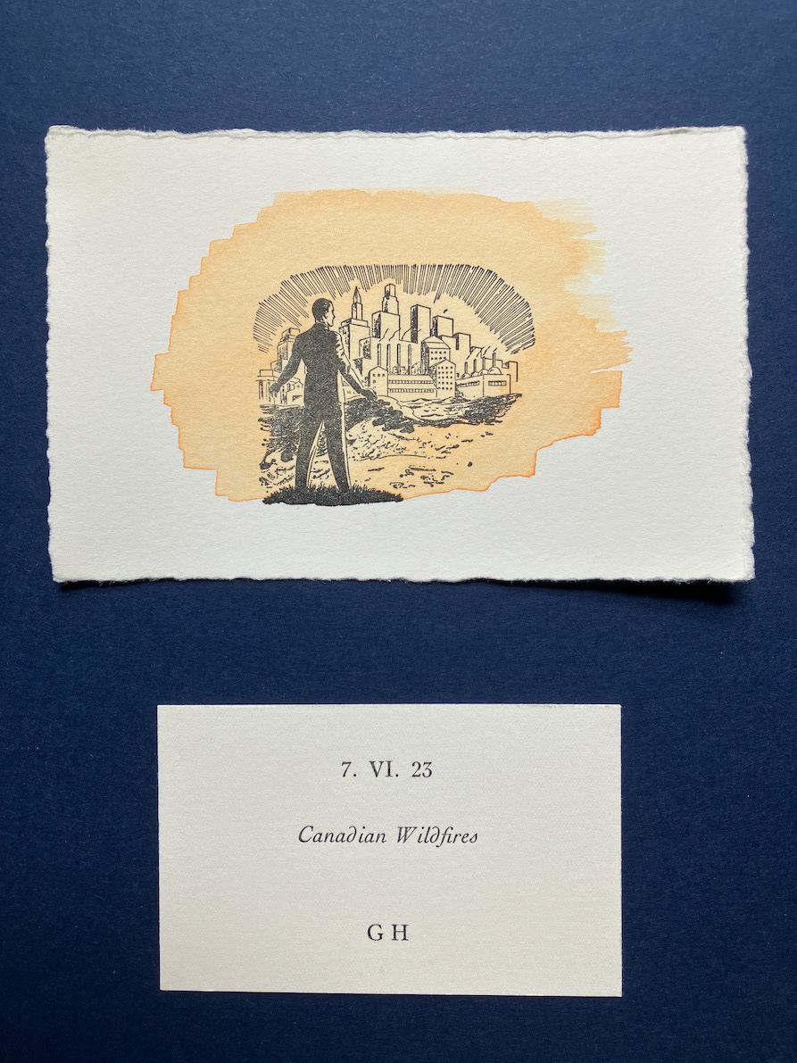I was recently given a small collection of type and ornaments, which meant that after making what little I had go a long way for quite some time, I no longer fully knew what I had to hand. I realised I need a project that would acquaint me with it and so conceived these ‘Occasionals’, in which I respond fairly immediately and with whatever I have to hand to various newsworthy events. It is an ongoing project; here are the six I have printed and painted so far: 1 - Drones over the Kremlin, 2 - The Coronation of King Charles III, 3 - UFOs renamed UAPs, 4 - Canadian Wildfires, 5 - RAAC, and 6 - Sycamore Gap.