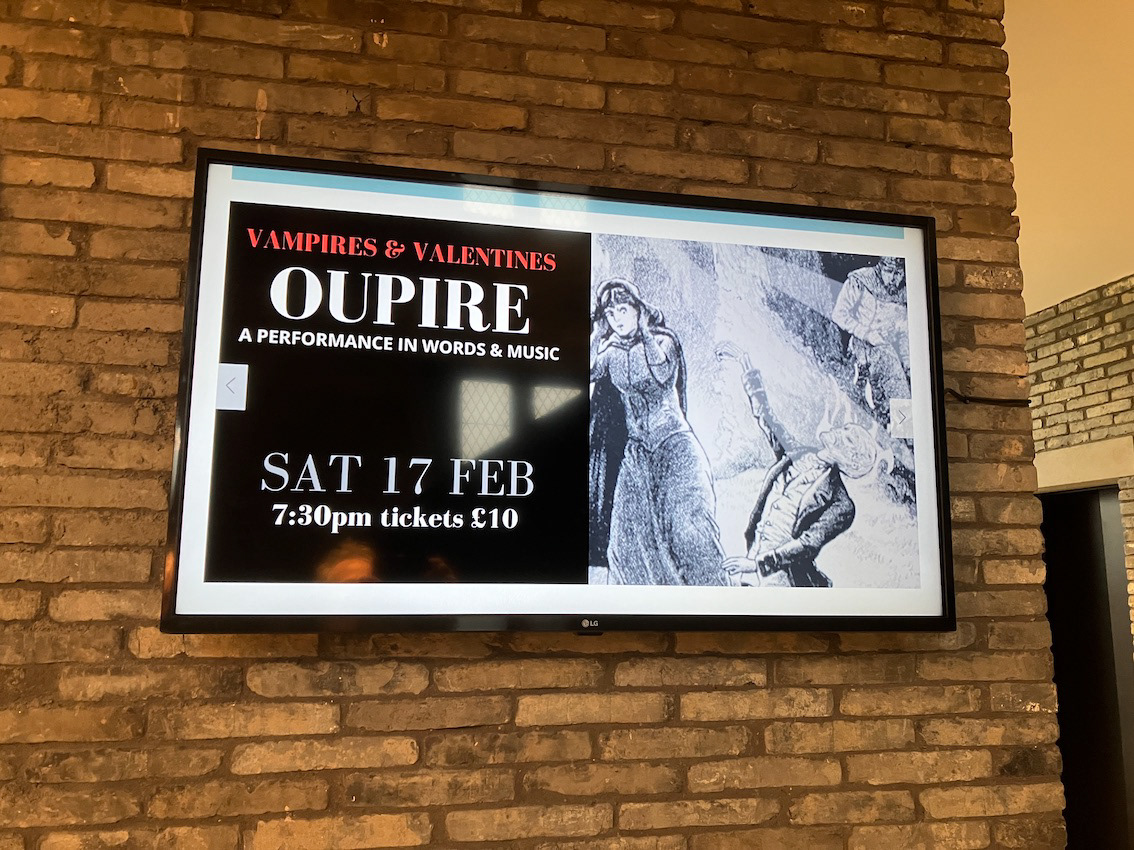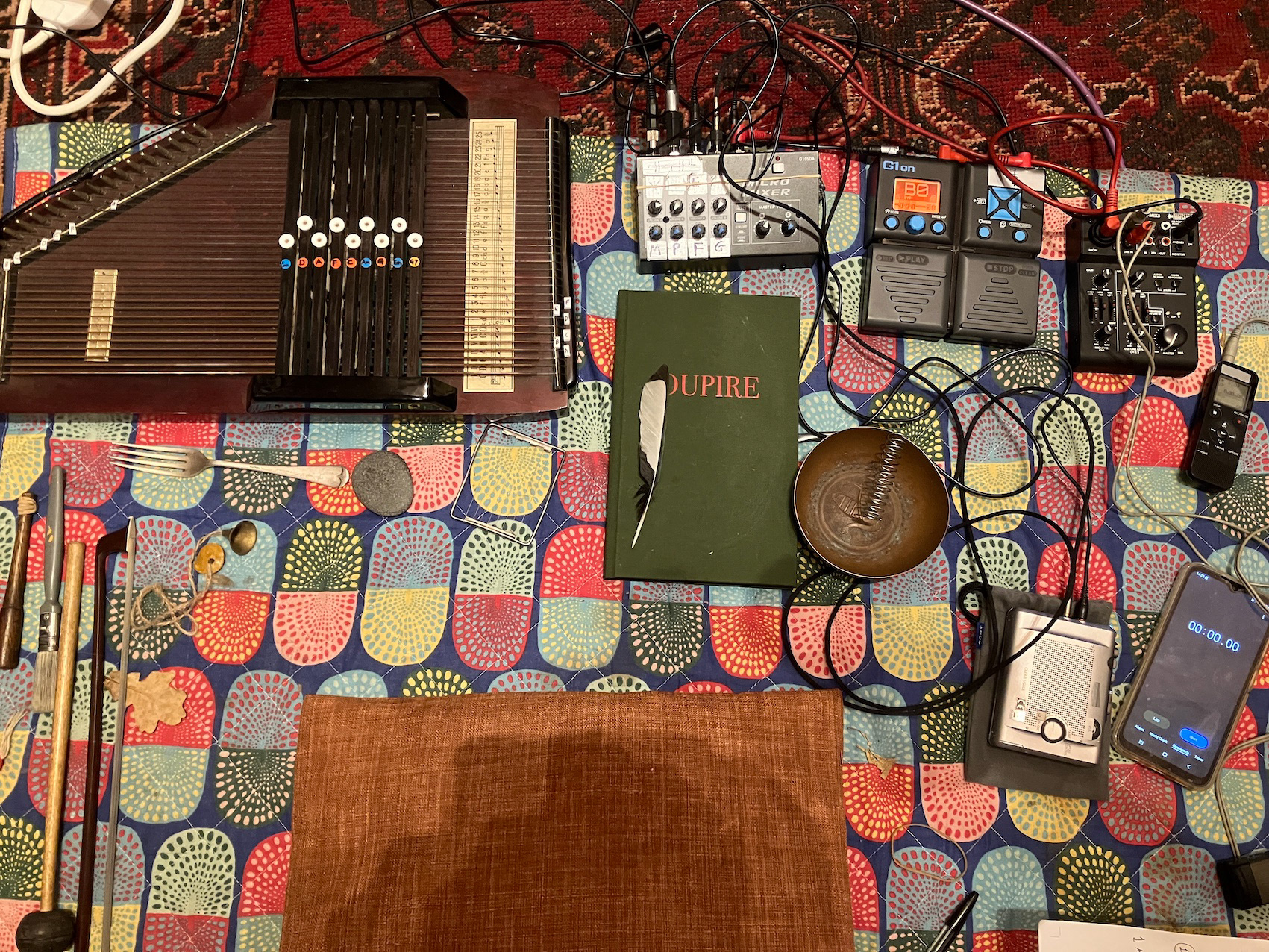 A performance of Oupire in Hay Castle on 17th February, 2024, presented as a rather twisted Valentine's Day event. When I started working on Oupire in 2018, I had in mind that it would be both a book and a performance, the words on the page intended for two voices, weaving their twined narratives of the narrator and the book around each other. The Covid pandemic prevented the performance happening earlier but I was delighted we had the opportunity to finally present it in the Great Hall of Hay Castle in a performance by candlelight. The voices, provided by me (as the book) and Gemma Aukett (as Laura, the narrator) were set against a live background of processed sound and spectral audio decay, provided by Dafydd Roberts (Listen to the Voice of Fire) on feedback loops and John Watling on auto-harp, bowl, brush, spring, fan, feather, cymbal, a few other things besides, and even the book itself. The event was sold out and packed in to the small, darkened space, creating an immersive and eerie one-off performance. I'm delighted that it was heard, as it was always meant to be.