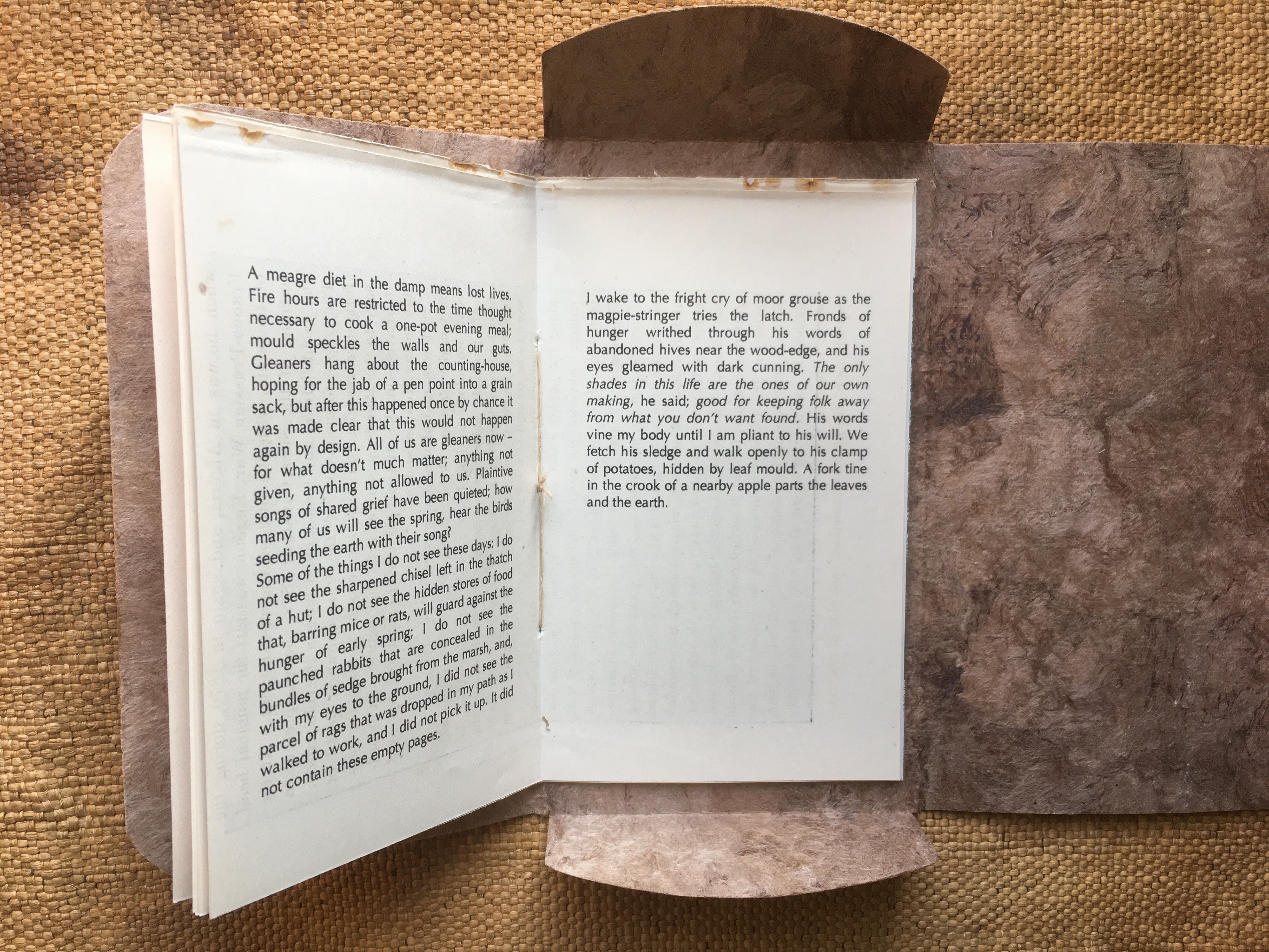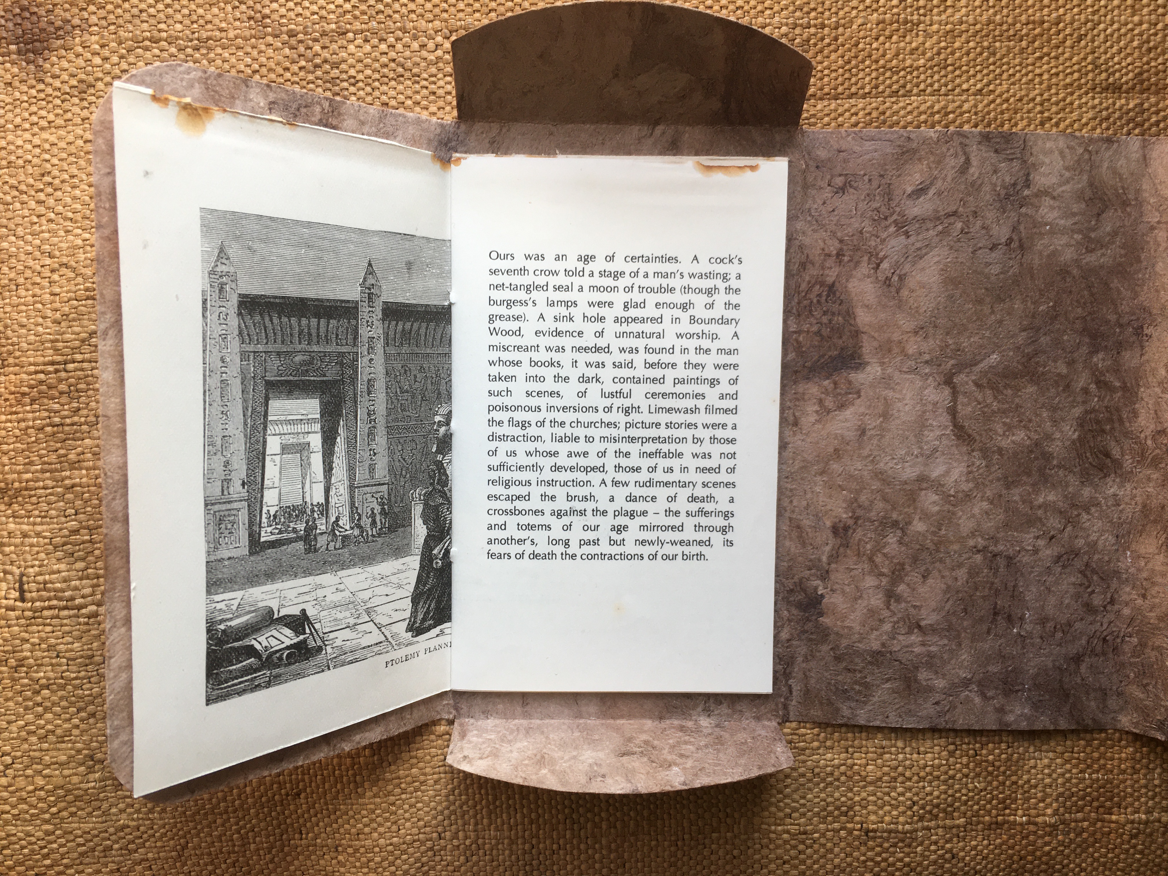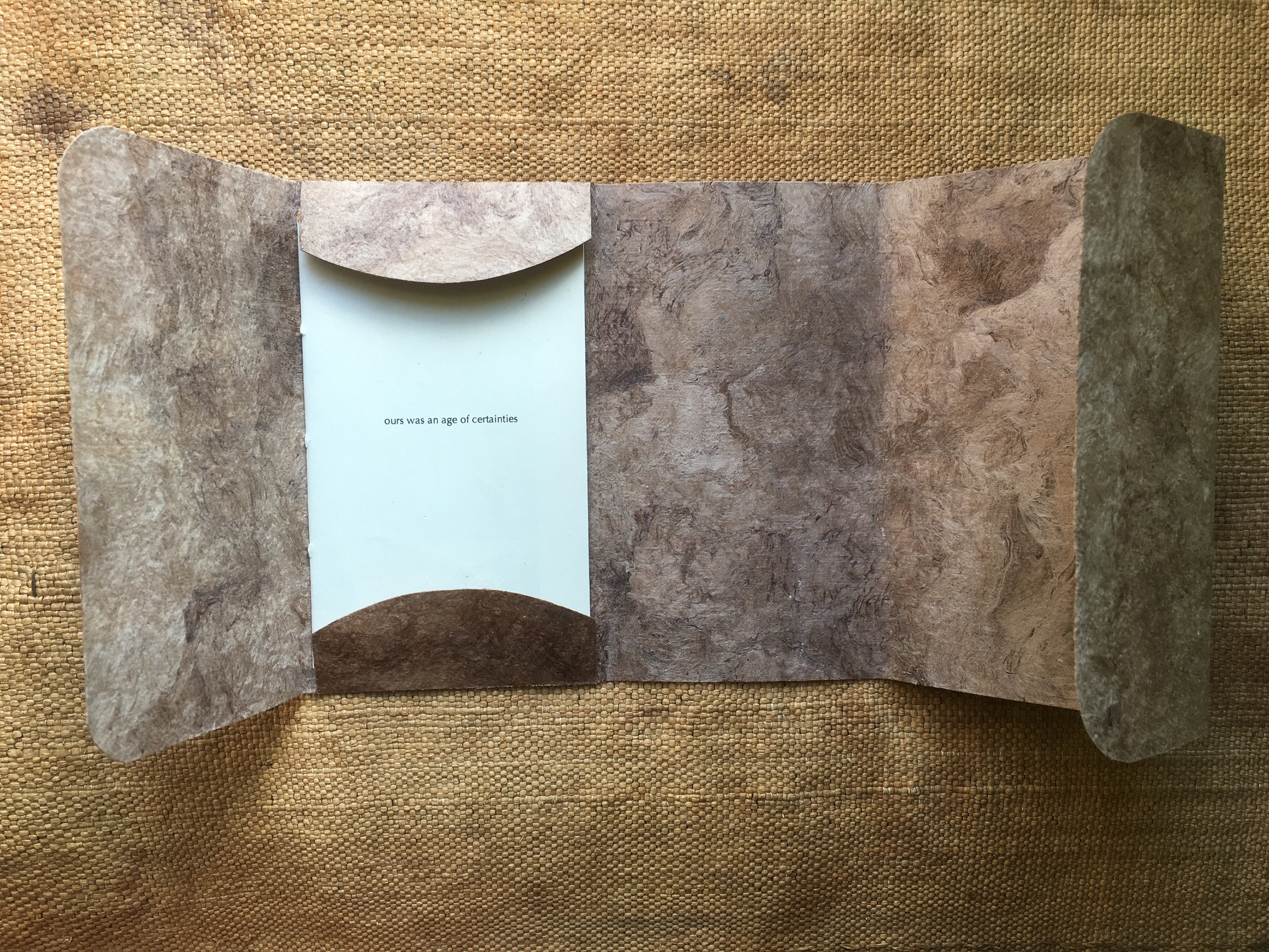 An anonymous, broken narrative from a displaced time, printed on the blank rear pages of illustrations from a discarded, foxed book, with the words pouched up into a clandestine form inspired by a ‘hussif’ pocket sewing kit. The wrapper is made from Amate tree bark paper.