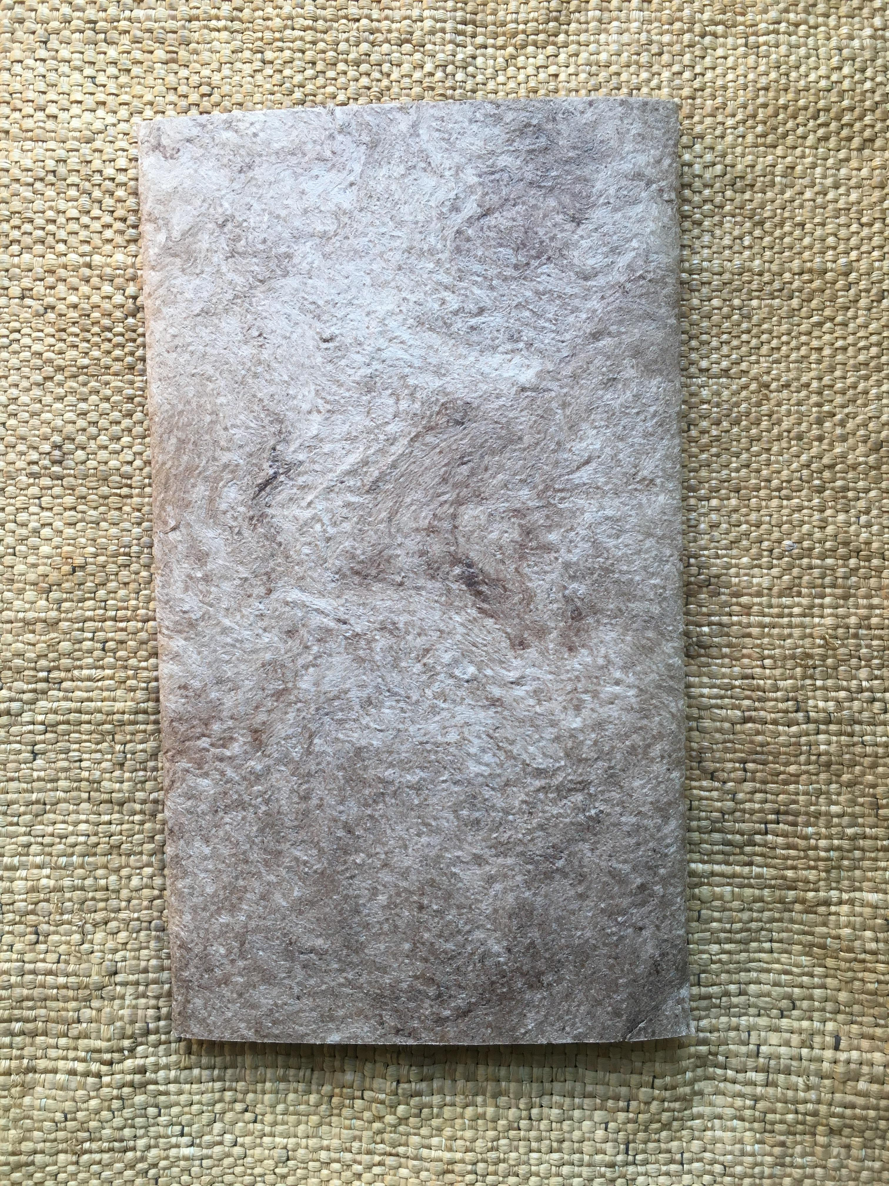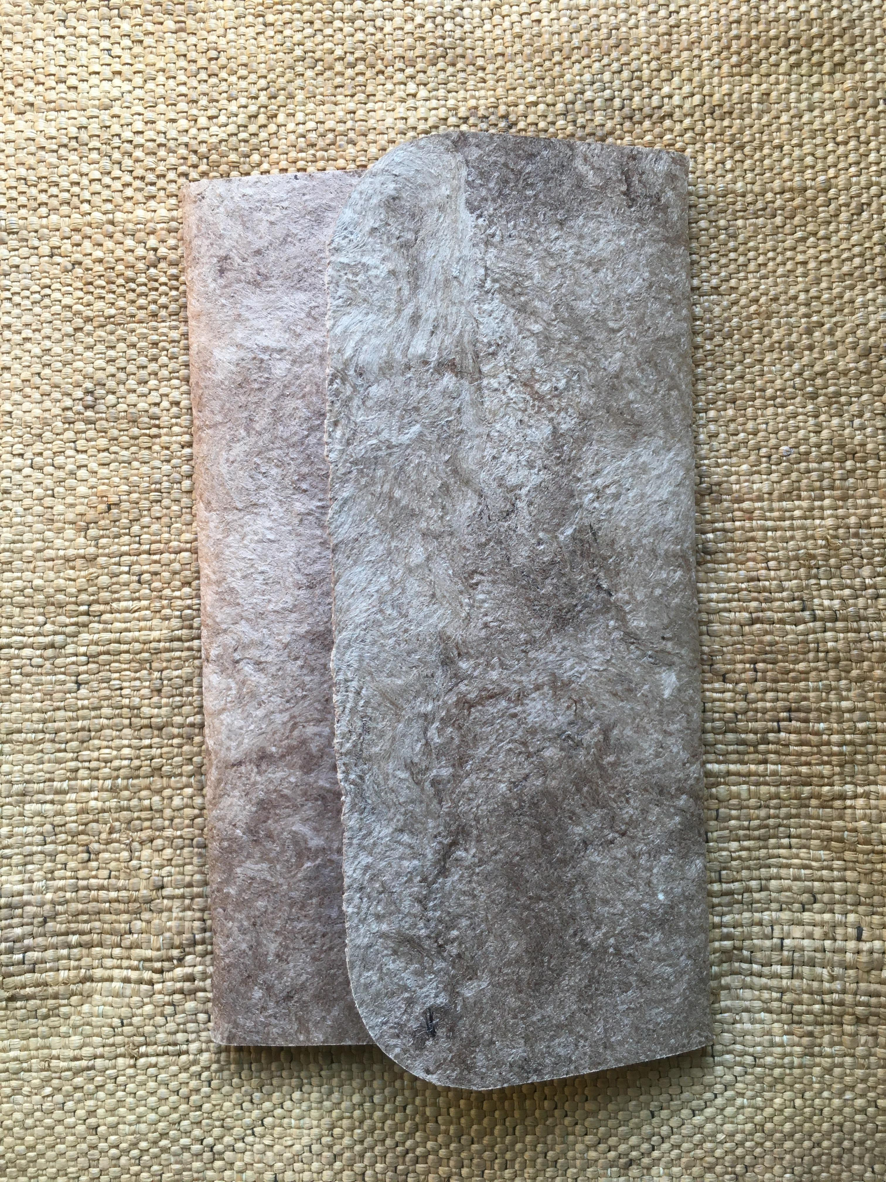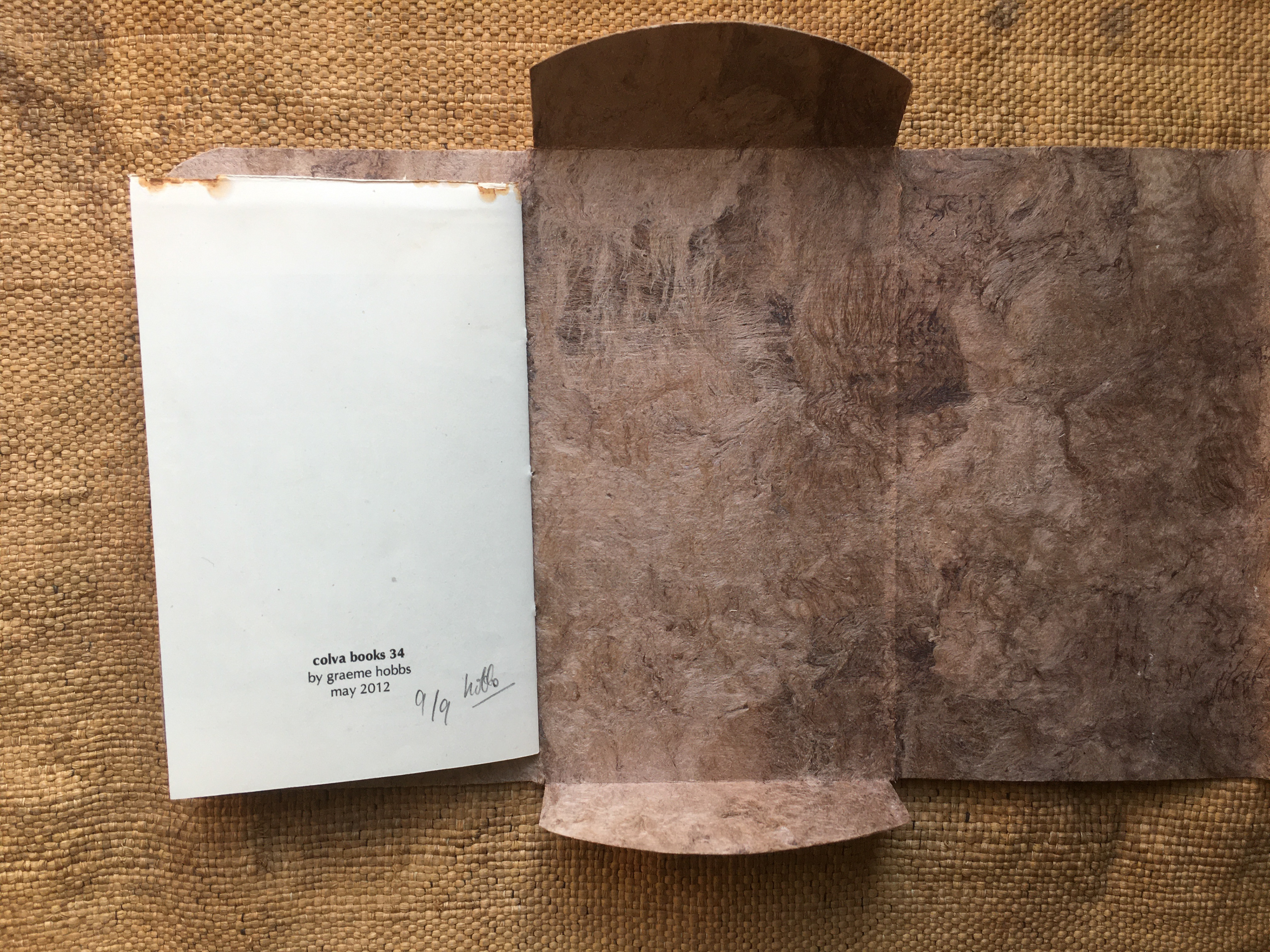 An anonymous, broken narrative from a displaced time, printed on the blank rear pages of illustrations from a discarded, foxed book, with the words pouched up into a clandestine form inspired by a ‘hussif’ pocket sewing kit. The wrapper is made from Amate tree bark paper.