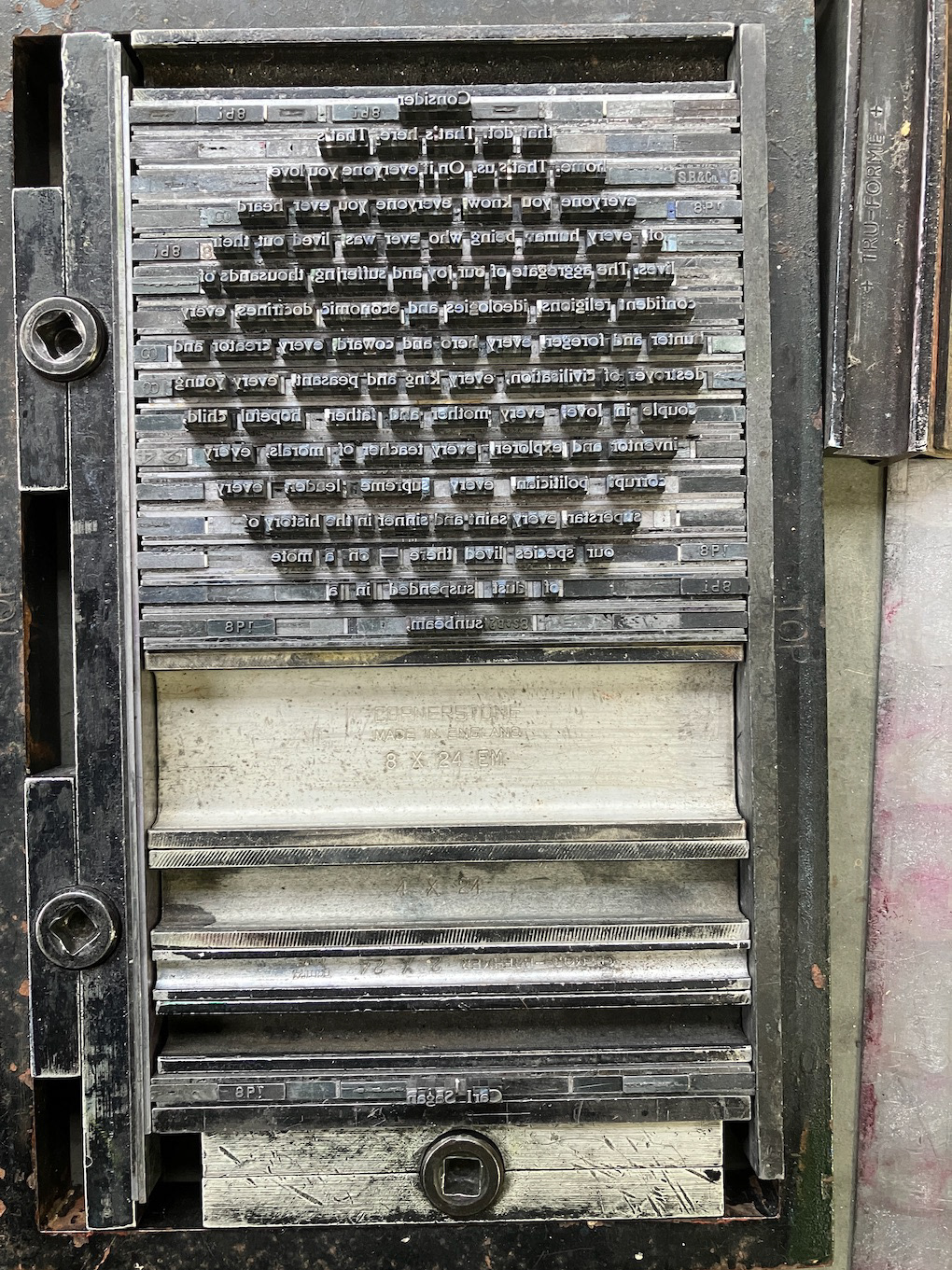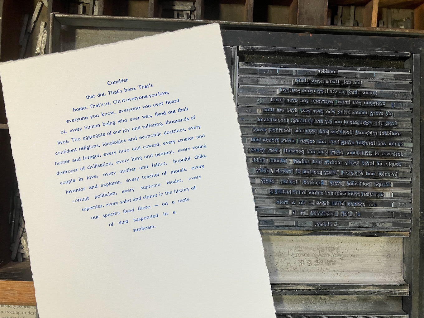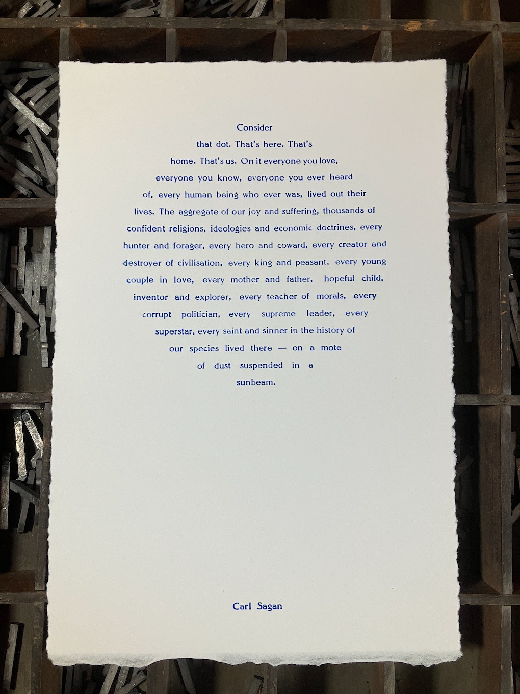 In 1990, just before the Voyager I spacecraft left our solar system and before it turned off its cameras, it was turned to take a final photograph of the Earth, as seen from a distance of 3.7 billion miles, from where it appears as just a tiny, almost invisible speck in deep space. The is part of Carl Sagan’s commentary on the photograph, printed as a blue circle. I originally printed this in 2023 but the original run of 40 prints sold, so I made a reprint.