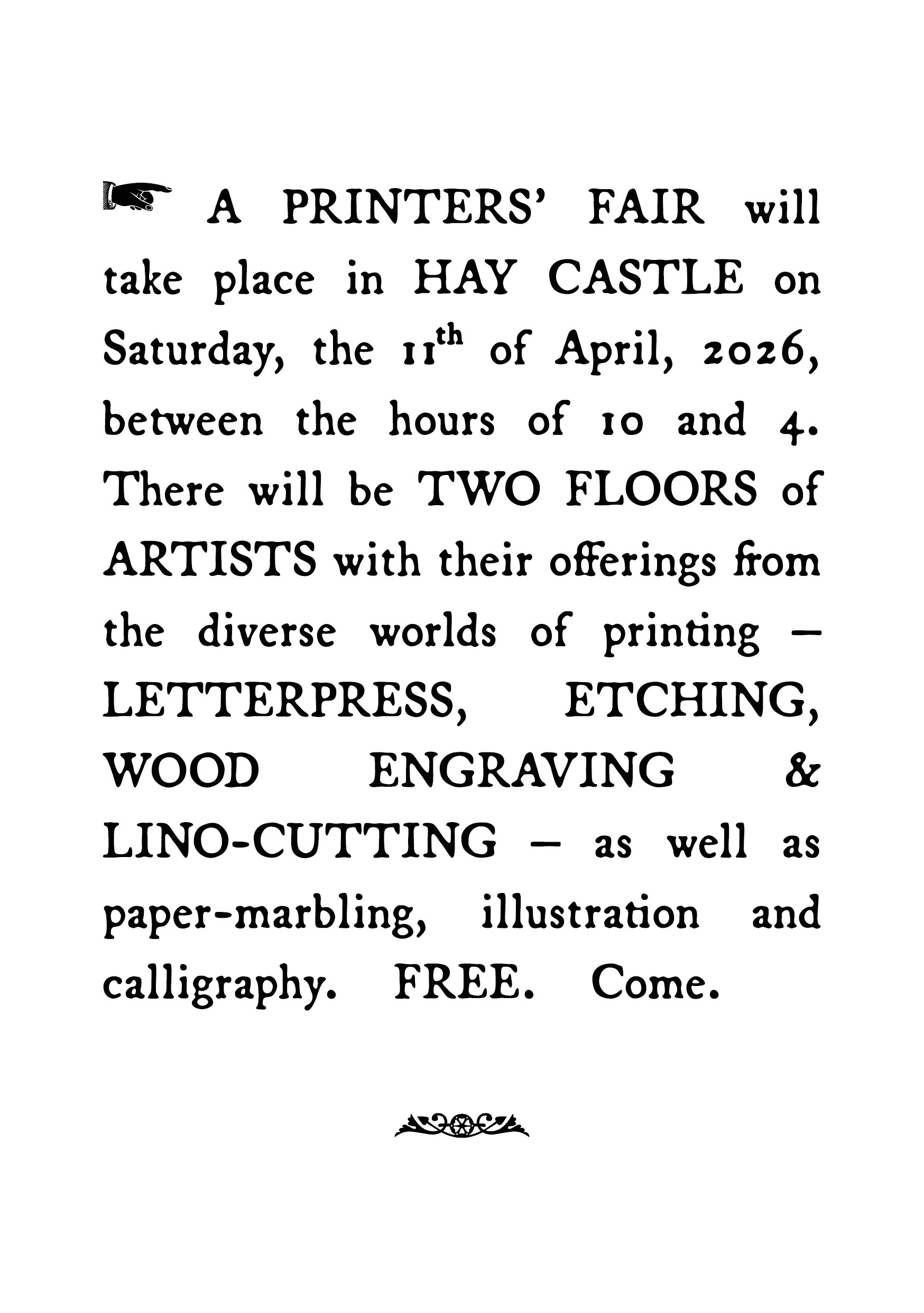 Exactly as it says in the flyer above. There will be 16 stalls across two floors of the Castle with a selection of printers in various disciplines offering their wares for sale.