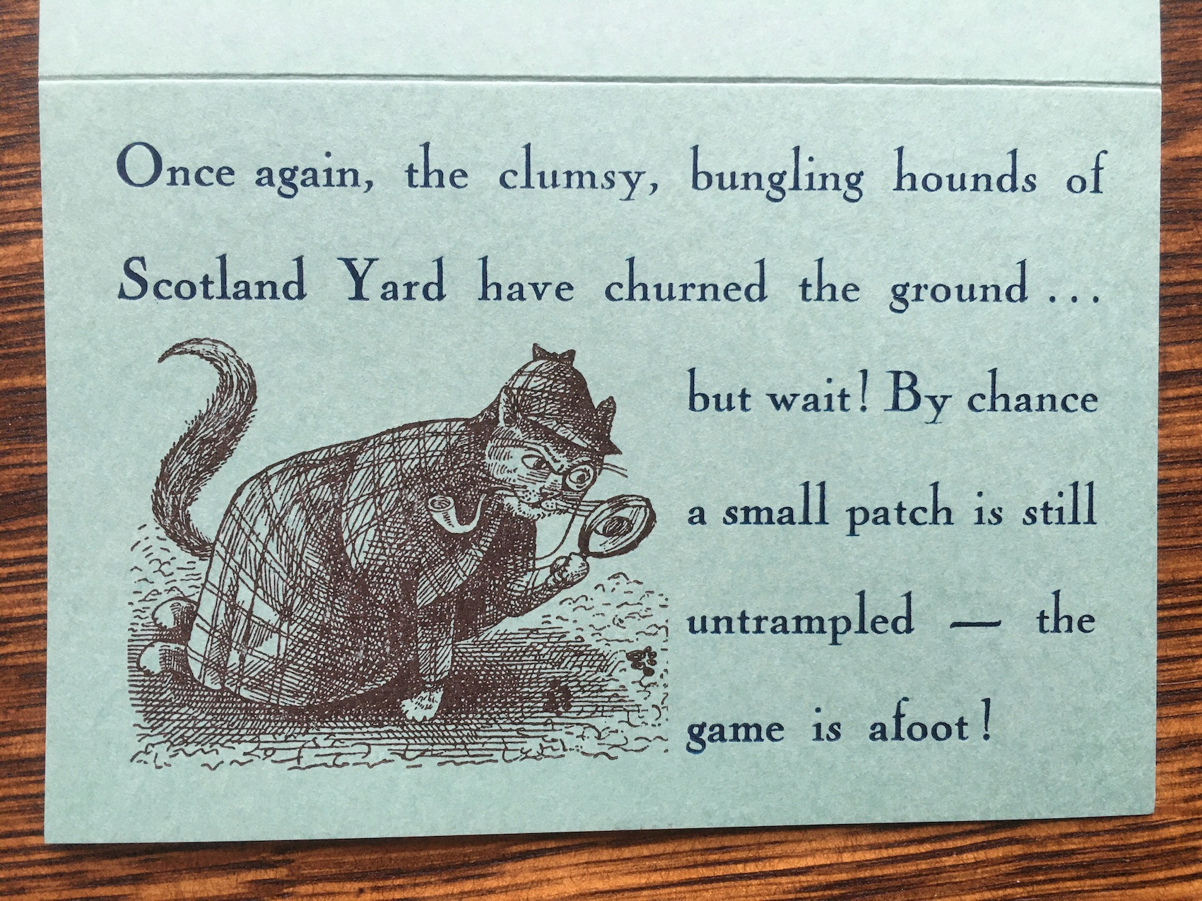 I came upon a letterpress block of a cat dressed as Sherlock Holmes, with deerstalker, cape and pipe and concocted some cod Conan Doyle apposite to the image. The blue and green of the cards are as close as I could find to the colours of the original Strand Library editions of Conan Doyle's Adventures and Memoirs of Sherlock Holmes. They're not quite it but they nod in that direction.