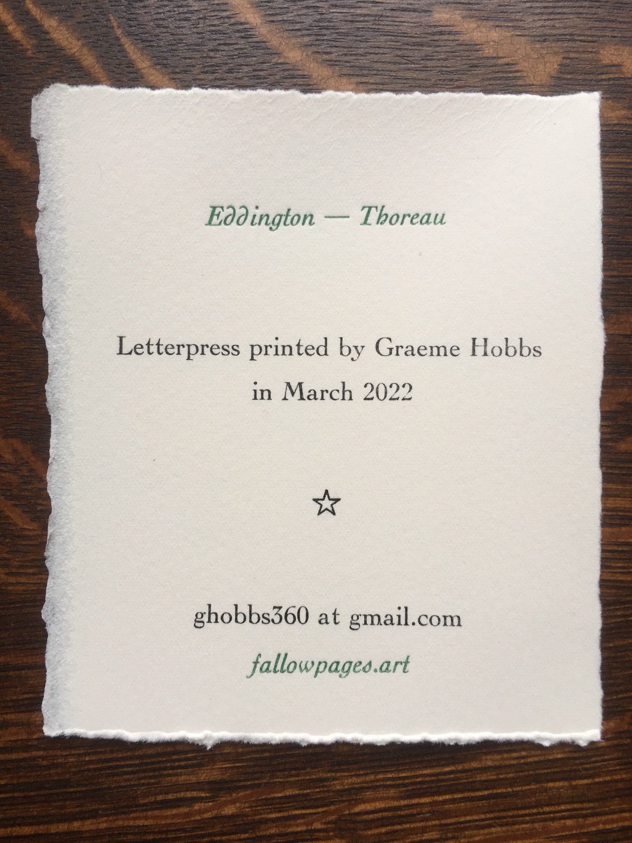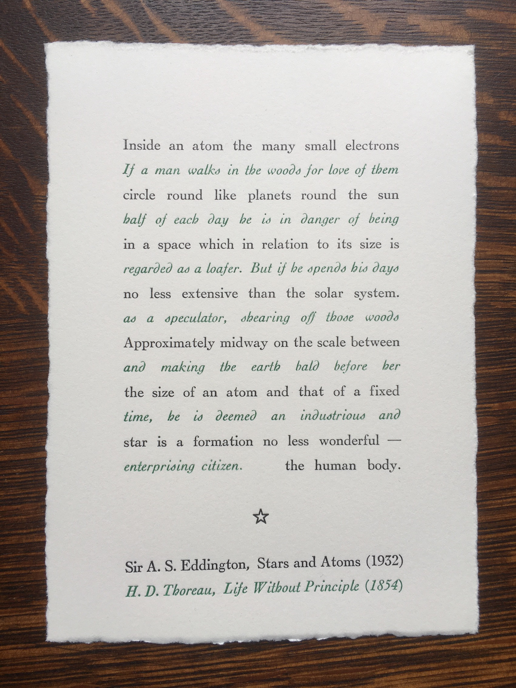 Two quotes, one from H.D. Thoreau, the other from A.S. Eddington, printed – not inappropriately I think – separately but together on the page. I had already printed a card to a similar design but this print is on 300gsm Somerset paper and features the credits on the front, along with a nicer star. 24 copies.