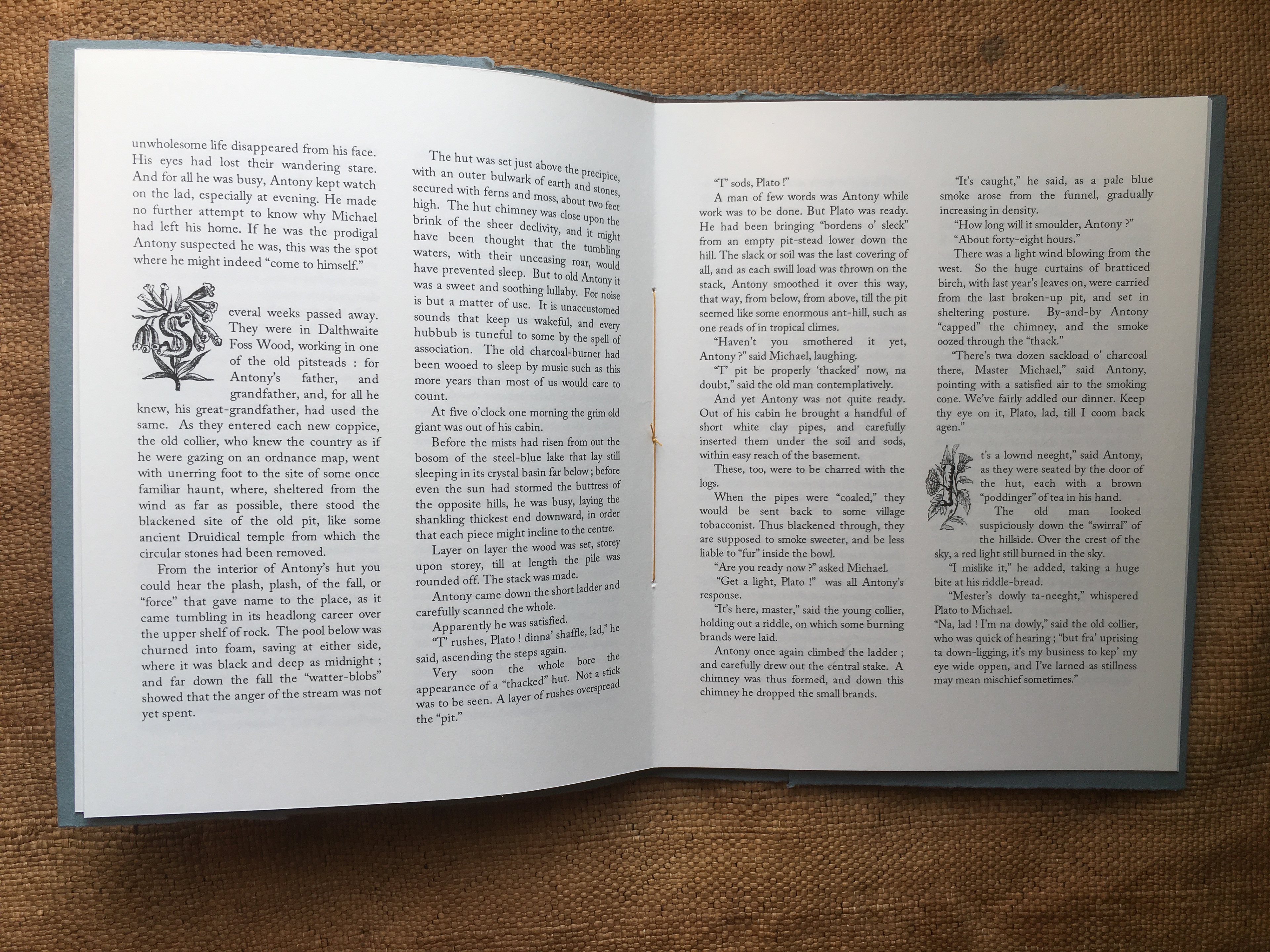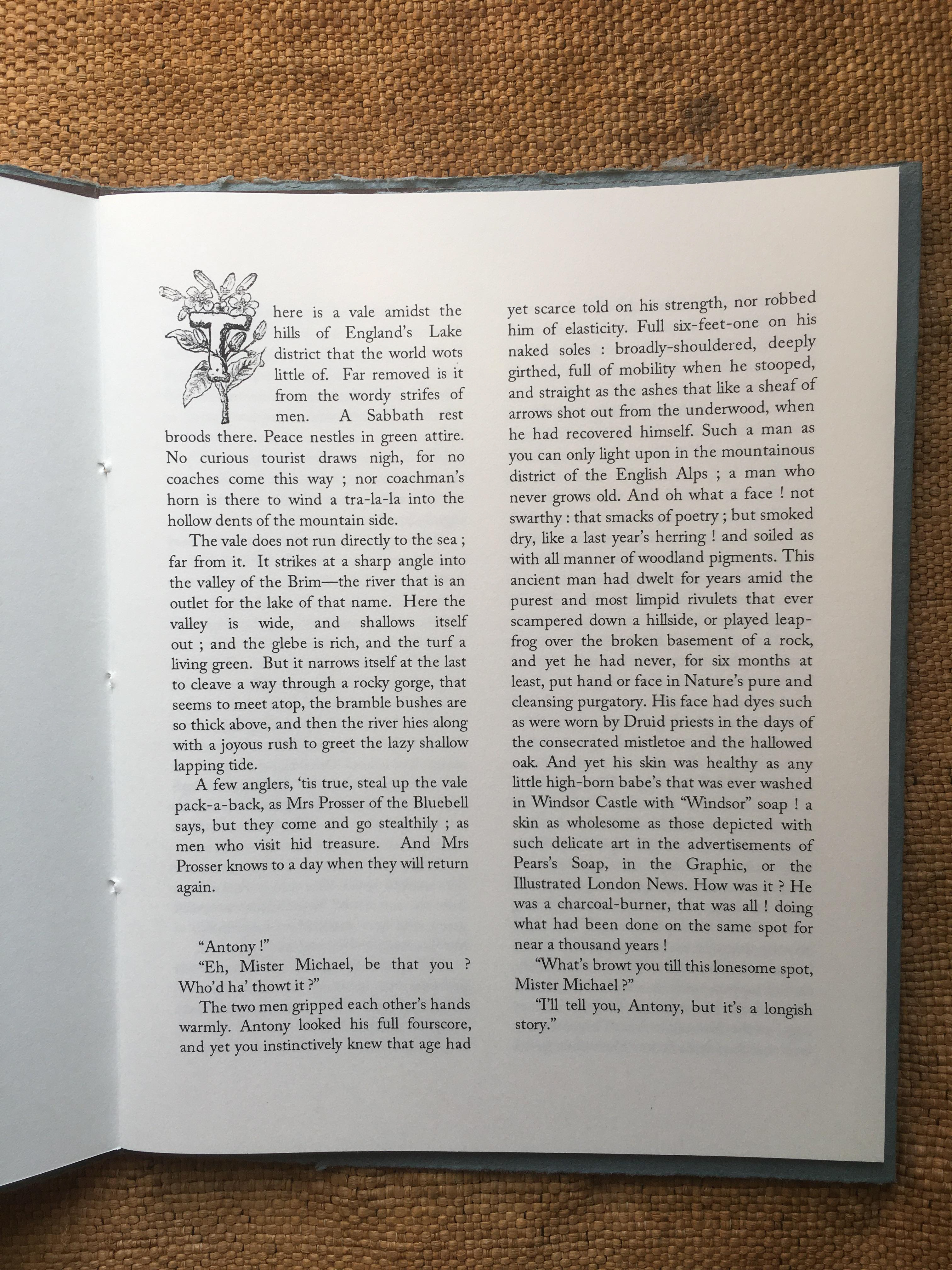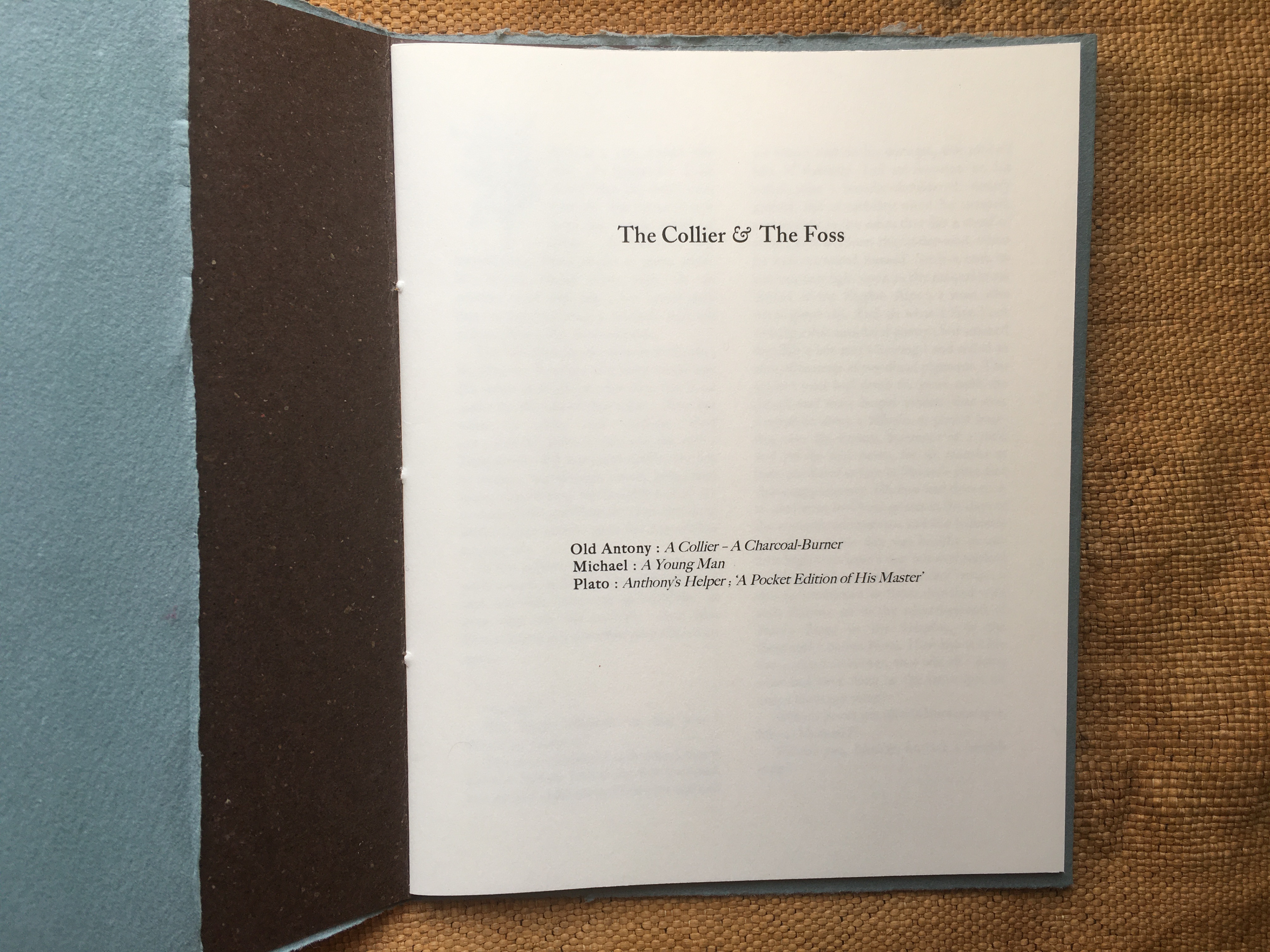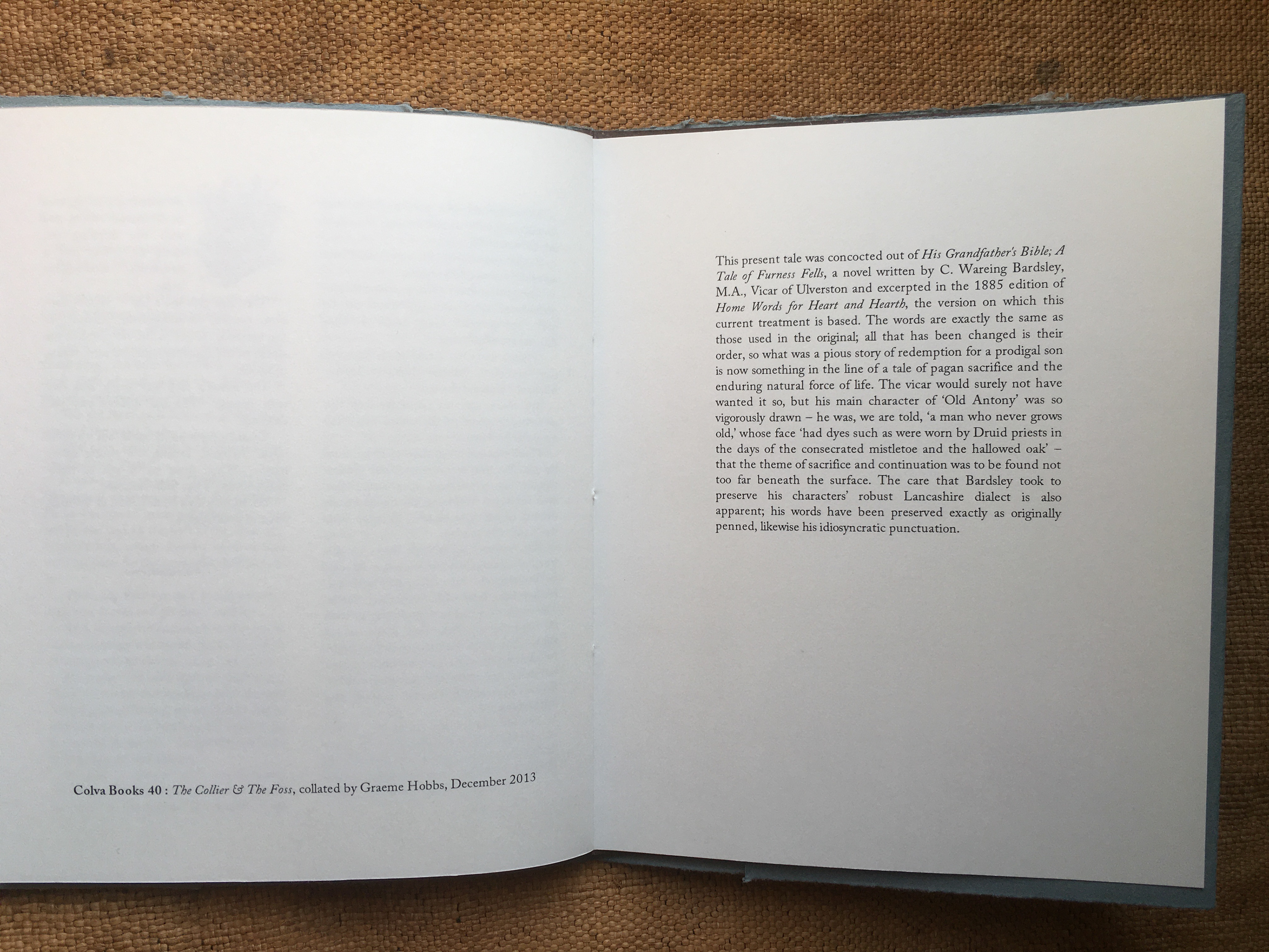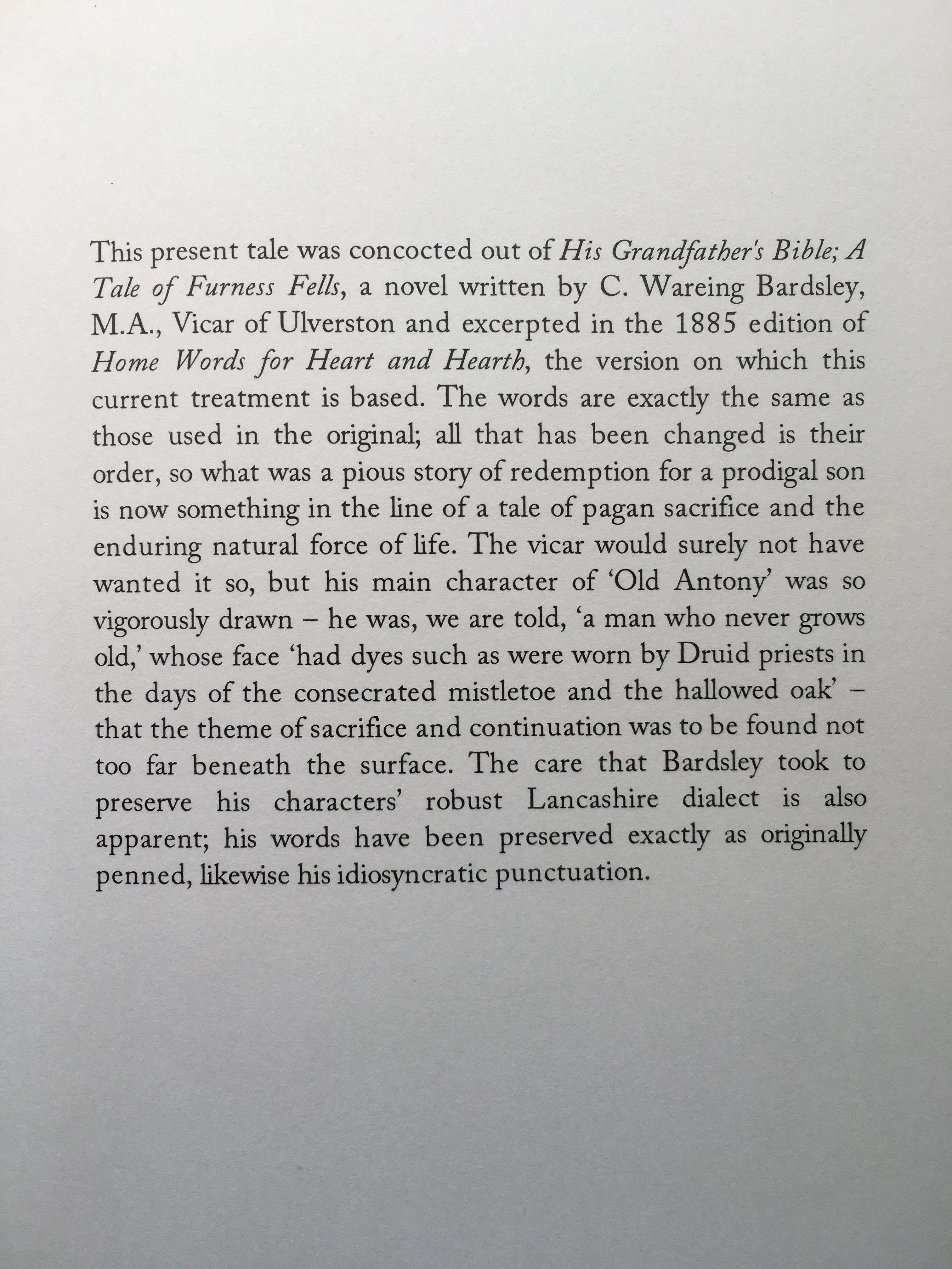 This tale was concocted out of His Grandfather's Bible; A Tale of Furness Fells, a novel written by C. Wareing Bardsley, M.A., Vicar of Ulverston and excerpted in the 1885 edition of Home Words for Heart and Hearth, the version on which this current treatment is based. The words are exactly the same as those used in the original; all that has been changed is their order, so what was a pious story of redemption for a prodigal son is now something in the line of a tale of pagan sacrifice and the enduring natural force of life. The vicar would surely not have wanted it so, but his main character, the charcoal burner ‘Old Antony’, was so vigorously drawn – he was, we are told ‘a man who never grows old’ and whose face ‘had dyes such as were worn by Druid priests in the days of the consecrated mistletoe and the hallowed oak’ – that the theme of sacrifice and continuation was to be found not too far beneath the surface. The care that Bardsley took to preserve his characters’ robust Lancashire dialect is also apparent; his words have been preserved exactly as originally penned, likewise his idiosyncratic punctuation. Sewn booklet with hand-coloured lettering on wrappers, December 2013.