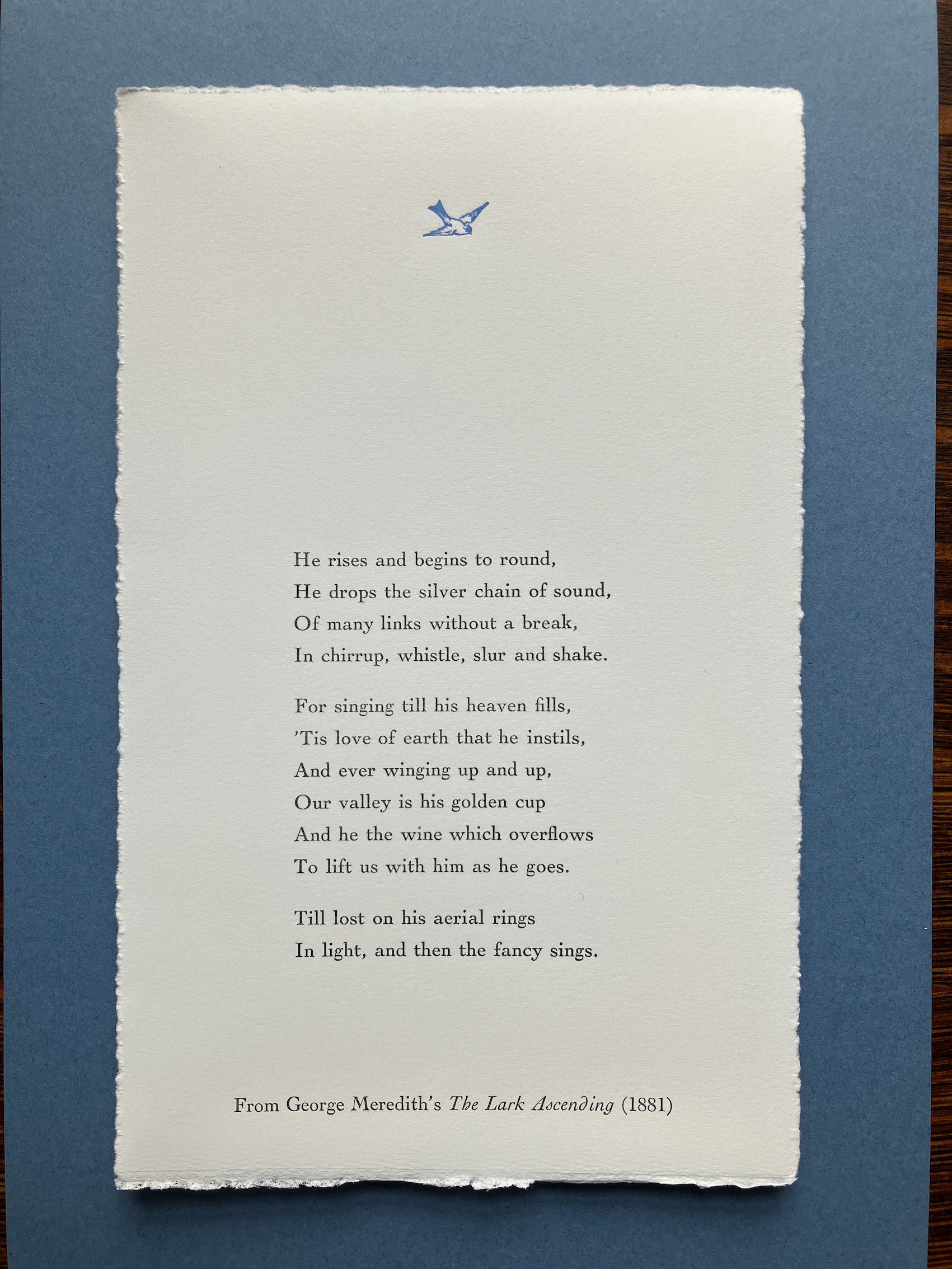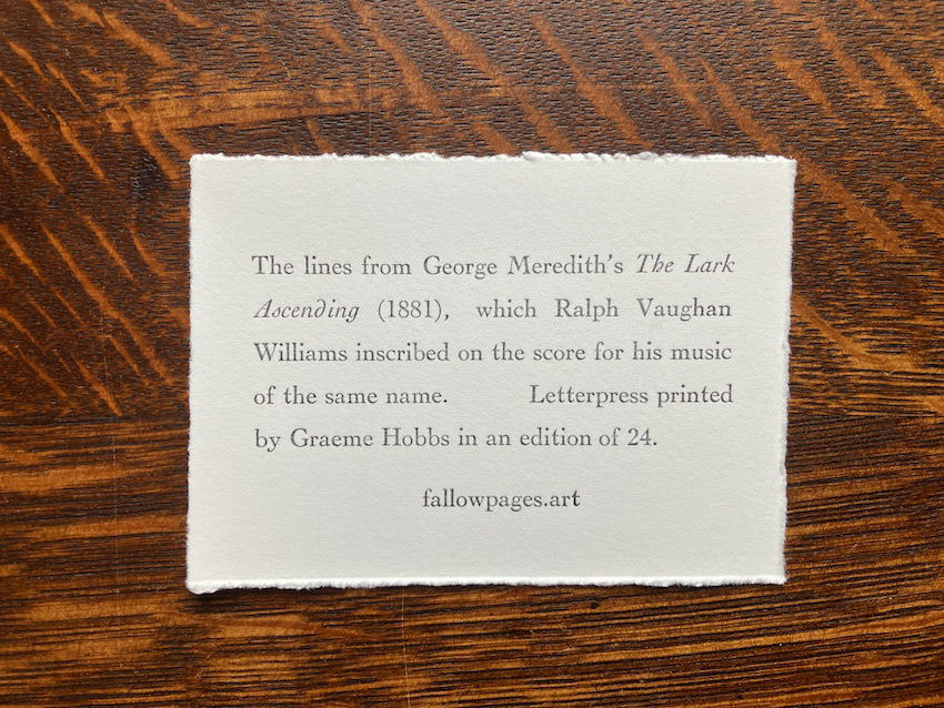The twelve lines from George Meredith’s ‘The Lark Ascending’ (1881) which Ralph Vaughan Williams inscribed upon the score for his music of the same name. Printed on 250gsm paper in an edition of 40.