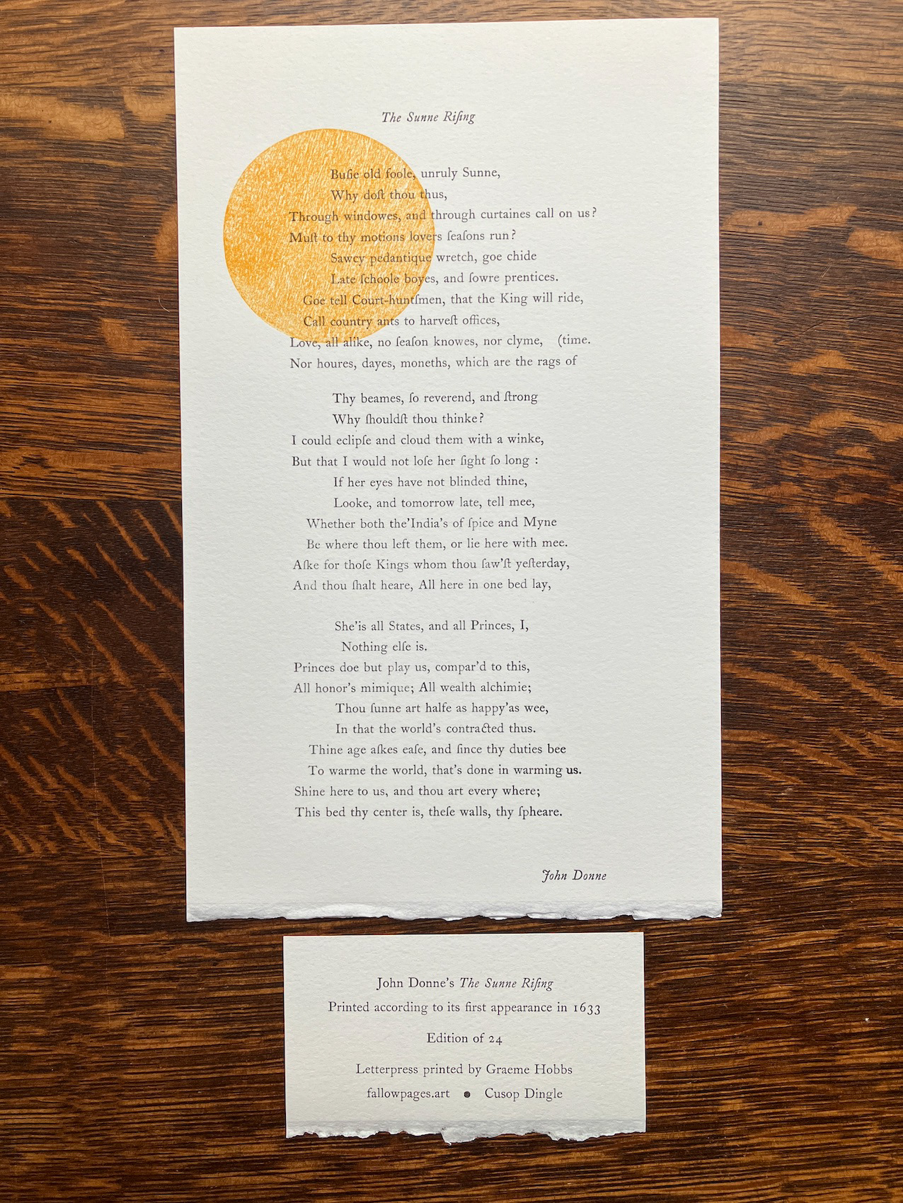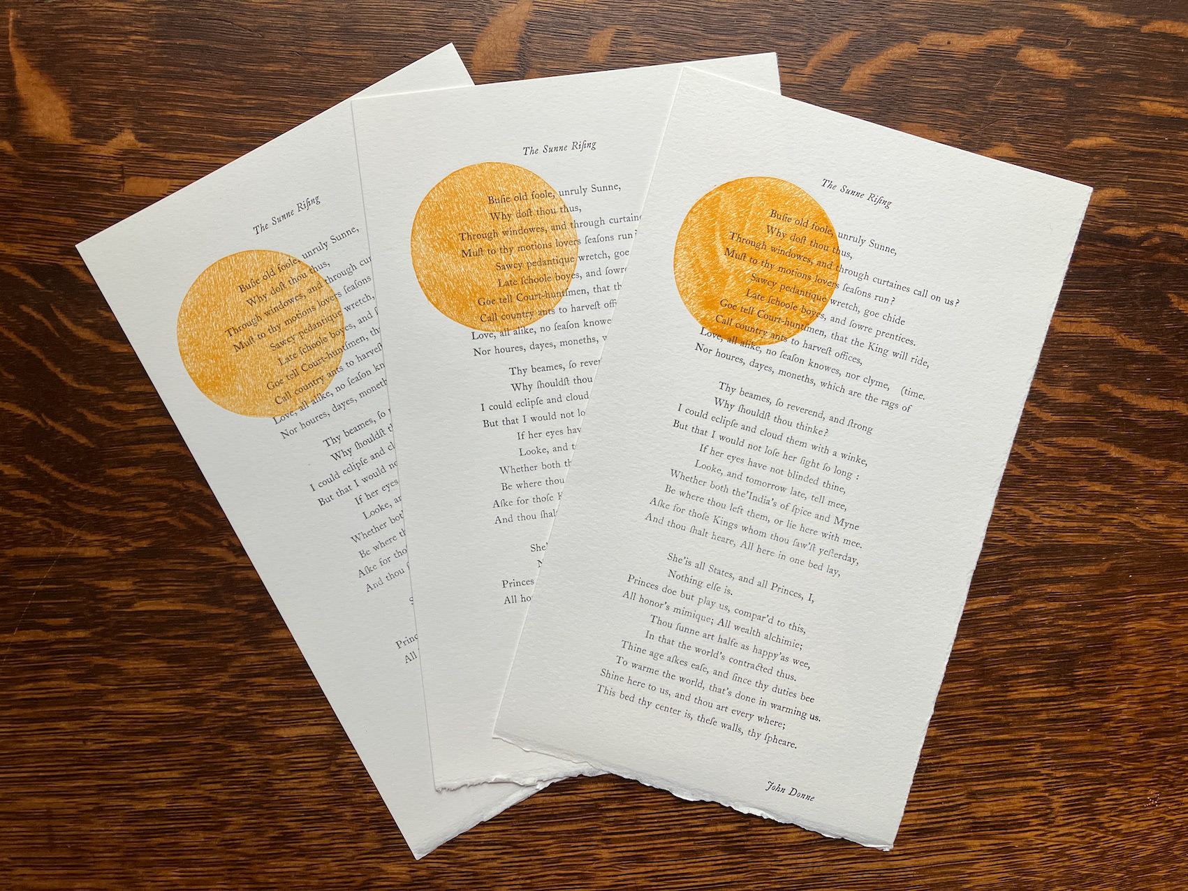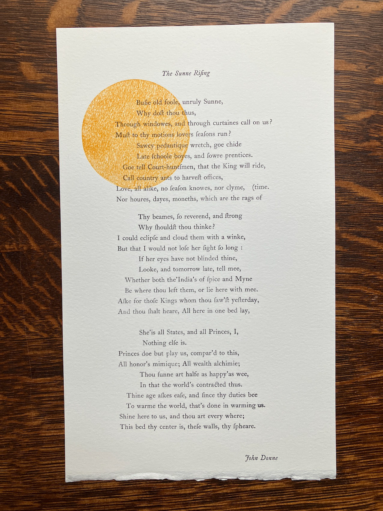 John Donne's The Sunne Rising, printed according to its first appearance in the 1633 edition of his poetry, complete with long-s and ligatures and a big bright sun. Edition of 24 printed on Arches Velin paper.