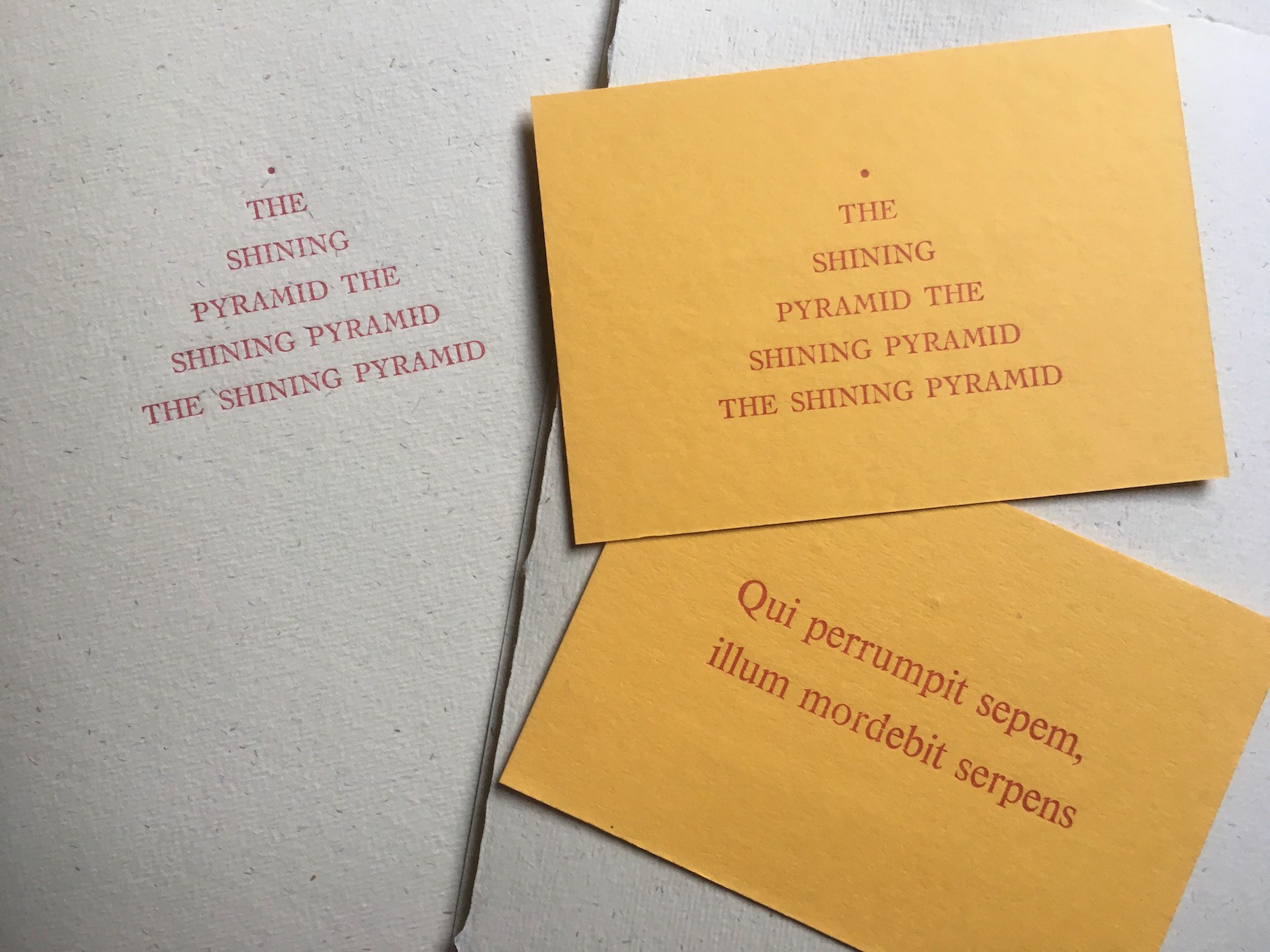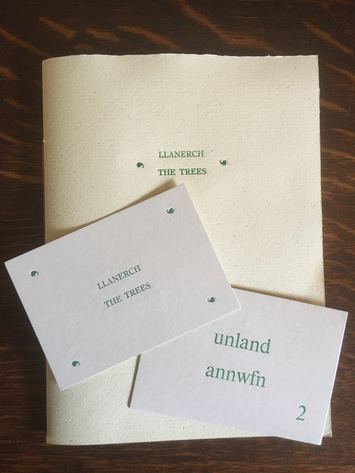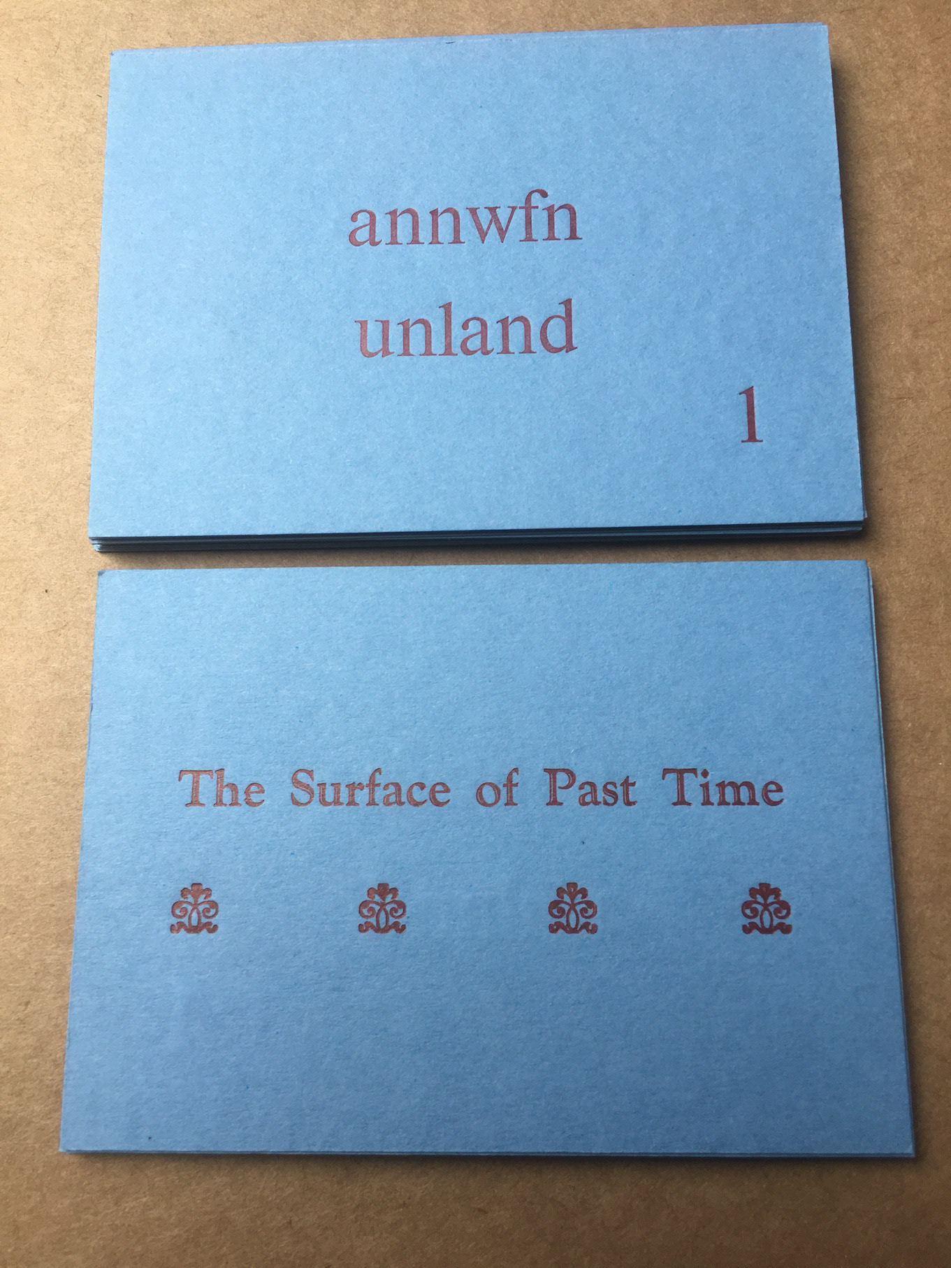The design and layout for three booklets, hand-sewn, with letterpress printed covers, plus card tokens, to accompany the limited edition cassette releases, compiled by Dafydd Roberts (Listen to the Voice of Fire) for his ‘Anglo Welsh supranatural field research project’ Unland/Annwfn, of music evoking the ‘tortuous and hallowed margins of an imaginal Wales’. The booklets are: Llanerch The Trees, The Shining Pyramid, and The Surface of Past Time. More about all of these releases and more can be found at: https://listentothevoiceoffire.bandcamp.com