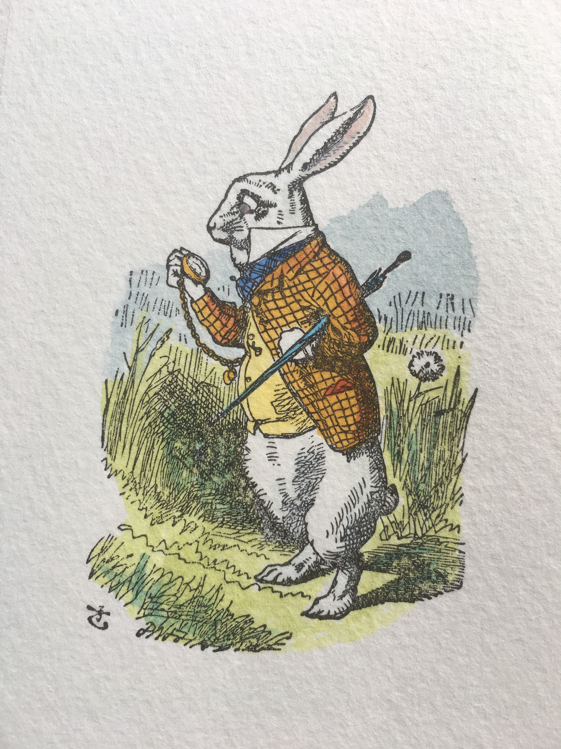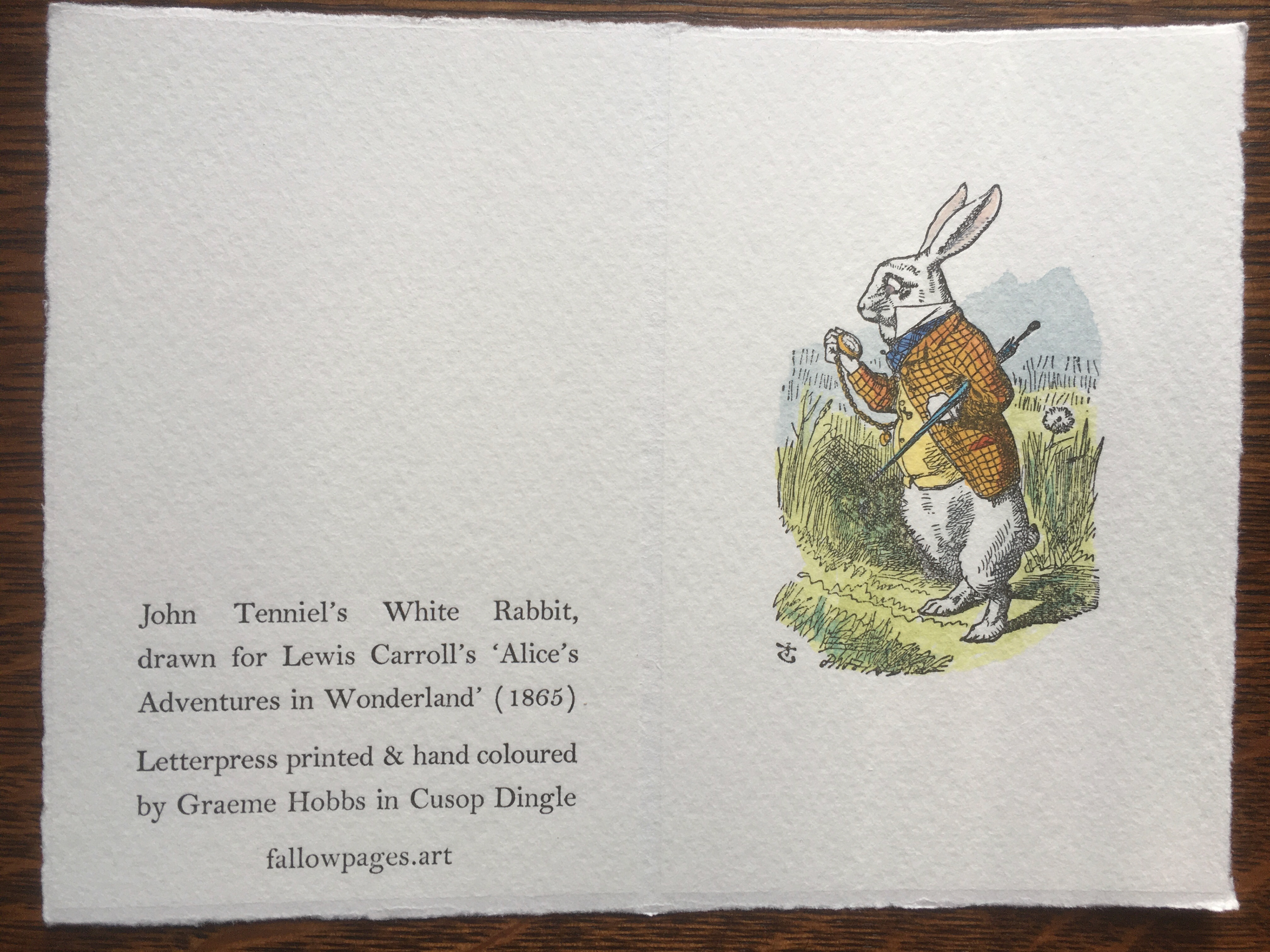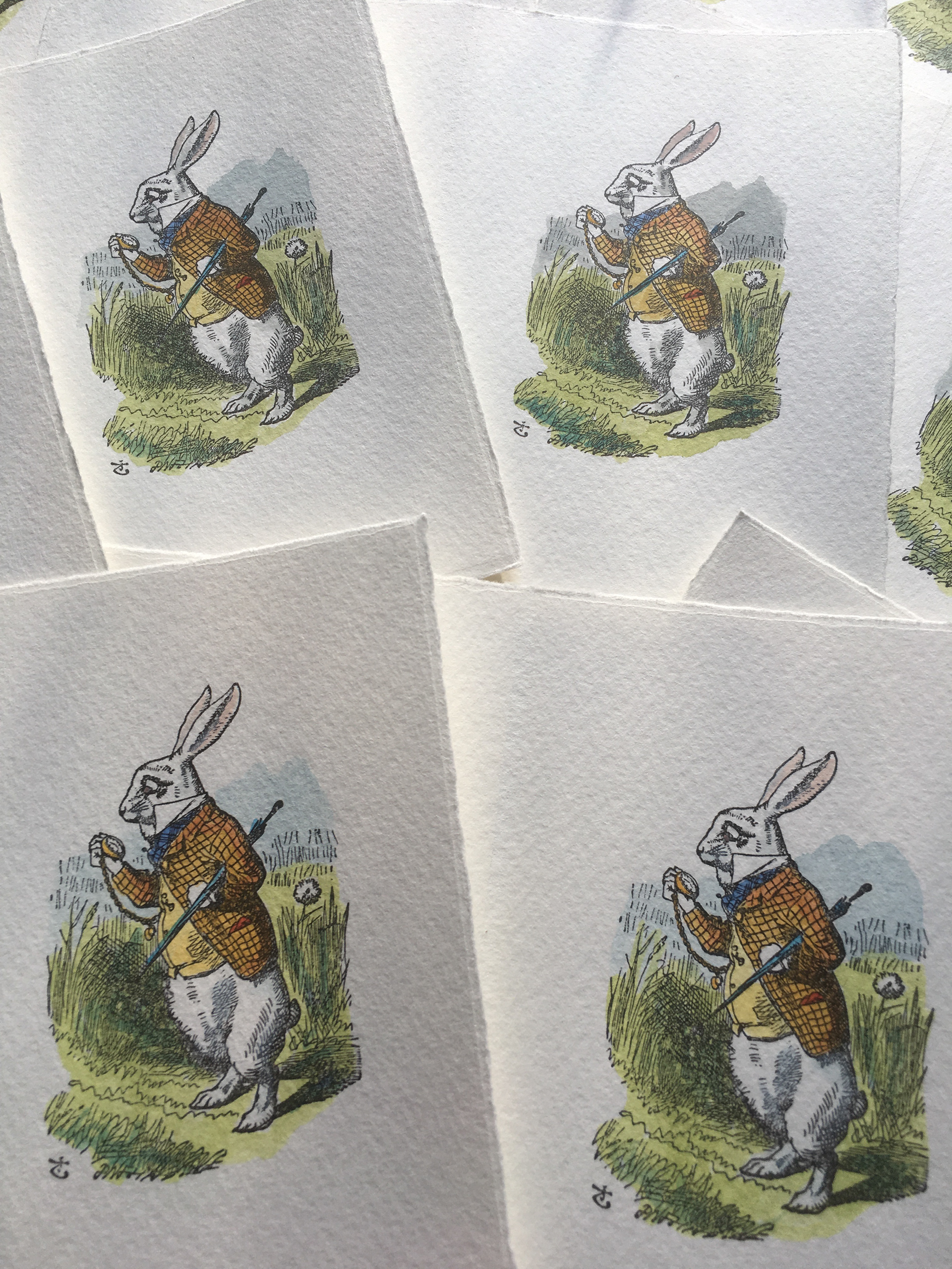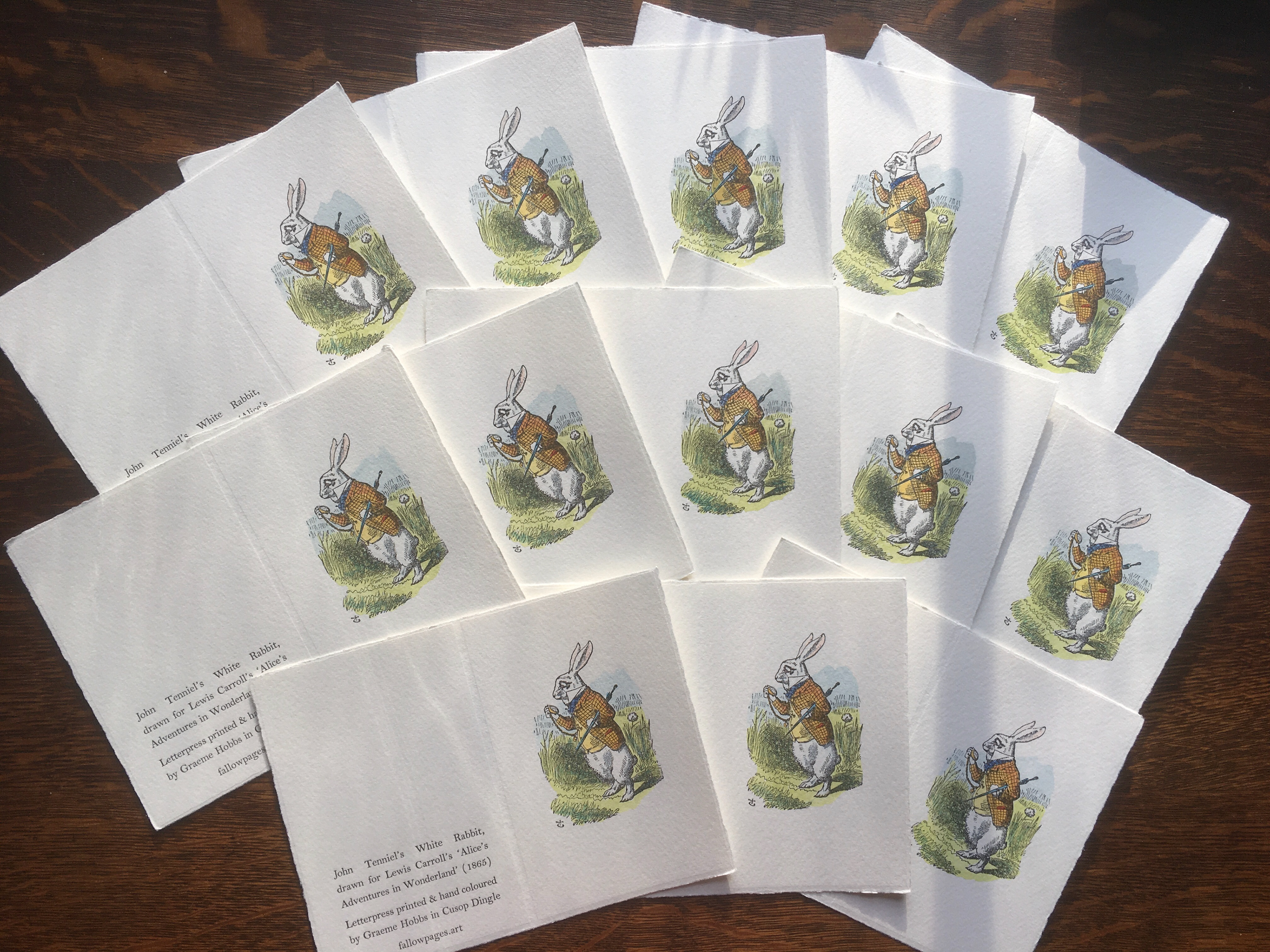 Letterpress printed, hand-coloured cards of John Tenniel's White Rabbit, printed on Fabriano Medioevalis paper.