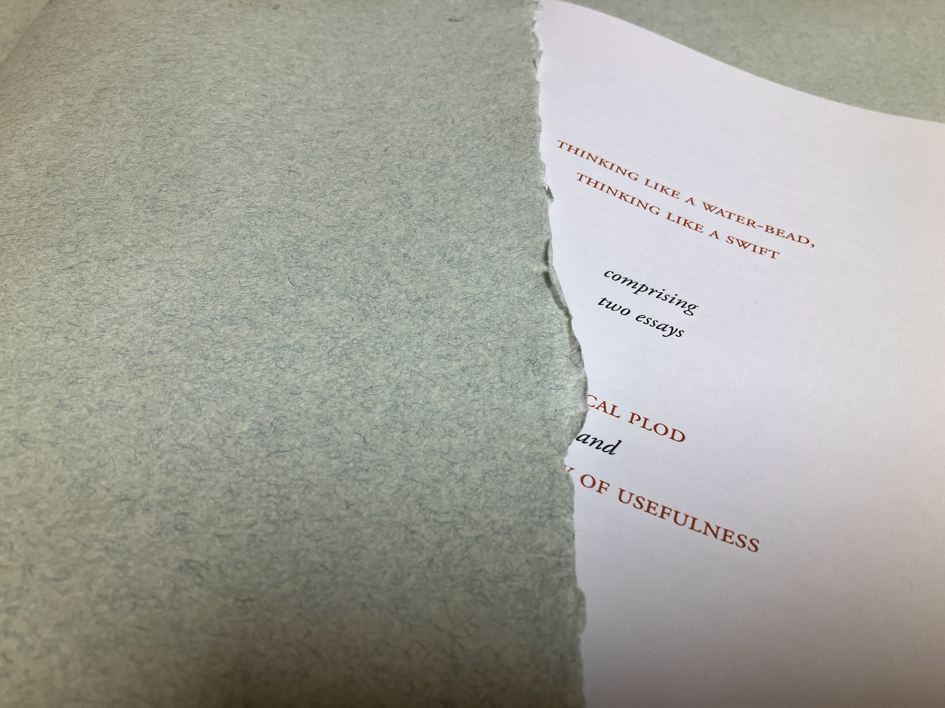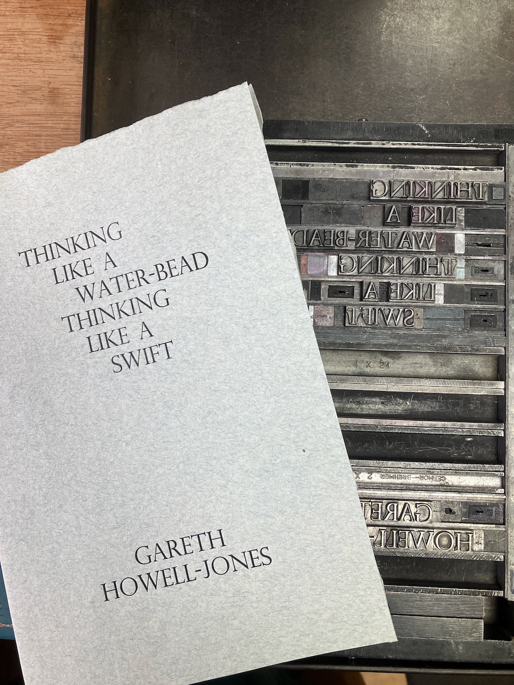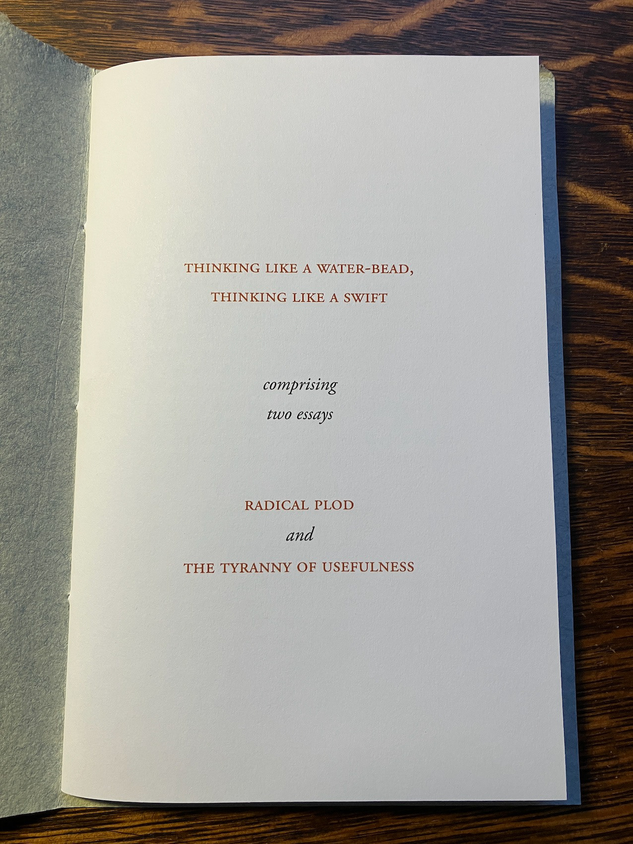 A pairing of Gareth Howell-Jones' essays, 'Radical Plod' and 'The Tyranny of Usefulness', bound up as a hand-sewn, limited edition chapbook with a letterpress printed cover. There are 53 copies in total, and the cover paper is Ruscombe Mill's Turner Blue, a hand-made based on watercolour paper that Turner used in the 1810s. It can be bought from Gareth's site, here.