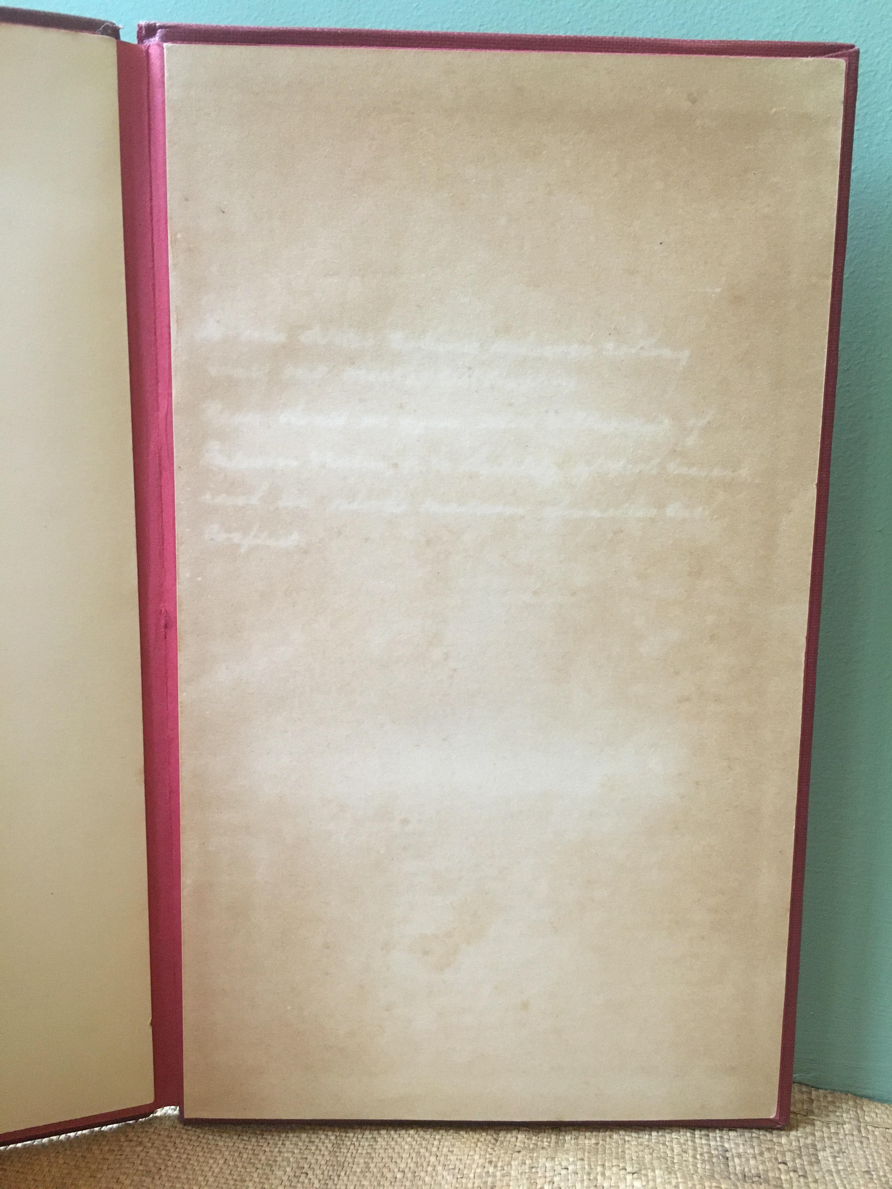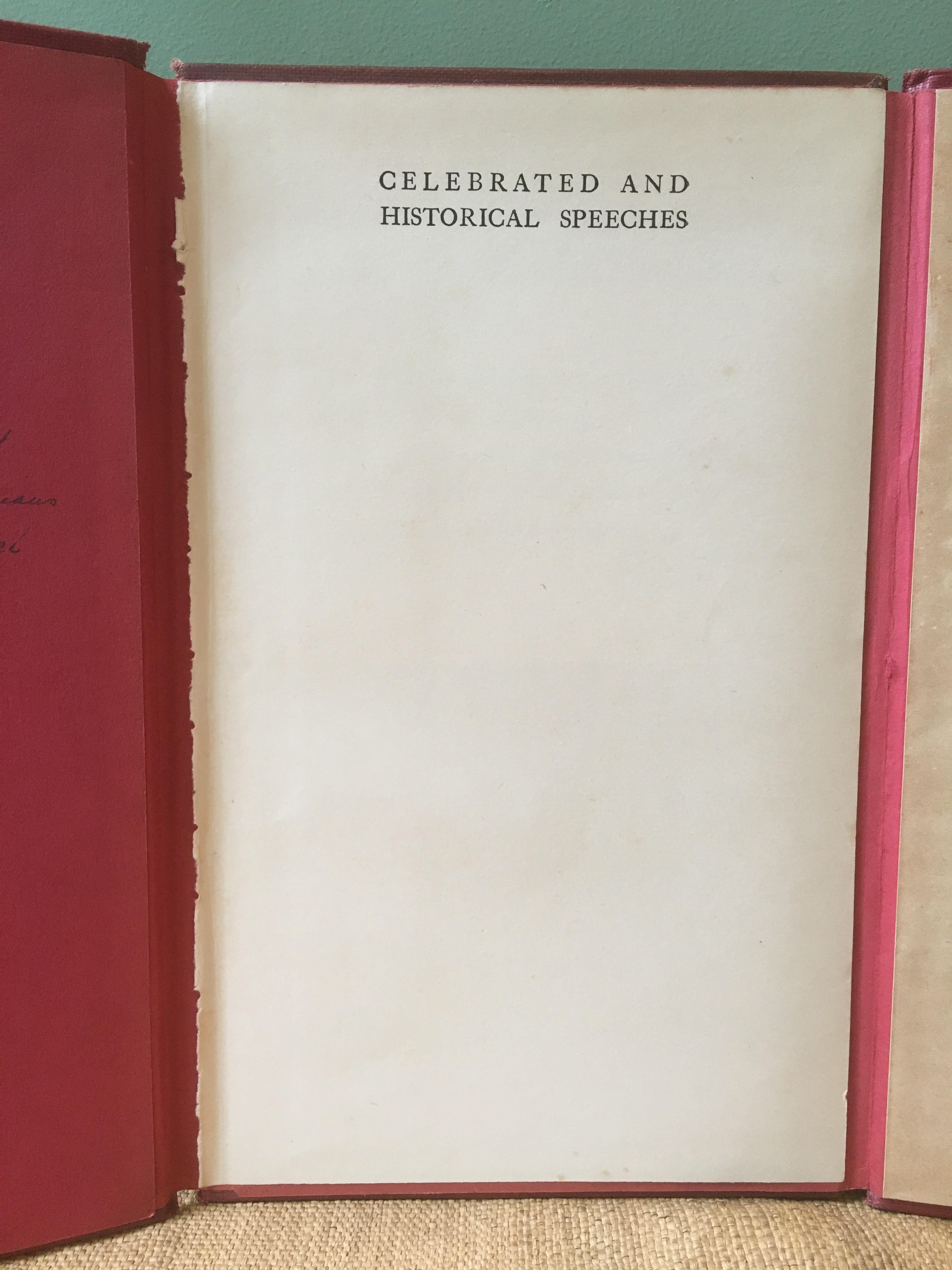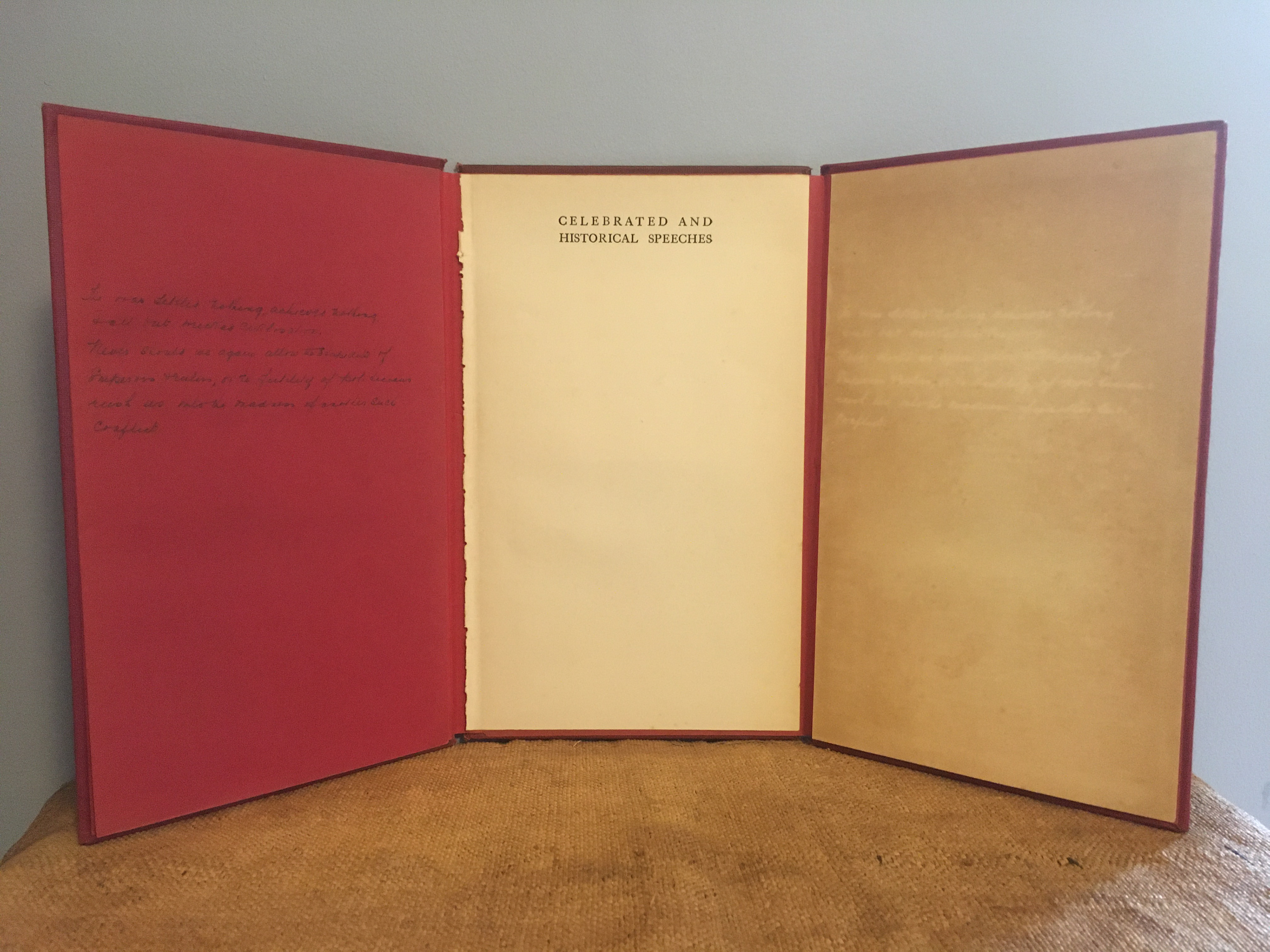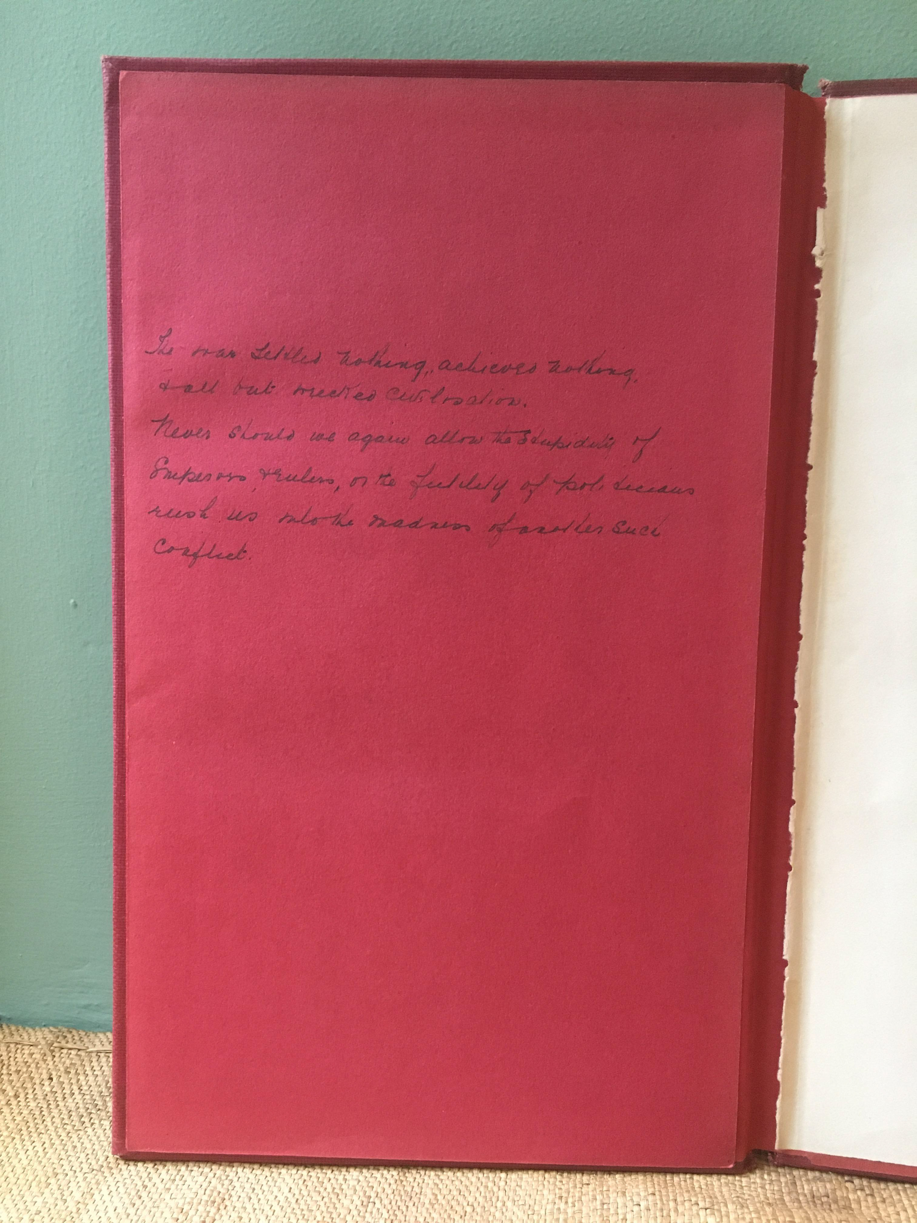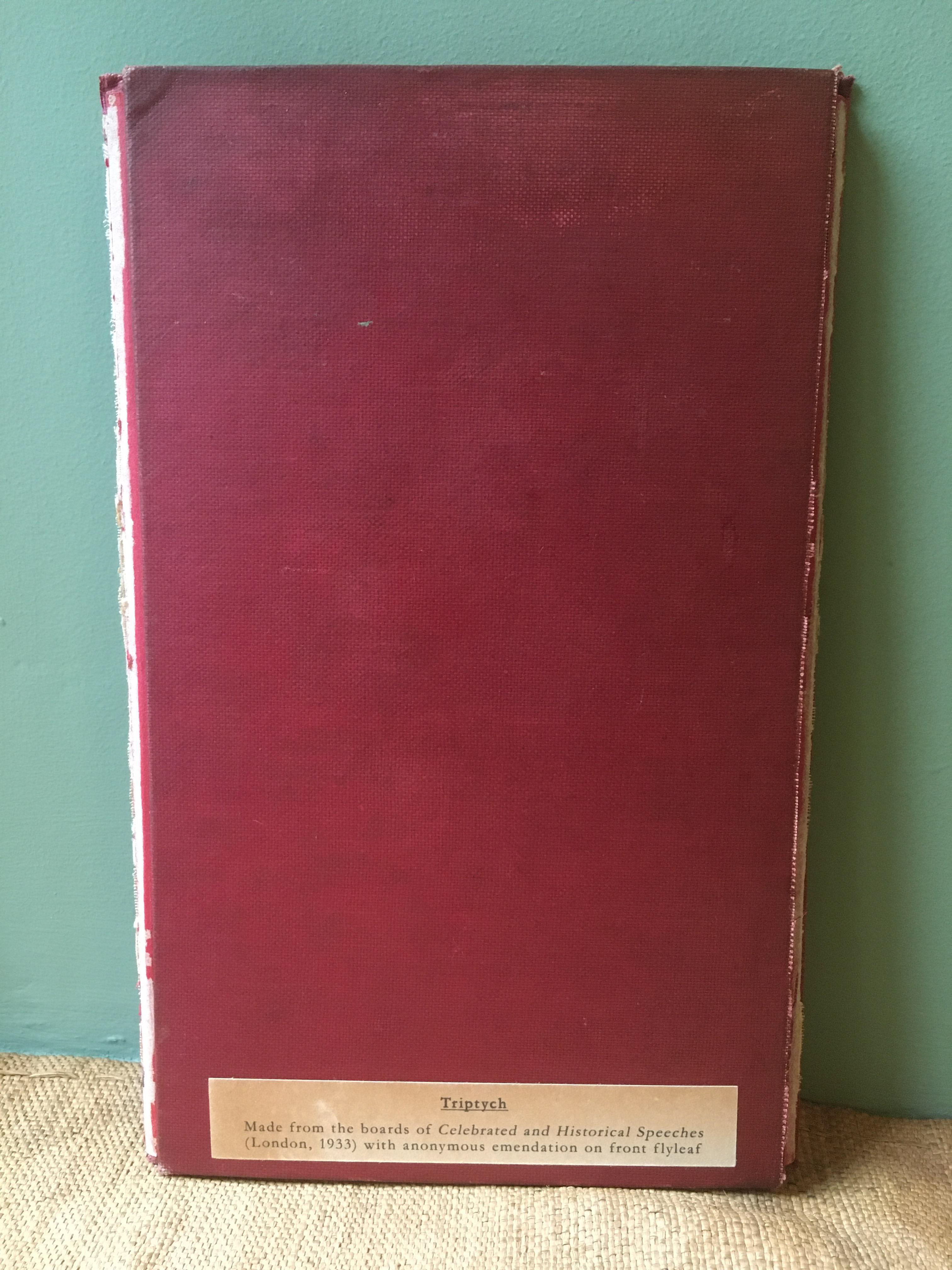 A copy of ‘Celebrated and Historical Speeches,’ printed in London in 1933, revealed on the front flyleaf an anonymous inscription from the book’s sometime owner, which read, ‘The war settled nothing, achieved nothing. & all but wrecked civilisation. Never should we again allow the stupidity of Emperors, & rulers, or the futility of politicians rush us into the madness of another such conflict.’ The inscription was made all the more poignant by the fact that it had bled through and made a negative impression, a sort of radioactive afterimage, in white on the following blank page. I sourced another copy of the book and made a triptych from three of its boards, with the emendation and its afterimage making up the side panels and the book’s half-title the centre. The remainder of the book, with its thousands upon thousands of words, from rulers, monarchs, statesmen and politicians, was removed. Made in 2015.