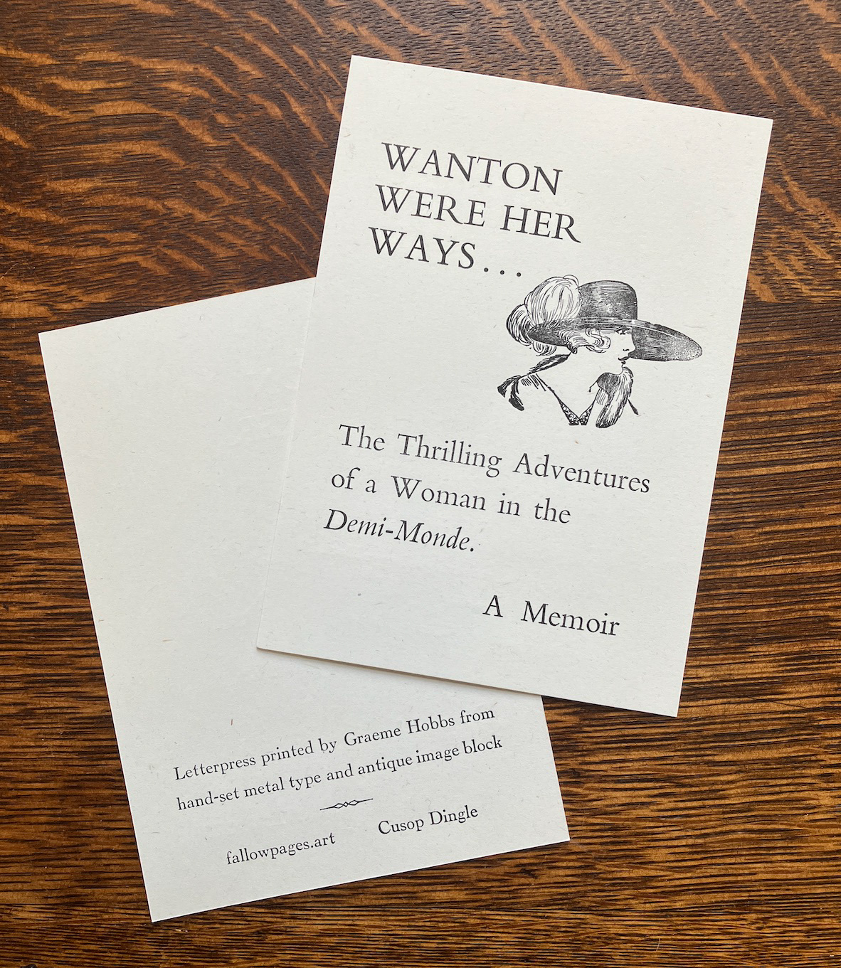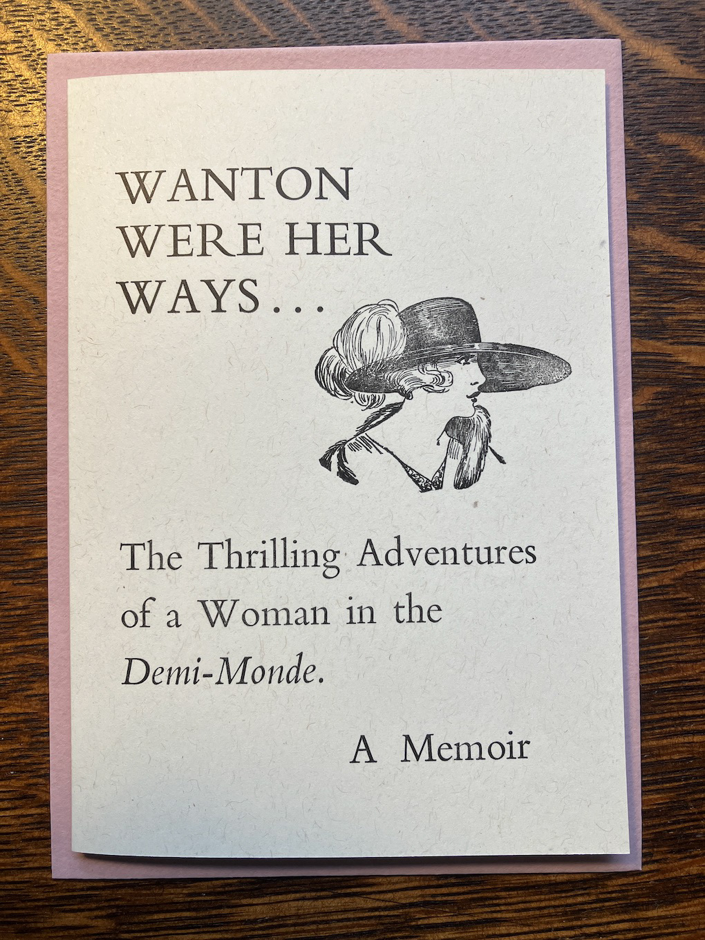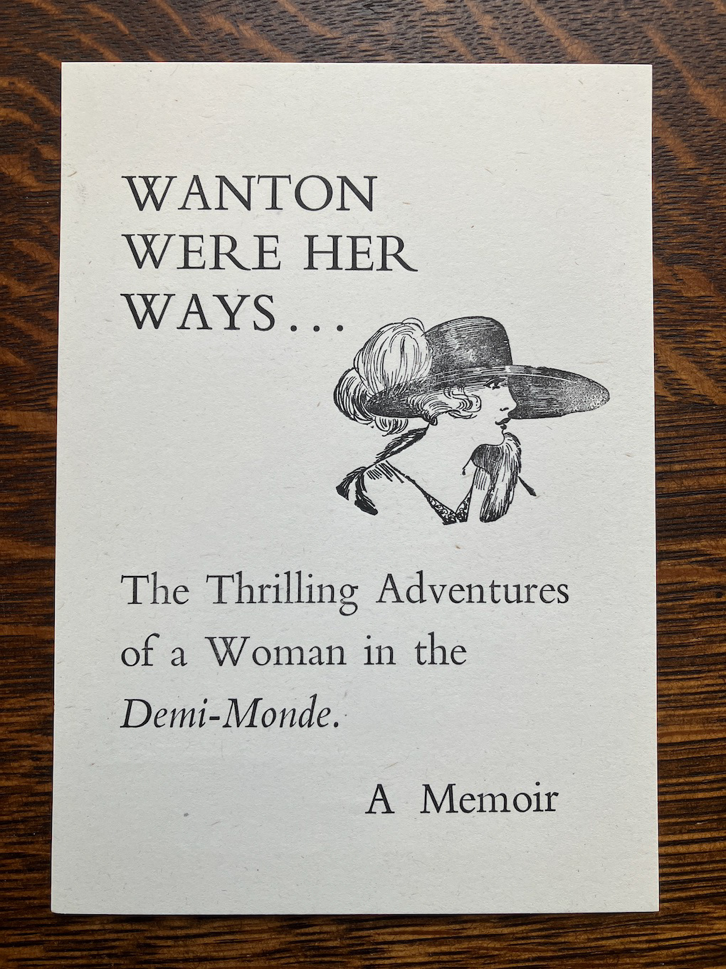 I needed a title to accompany this marvellous old block of a woman wearing a hat, possibly from the 1910s, and came up with 'Wanton were her Ways'. I assumed there would have been a book published under that title at some point in the past but a cursory search reveals none.