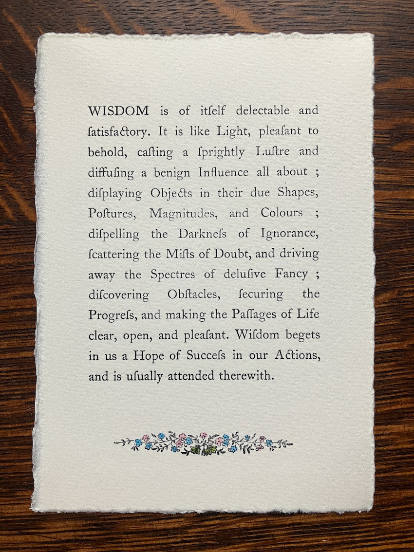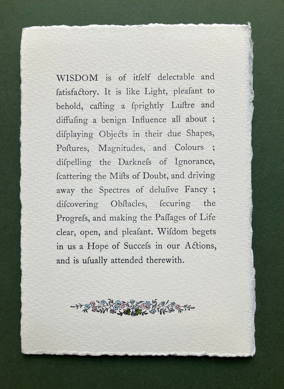 As with my print of John Donne’s ‘No Man is an Iland’, WISDOM is typeset and printed in 12 point Caslon, with long-s variations and ligatures. The words are drawn from a book I came across in Hay market one day, entitled, ‘The Preceptor : A General Course of Education wherein the First Principles of Polite Learning are laid down in a Way most suitable for trying the Genius, and advancing the Instruction of Youth’ (1775). The print features a little hand-colouring in the flowers.